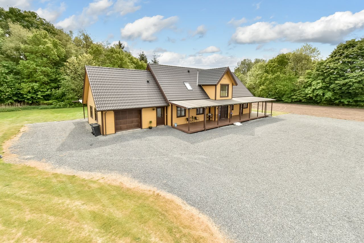 Velkommen til denne imponerende villa, der kombinerer klassisk bjælkehusstil med moderne komfort. Med et rummeligt boligareal på 256 m2 fordelt på 2 plan, er denne bolig klar til den store familie. Ejendommen er opført i 2007 og fremstår helt indflytningsklar. Bjælkehuset præsenterer sig smukt med de sorte tagsten og en charmerende veranda, der omkranser huset og inviterer til hyggelige stunder udendørs.