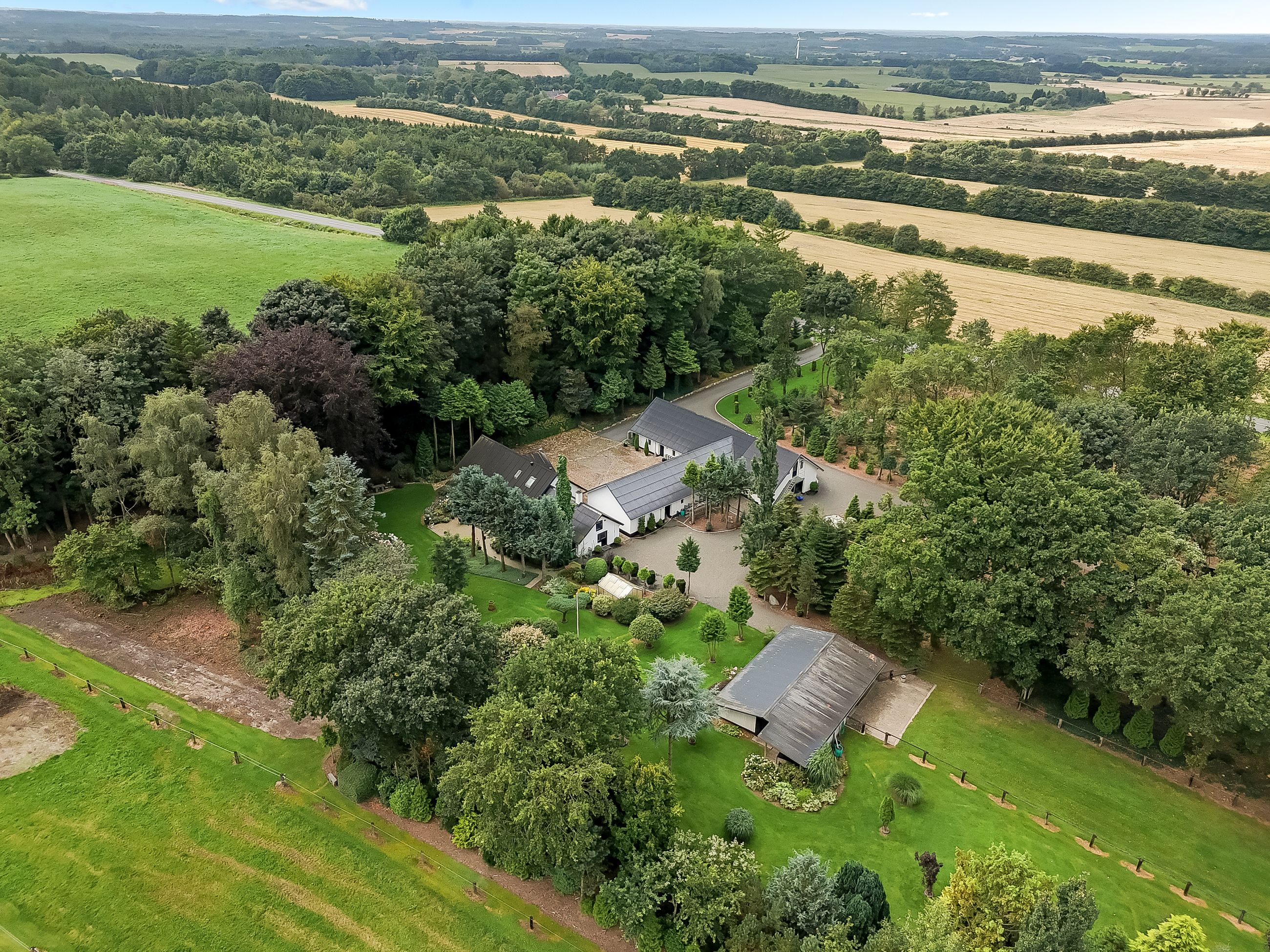 Jorden til ejendommen er delvis bortforpagtet for et år ad gangen, hvilket giver fleksibilitet og mulighed for indtægt. De naturskønne omgivelser omfatter marker, folde, søer, skov og beplantning i kuperet terræn. Det skaber en idyllisk ramme omkring ejendommen. Her kan man nyde den friske luft og de åbne vidder, samtidig med at man bor i gåafstand til både skole, by og tog.