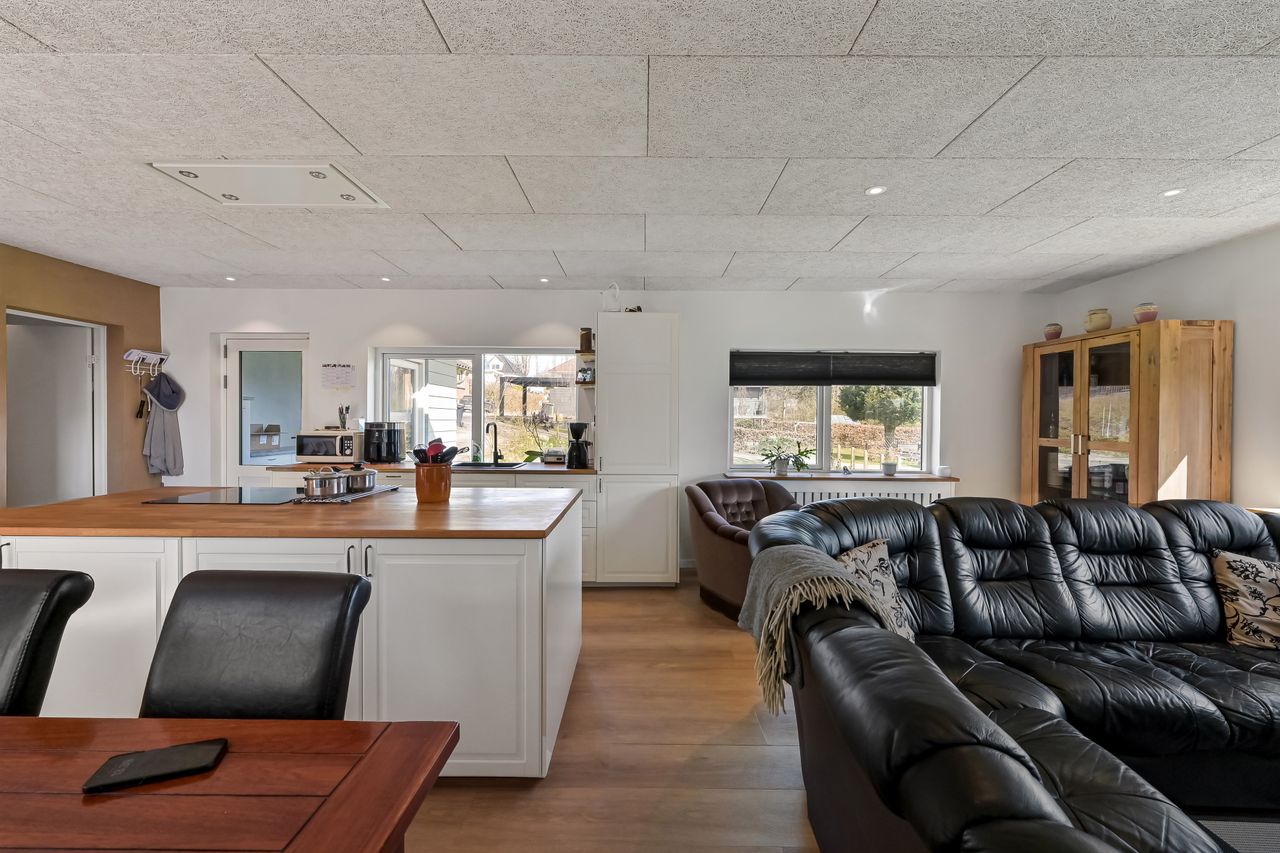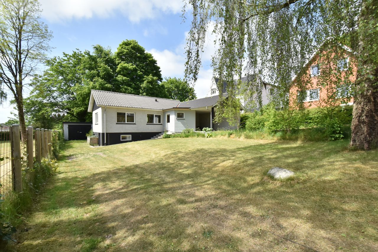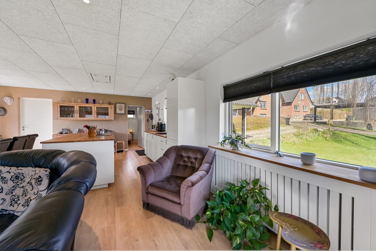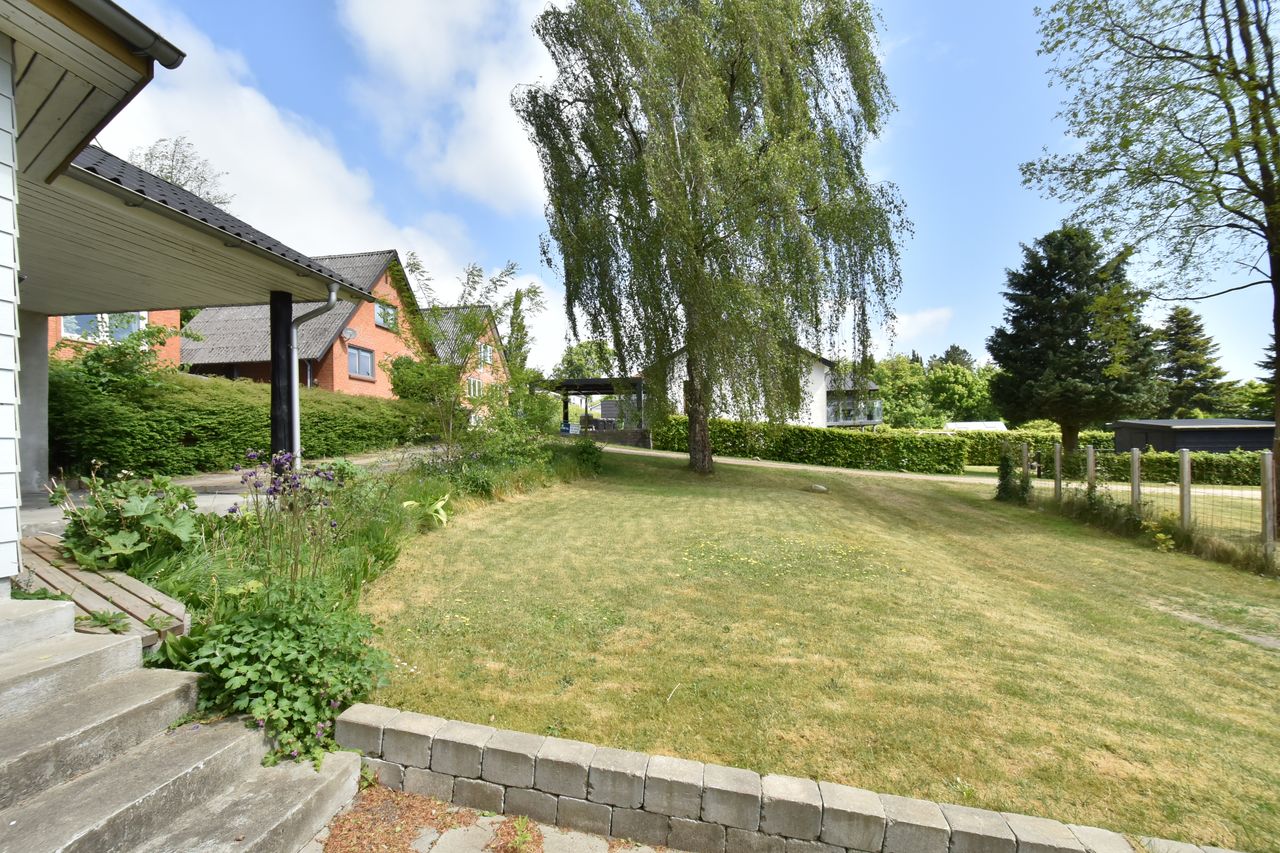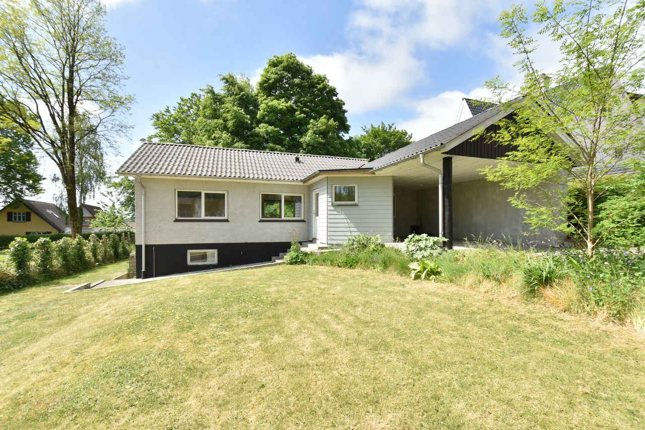 I blandt klassiske huse og etablerede haver, dukker dette fine og velholdte parcelhus op. Et hus med vandskurede facader, hvide vinduer og sorte inddækninger og tag, der samles i en harmonisk byggestil, huset er tilpasset et terræn i forskellige højder både ude og inde. Første møde med huset, er indkørslen, der ender ved huset i en carport, der let kan kombineres til en overdækket terrasse. Irisvej er en lille villavej i Give, nærmest bag midtbyen, som er attraktiv at bo på. Her har man en særdeles bynær beliggenhed, hvor der kun er 2 minutters gang til midtbyen, til togstationen, indkøbsmuligheder og specialbutikker. Endvidere er der kort afstand til Give Plantage og grønne områder. Indenfor i villaen oplever man, ligesom i det udvendige udtryk, et flot moderniseret hus, med lyse og indbydende materialer og detalje valg. Huset rummer blot 74 m2 beboelse, som er veludnyttet i alle funktioner. Huset er bygget i 1½ plan, med en kælder på 20 m2 indbygget under huset og i terrænet. Kælderen består af to disponible rum, som anvendes til vaskerum og depot. På husets stueplan findes selve boligen, hvor der er et stort, lyst og åbent rum, som kombinerer både køkken, alrum og stue i ét. Alt er moderniseret i 2021, med bl.a. flotte gulve, troldtekt lofter, hvide vægge og et charmerende køkken med integrerede hvidevarer. Fra alrummet, har man mod syd/vest terrassedør til haven, til en velanlagt åben træterrasse, hvor sommerdage med familie og venner kan nydes. Bagved alrummet fortsætter samme moderniserede stil i et dejligt soveværelse og et flot badeværelse, også moderniseret i 2021. Haven udenfor kan nemt laves helt privat og ugeneret. Man har store gamle træer nederst, der giver læ og liv bagerst, mens huset skærmer mod resten. Her er nem vedligeholdelse, med en stor græsplæne omkring huset, og hegn og hæk mod naboerne. Nederst i haven er der en garagebygning, som benyttes til værksted og redskabsrum for blandet opbevaring.