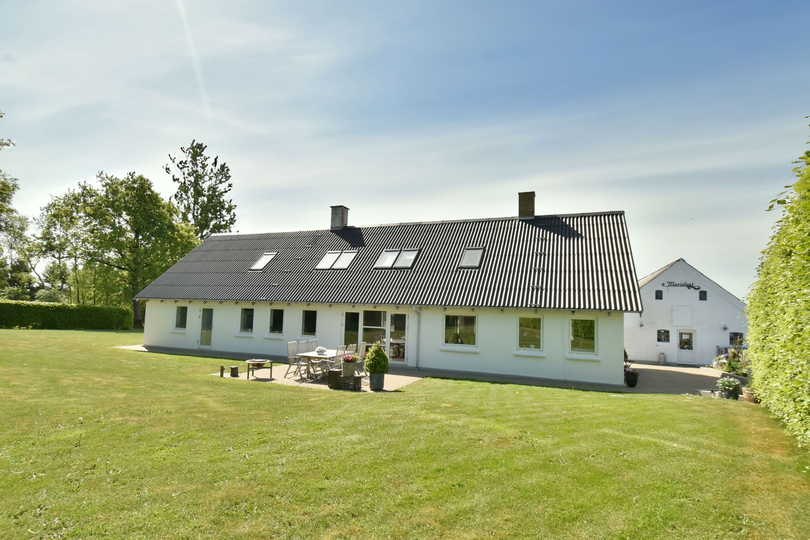 Ejendommens udbygninger byder på mange anvendelsesmuligheder. Med i alt 254 m2 fordelt på flere bygninger er der masser af plads til både værksted, garage og gildesal. Gildesalen er med hvælvingelofter, grovkøkken, entre og toilet. Derudover findes en separat udhusbygning på 70 m2, som kan bruges til dyrehold, opbevaring eller hobbyaktiviteter. De flotte udearealer omfatter flere solrige terrasser, en skøn have samt marker med mulighed for dyrehold eller andre aktiviteter.