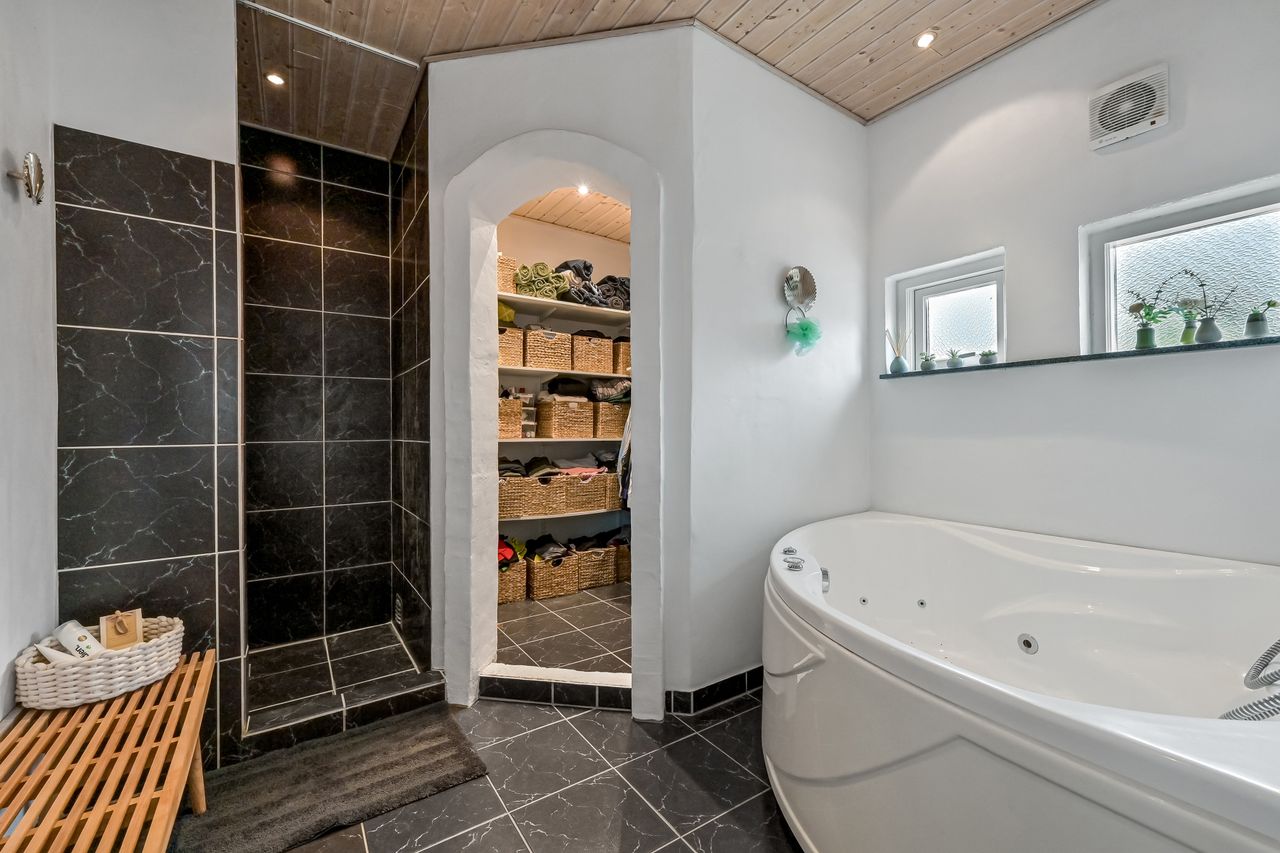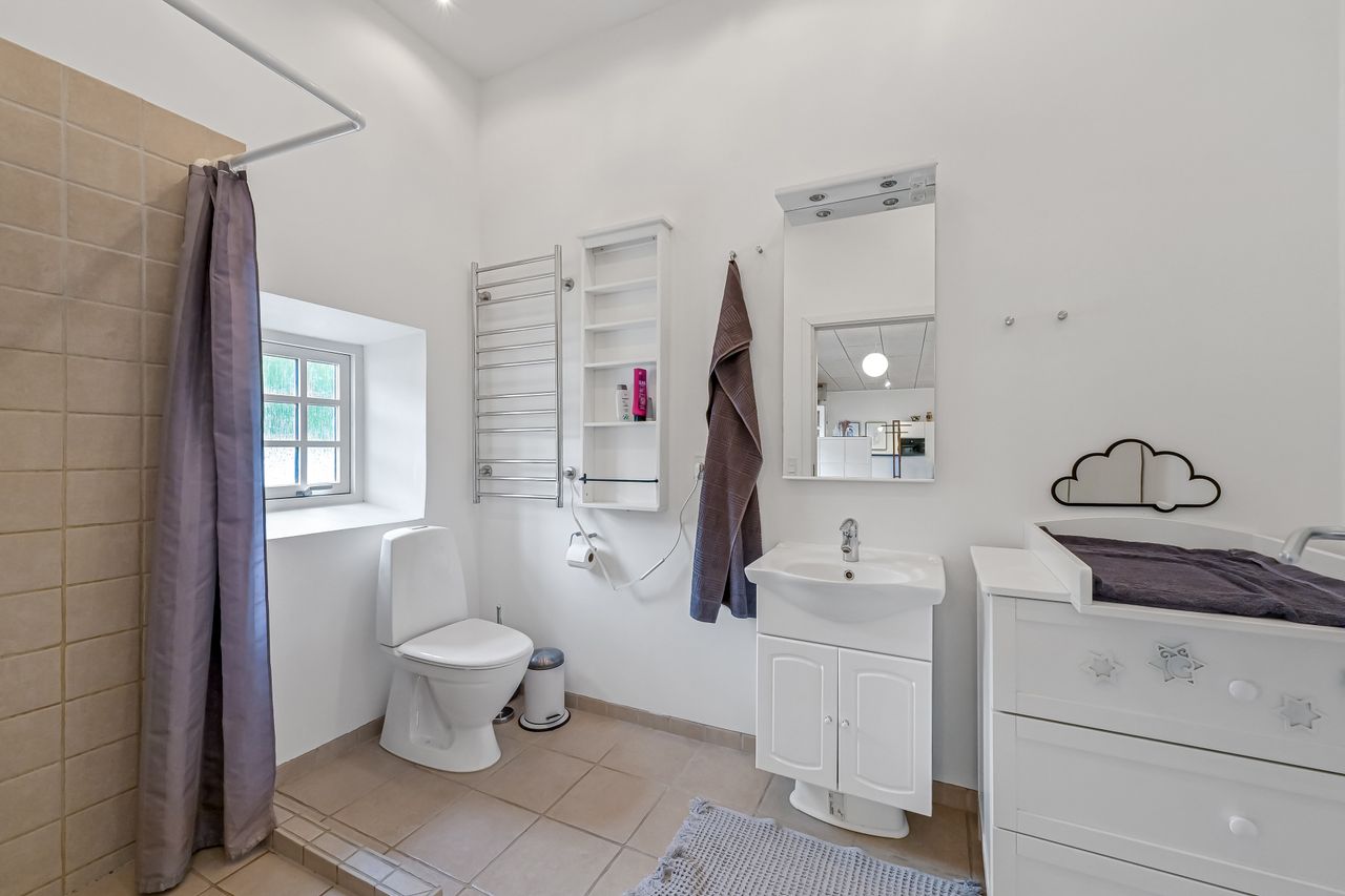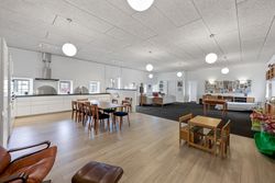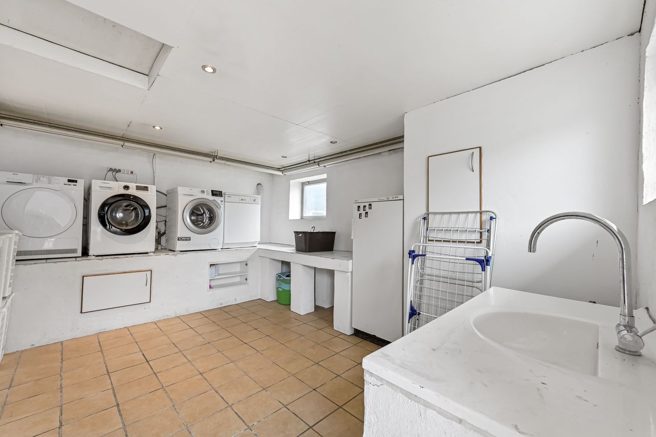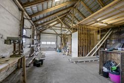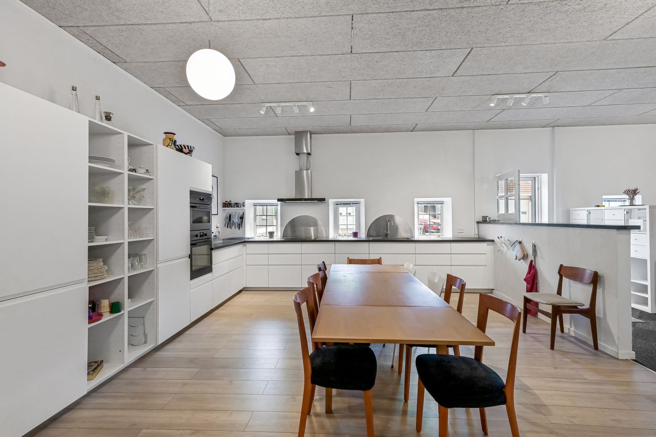 Ud over boligdelen byder ejendommen på flere funktionelle udhusbygninger: et selvstændigt fyrrum, vaskehus, dobbelt garage, lagerrum samt et stort værksted. Denne samling af bygninger giver gode muligheder for opbevaring, håndværk eller mindre erhvervsdrift.