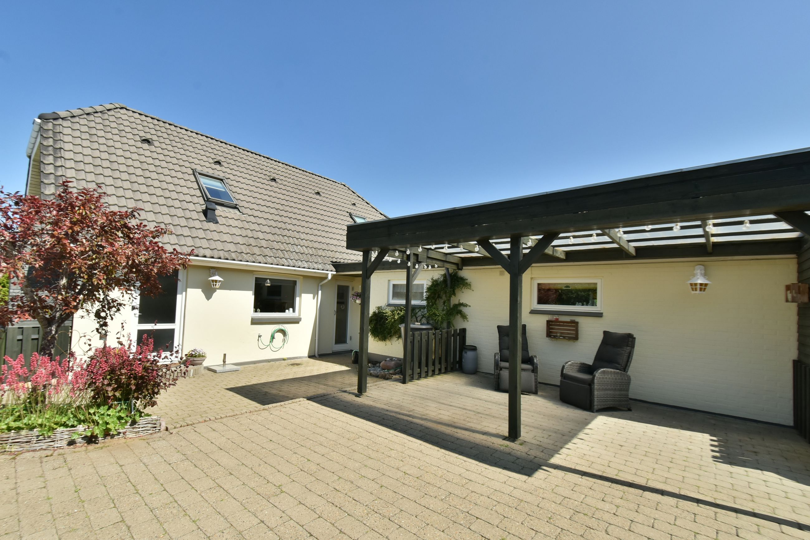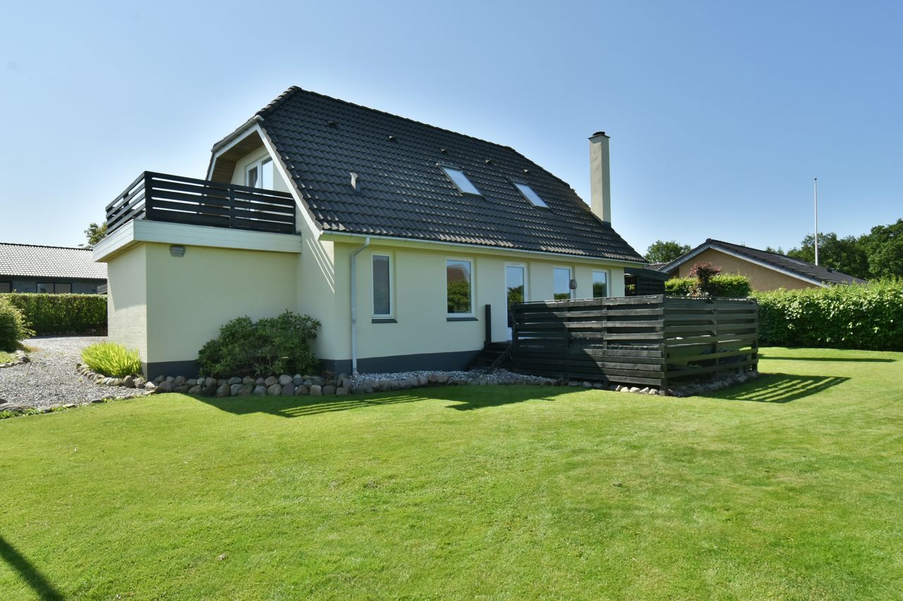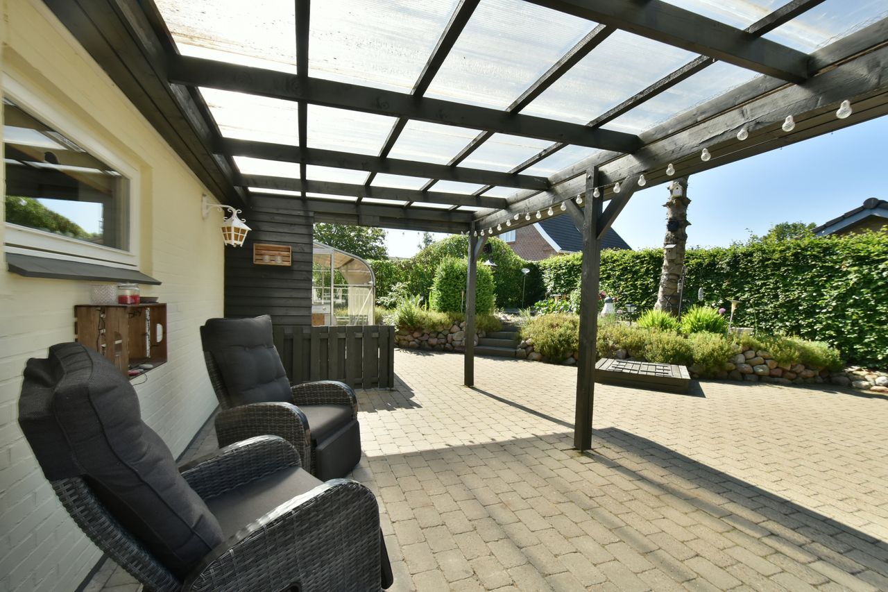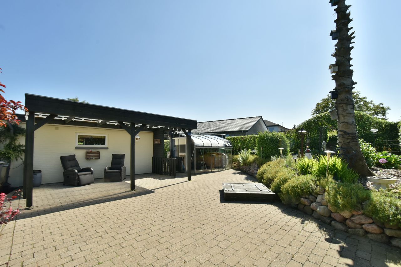 Udenfor venter en stor grund med god luft omkring huset. Her er flere terrasser rundt om huset som inviterer dig udenfor i de varme måneder, mens den skønne private gårdhave tilbyder ro, privatliv og afslapning. Haven er simpel anlagt i græs med få bede og planter. Her har du selv mulighed for at etablere din egen haveoase efter egne ønsker.