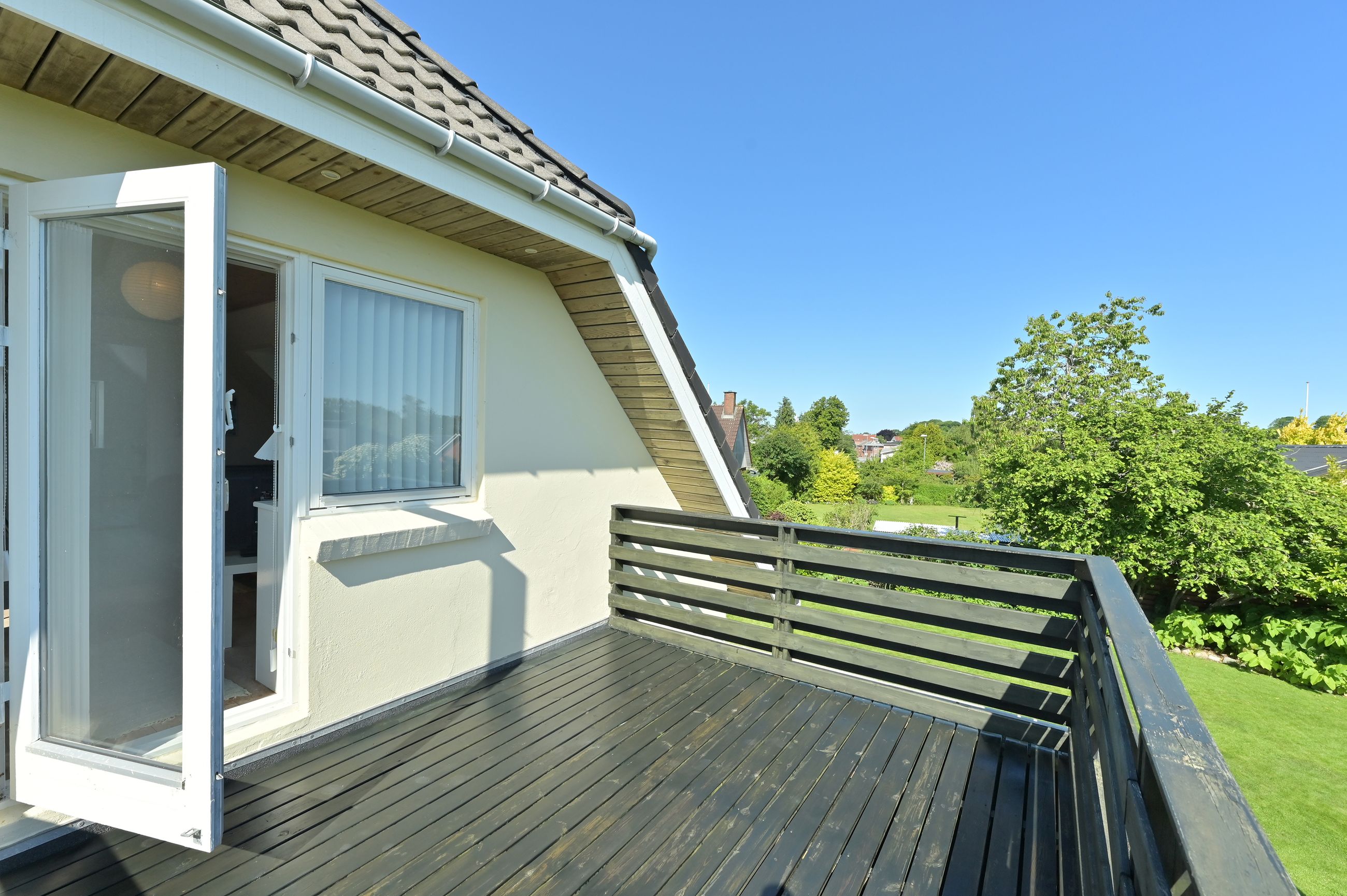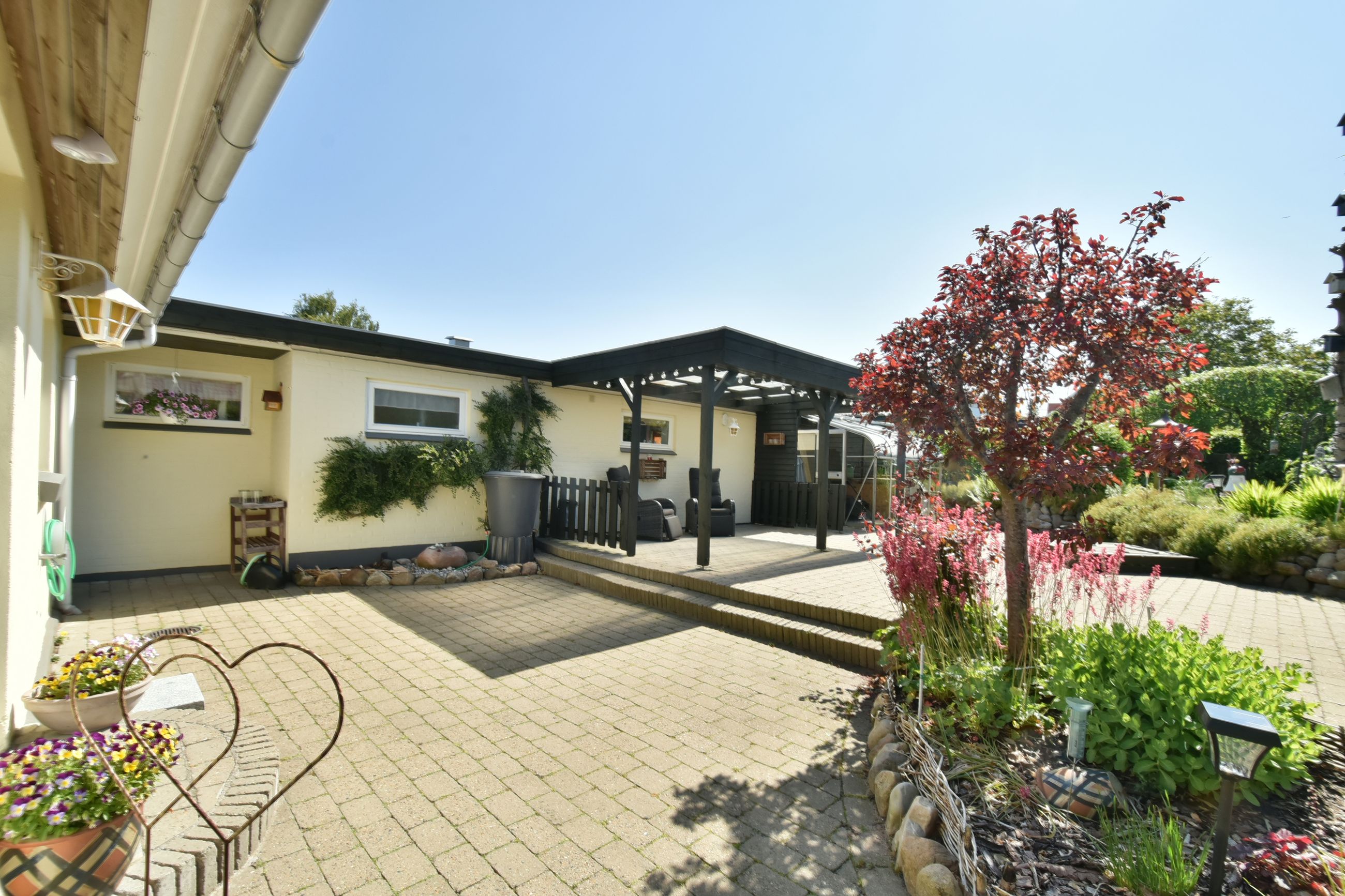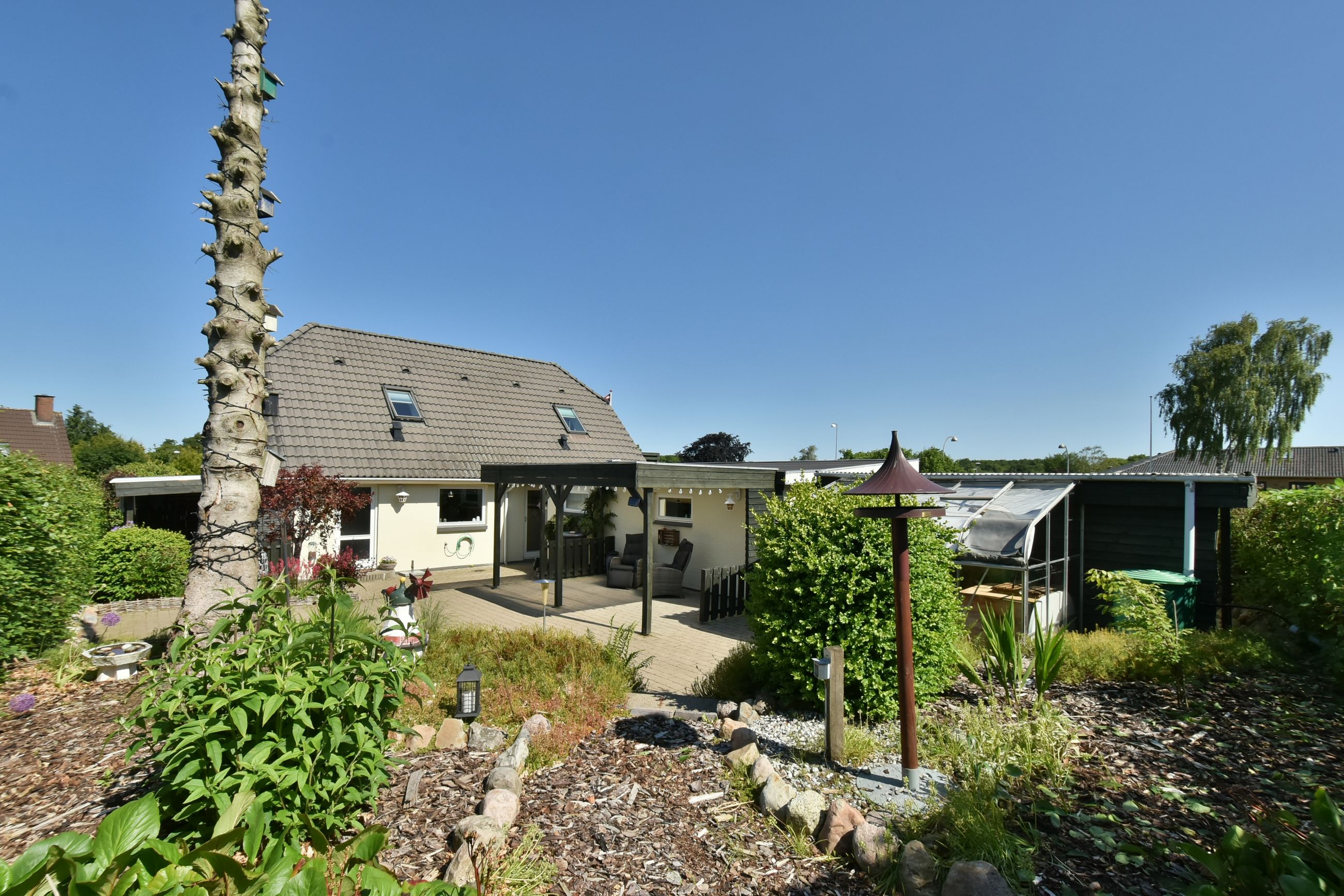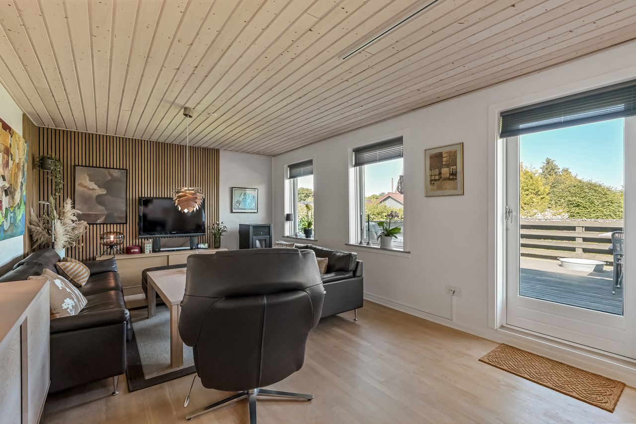 Udenfor venter en stor grund med god luft omkring huset. Her er flere terrasser rundt om huset som inviterer dig udenfor i de varme måneder, mens den skønne private gårdhave tilbyder ro, privatliv og afslapning. Haven er simpel anlagt i græs med få bede og planter. Her har du selv mulighed for at etablere din egen haveoase efter egne ønsker.