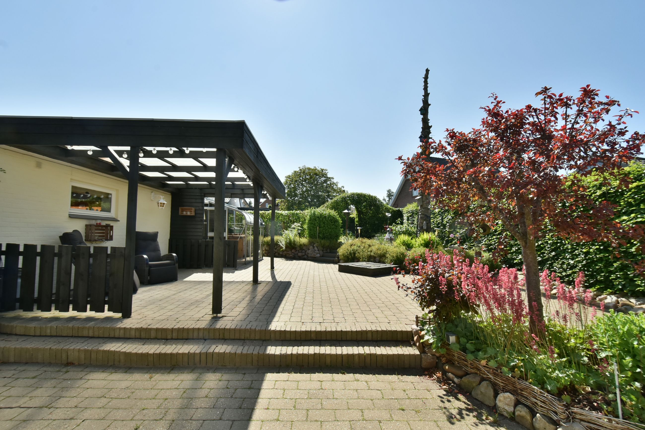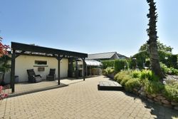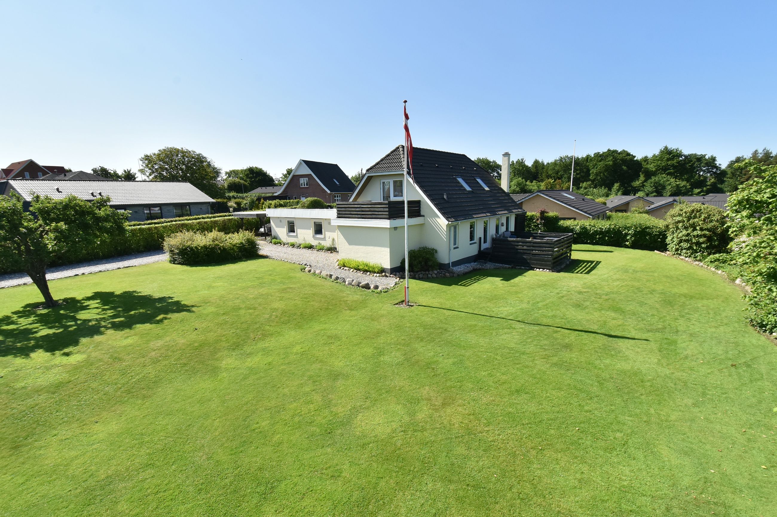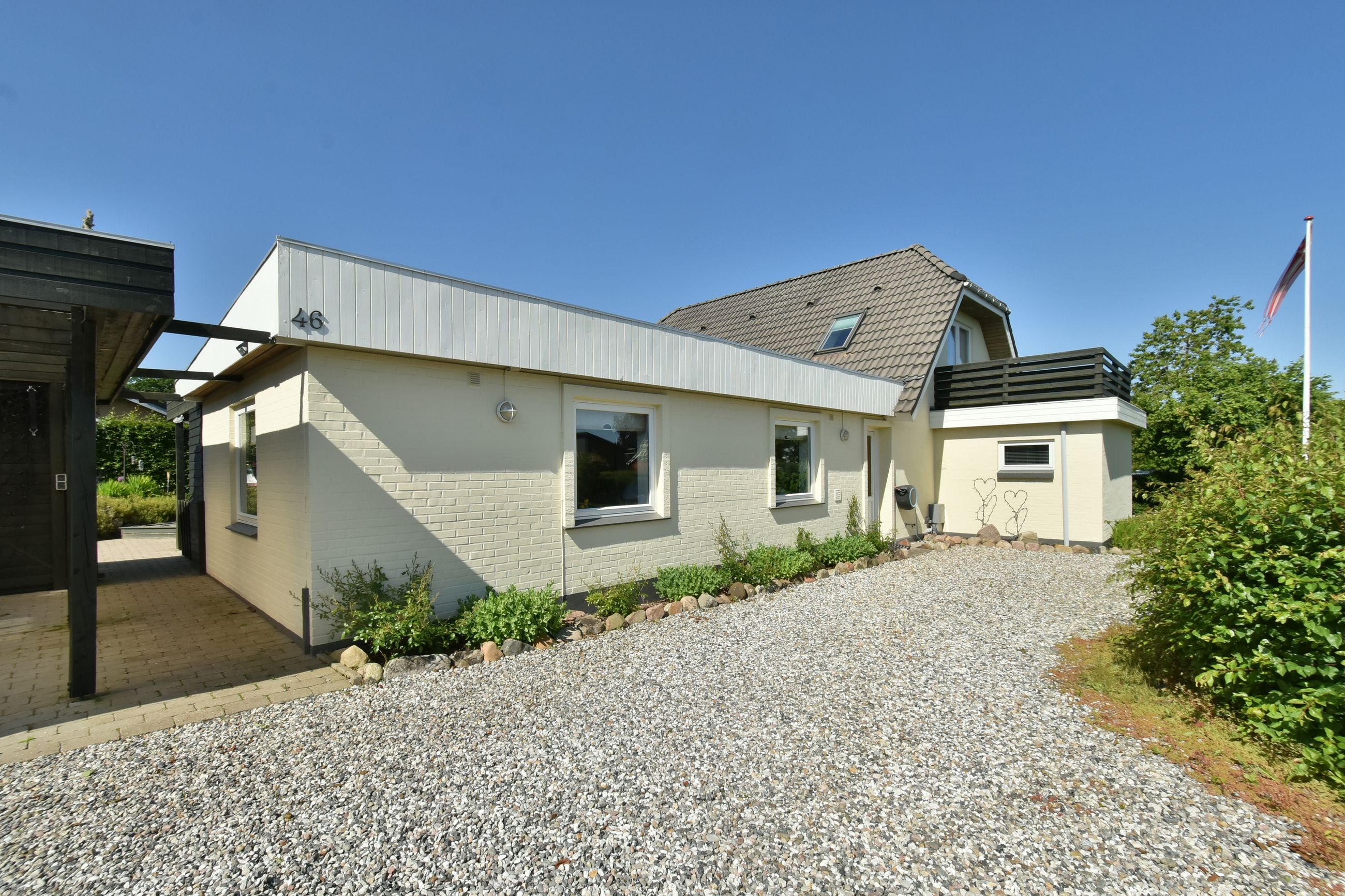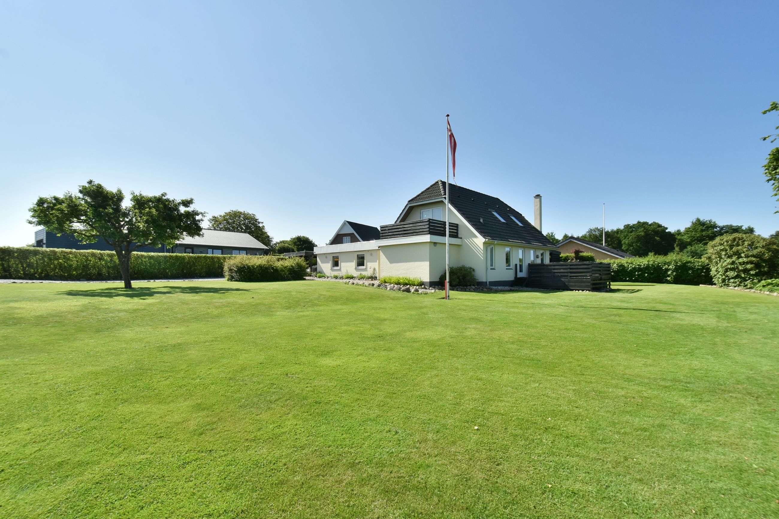 Udenfor venter en stor grund med god luft omkring huset. Her er flere terrasser rundt om huset som inviterer dig udenfor i de varme måneder, mens den skønne private gårdhave tilbyder ro, privatliv og afslapning. Haven er simpel anlagt i græs med få bede og planter. Her har du selv mulighed for at etablere din egen haveoase efter egne ønsker.