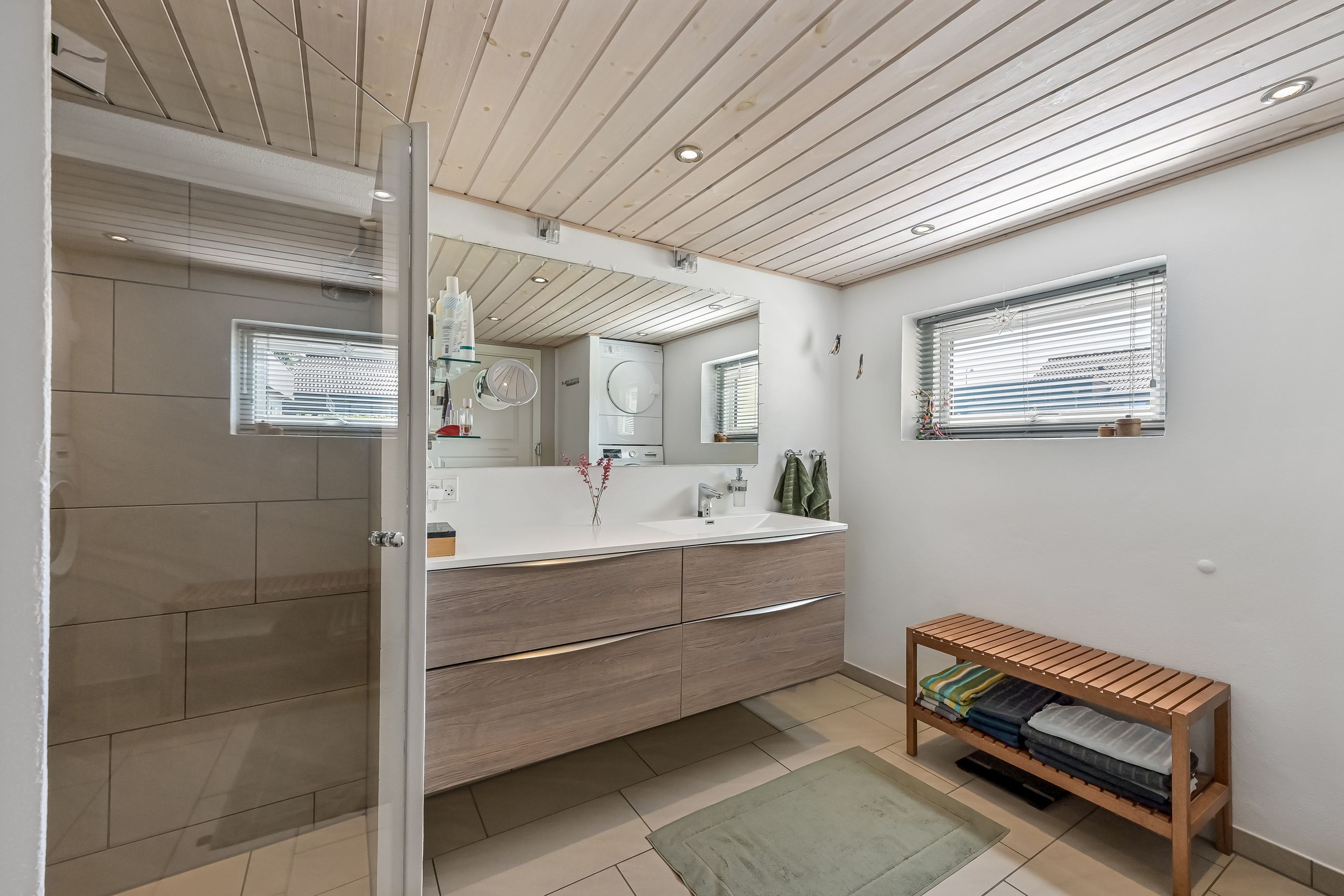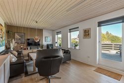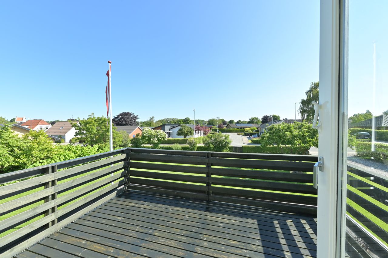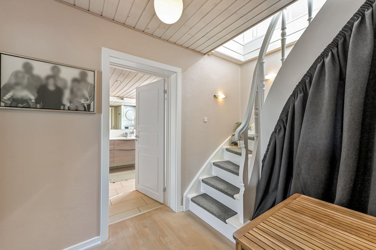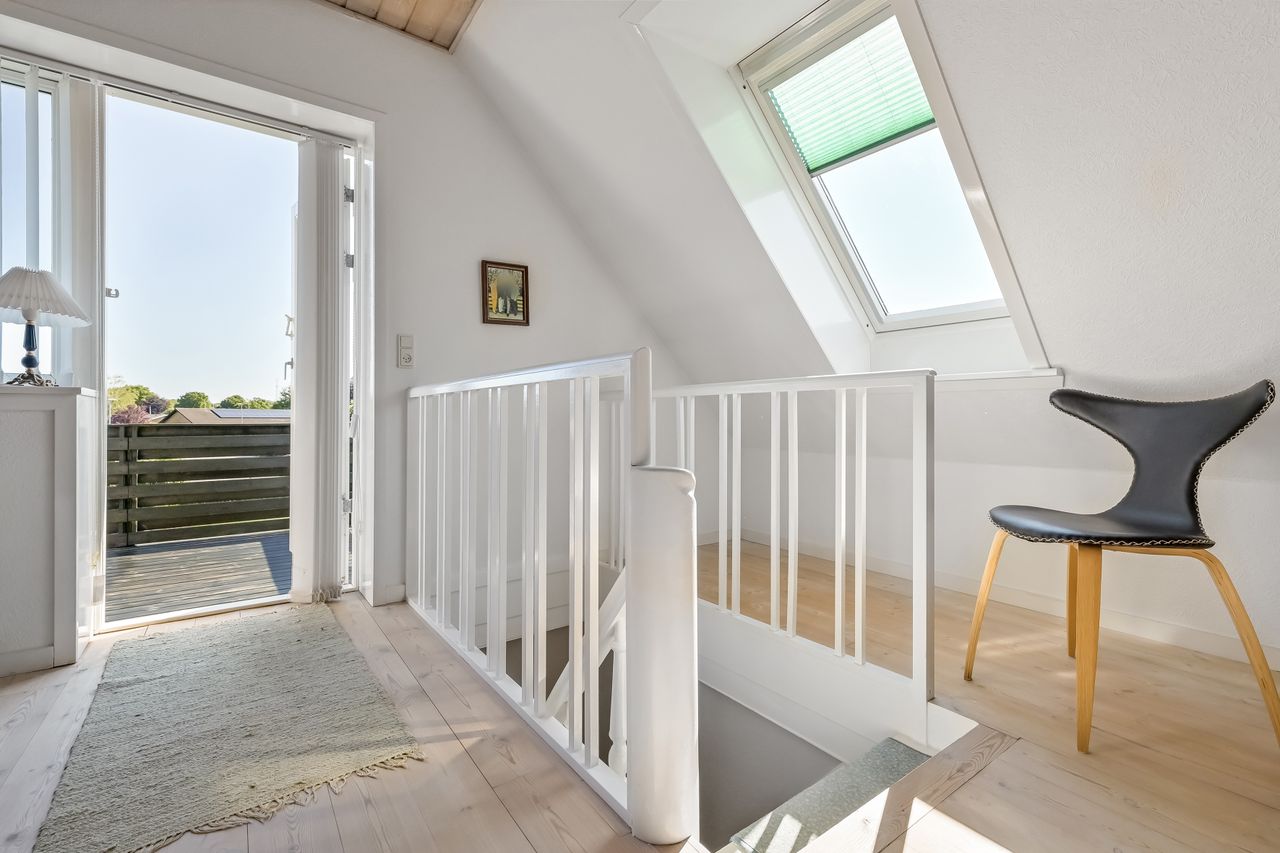 Fra køkkenet finder du endnu en indgang med praktisk adgang fra gårdhaven, hvor du har let adgang til carporten. Det store badeværelse blev moderniseret i 2012 og byder på gulvvarme samt lækre materialevalg. På 1-sal træder du op i et stort repos, der åbner sig op som endnu en stue og med udgang til en stor altan, Her kan du nyde udsigten over haven og byen.
