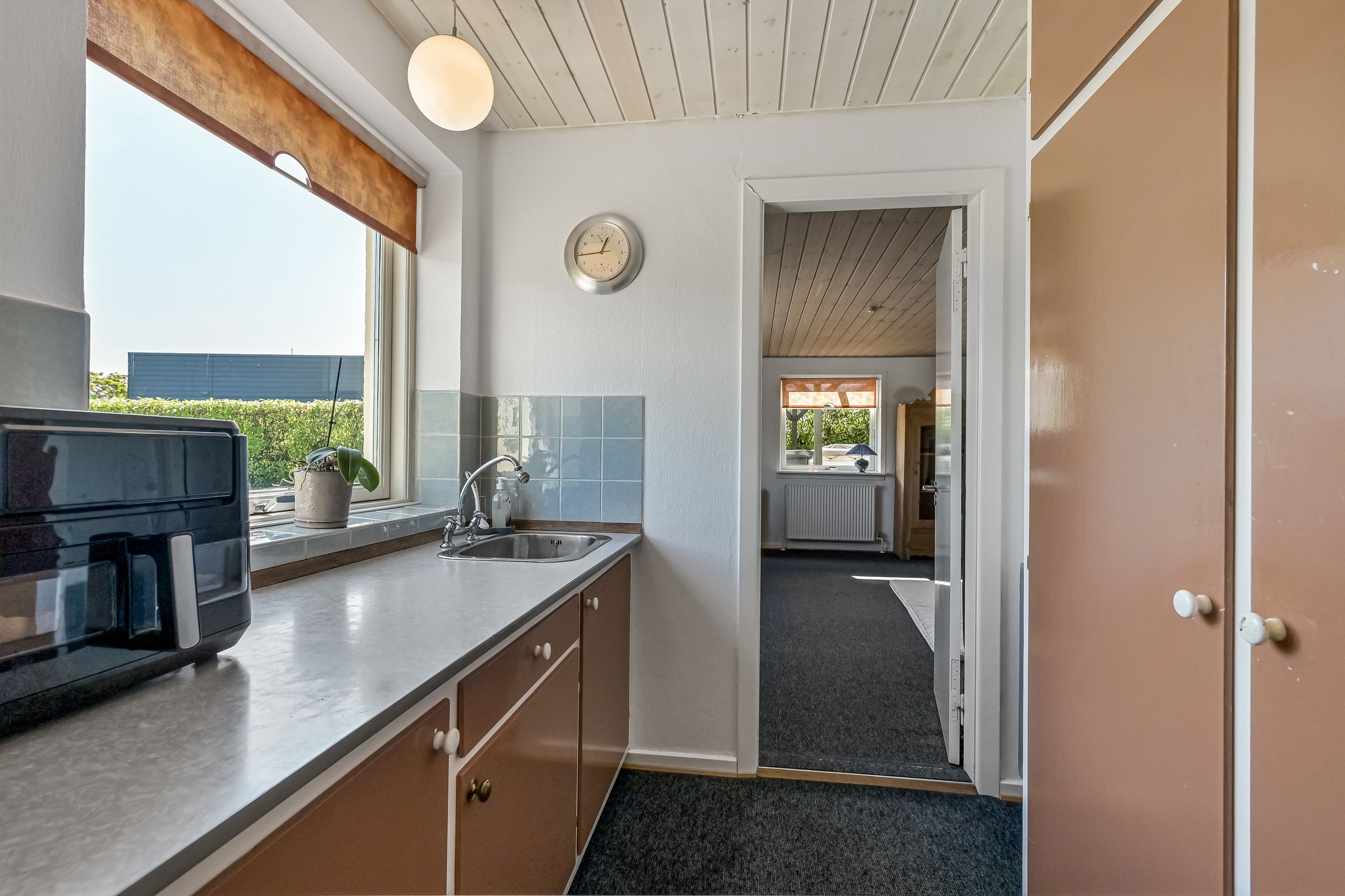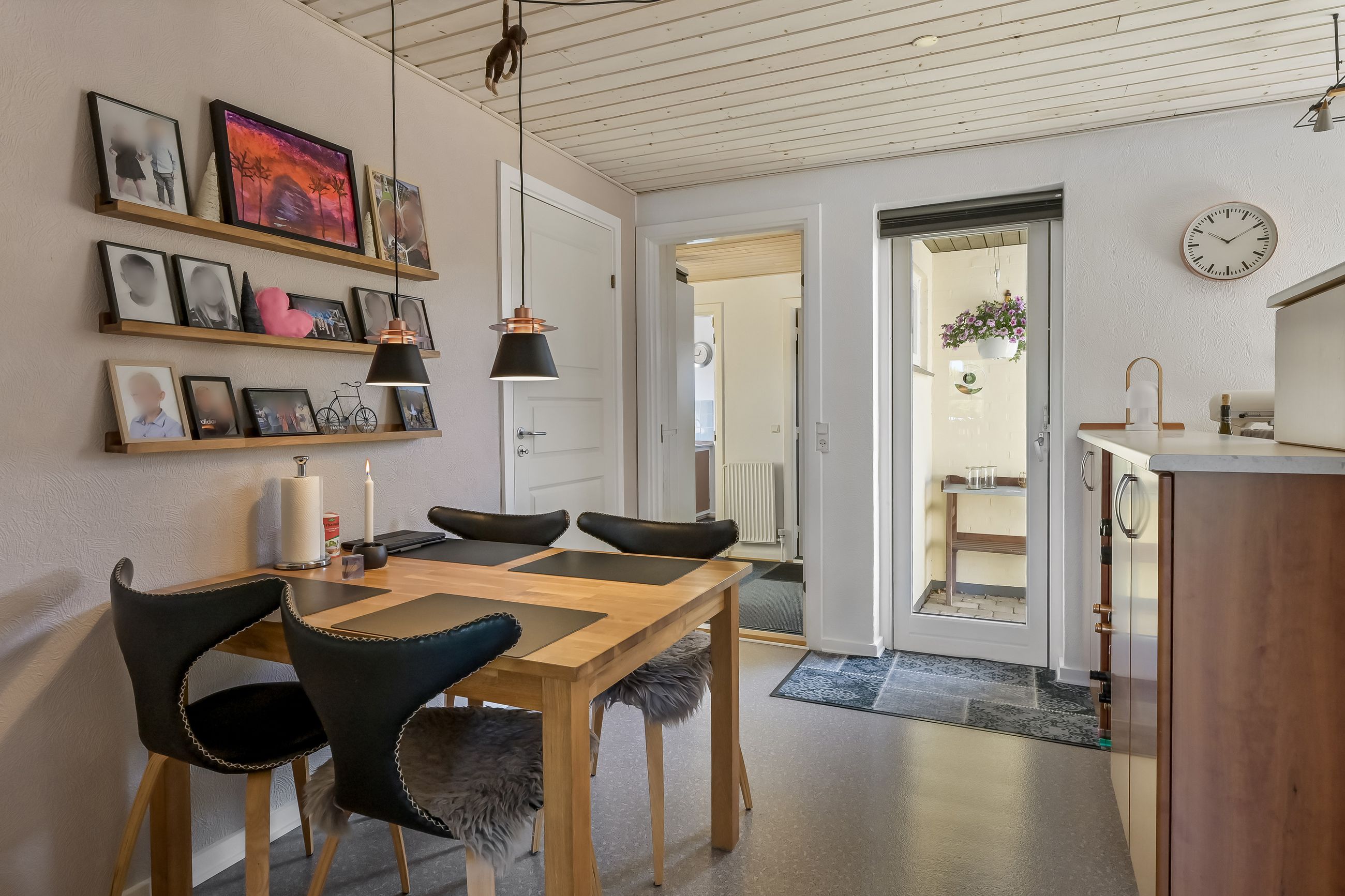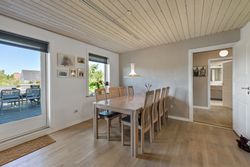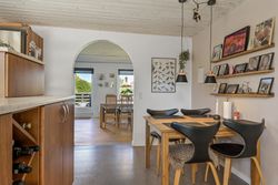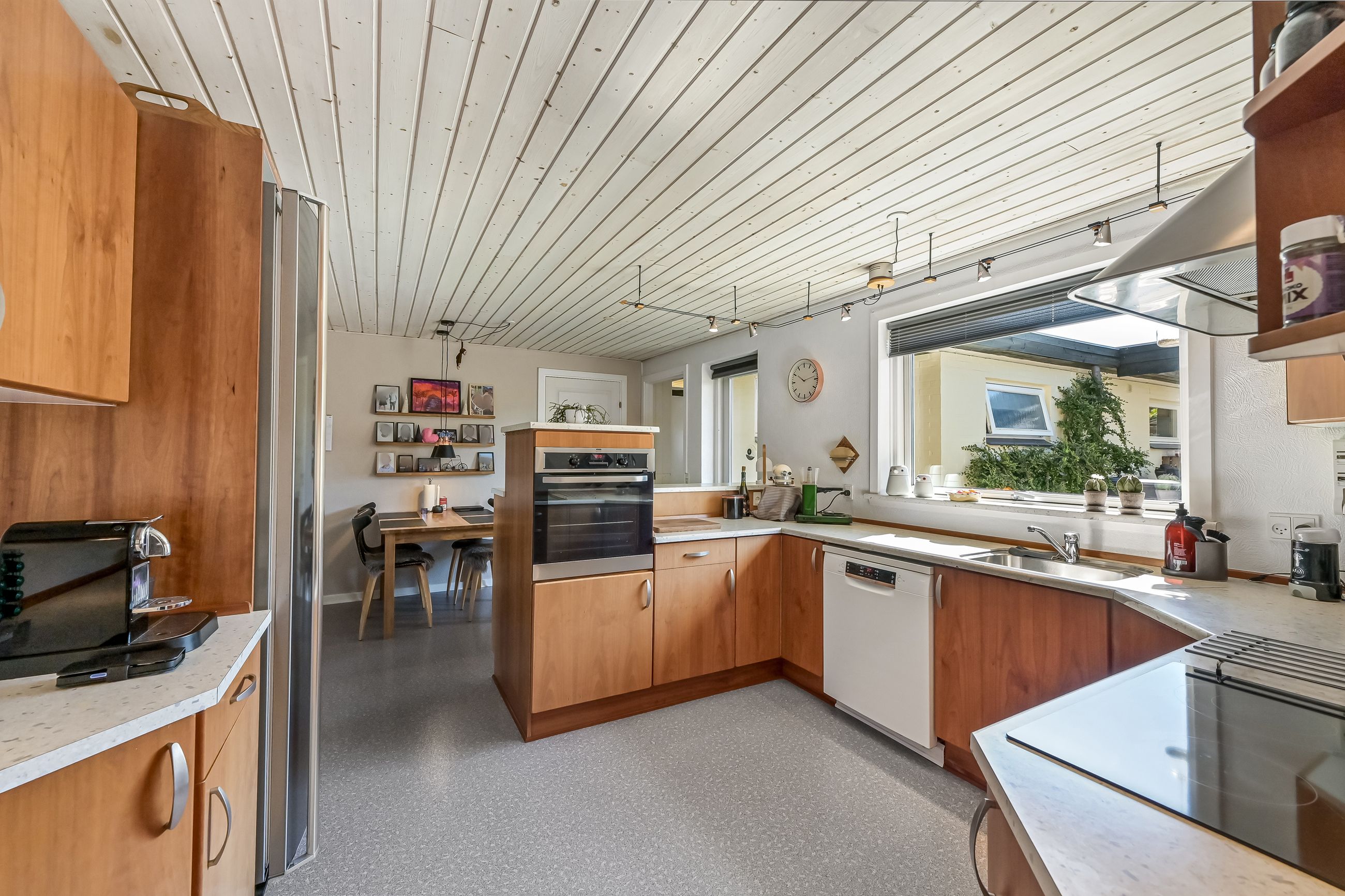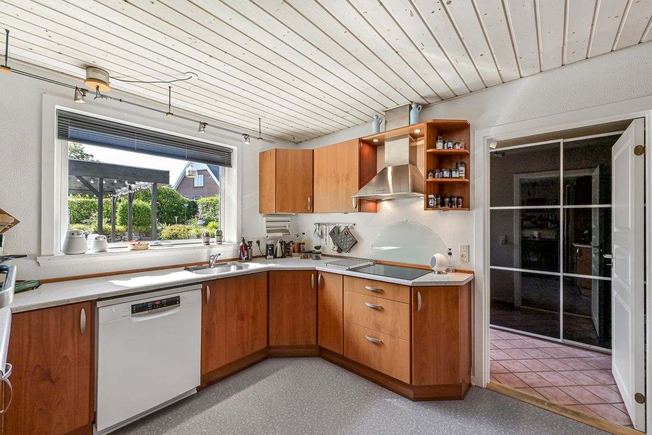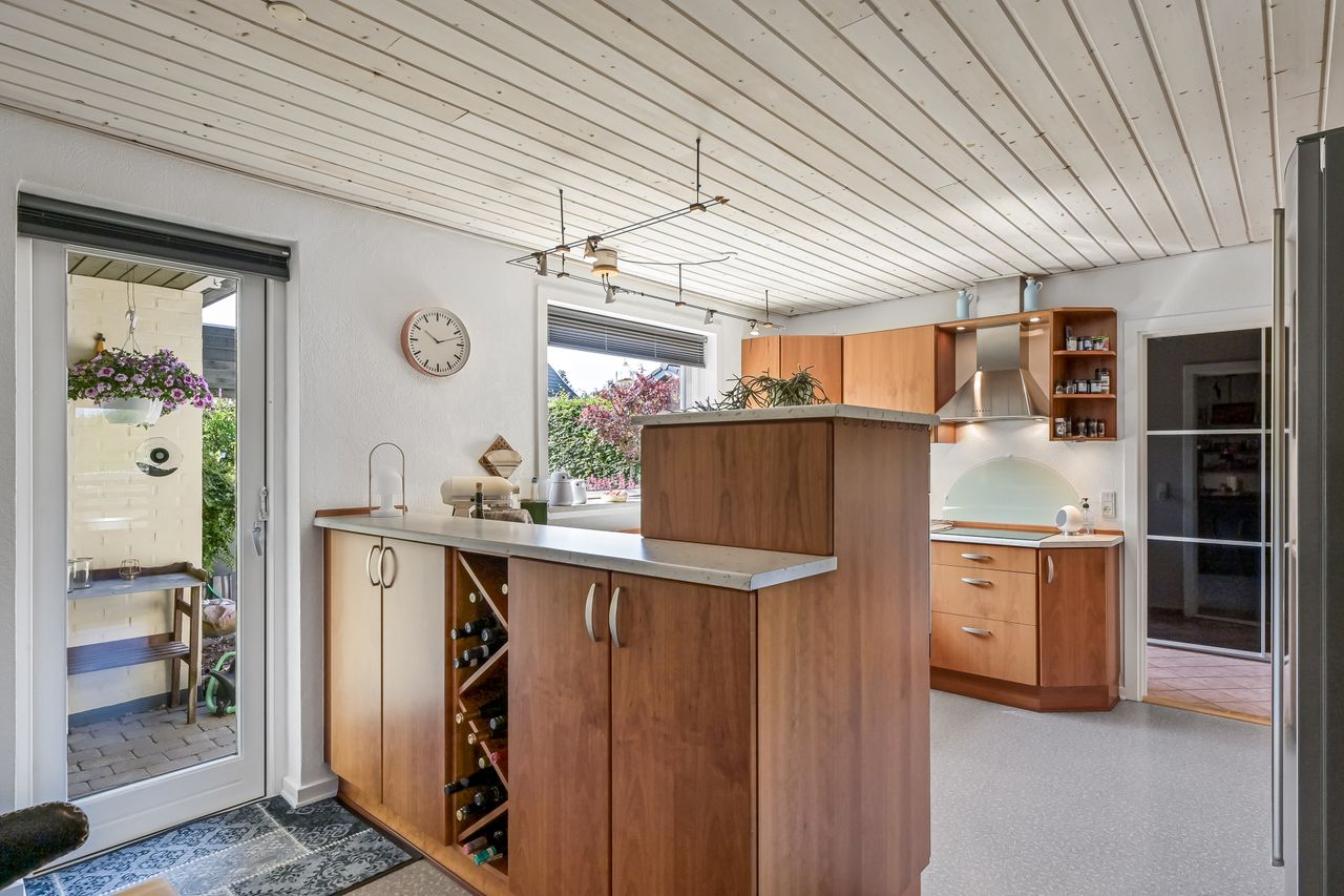 Når du træder ind gennem den lyse og indbydende indgang, bliver du straks mødt af en følelse af hjemlig hygge. Det store spisekøkken er et samlingspunkt for familien. Køkkenet er opført med kirsebærelementer, som giver en god varme i rummet, mens udgangen til gårdhaven gør det nemt at nyde måltider ude om sommeren. Fra køkkenet er der åbent ind til stuen, hvor du finder plads til både en sofagruppe og spisestue.