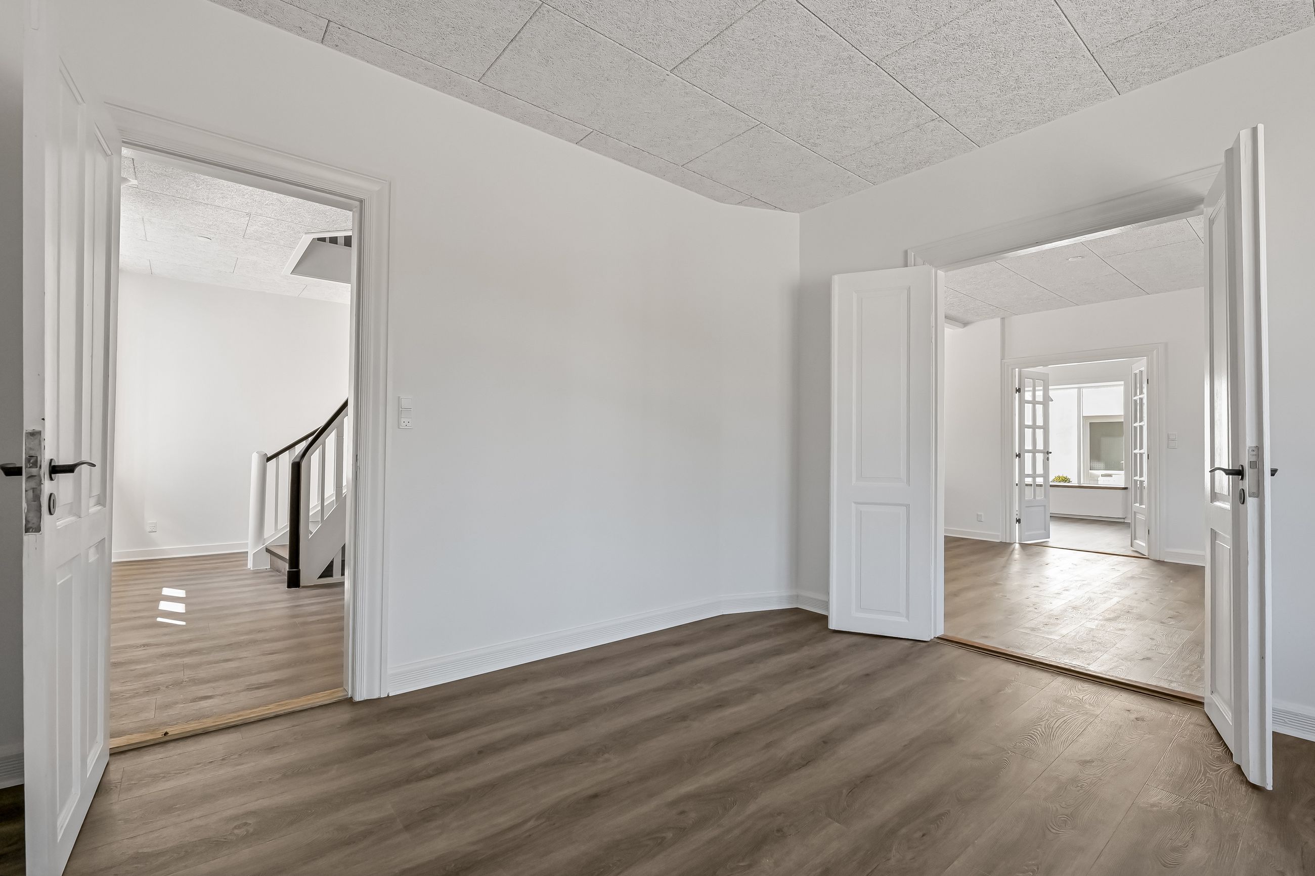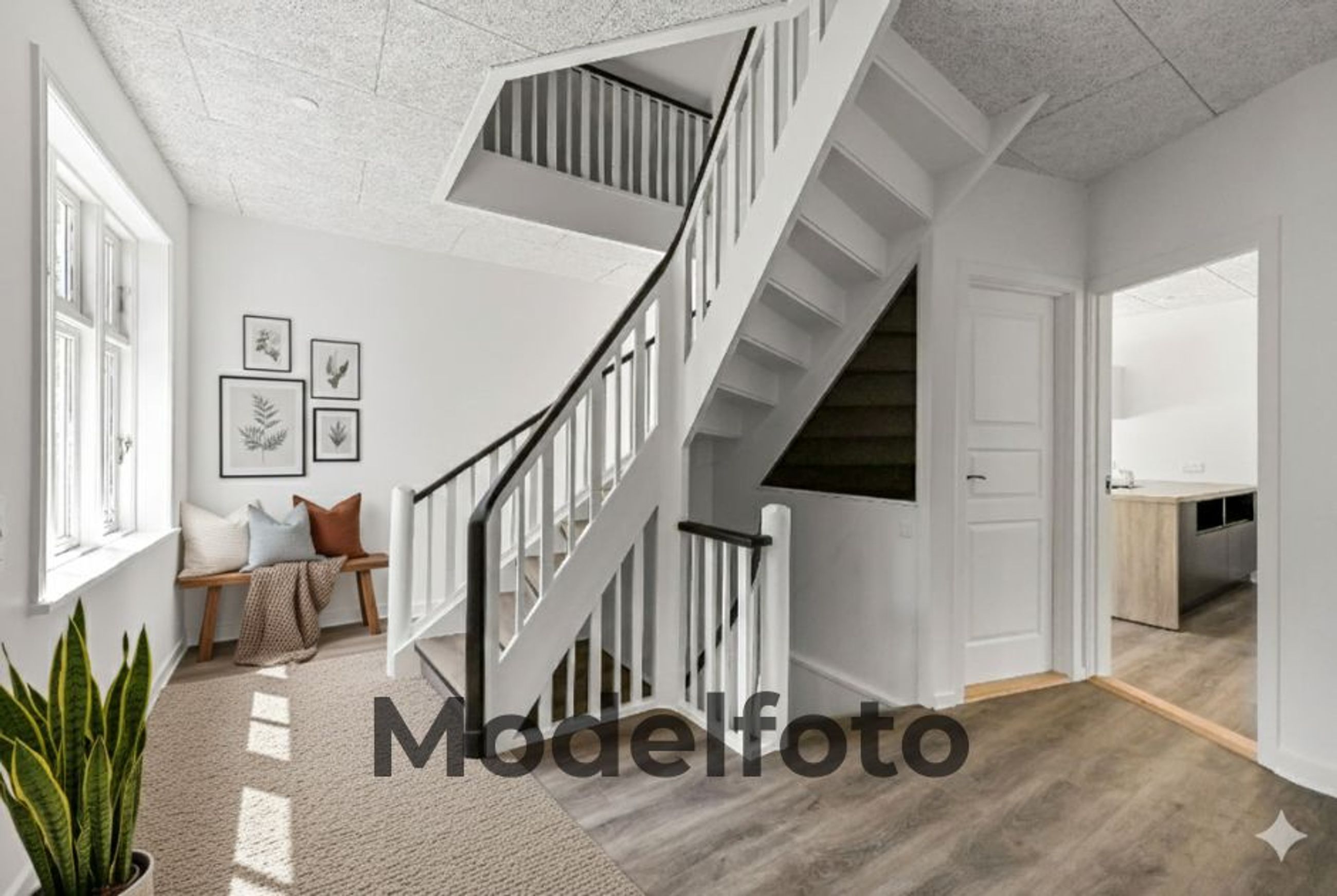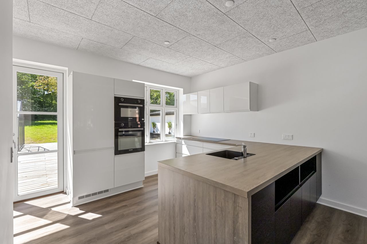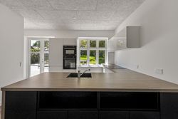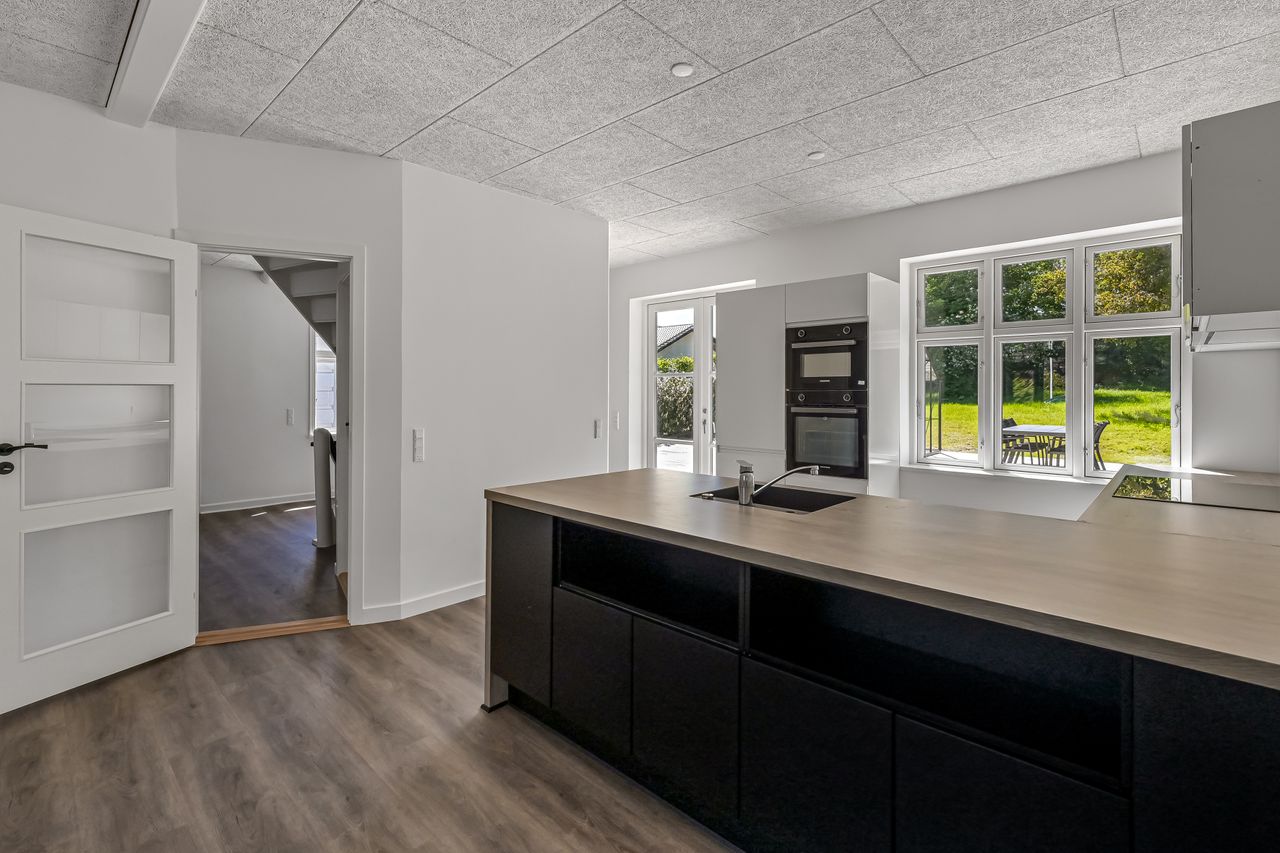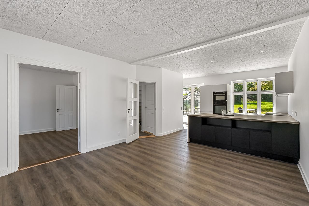 Villaen er indrettet med en rummelig hall med trappe til førstesalen, et gæstetoilet, en forstue, samt et lyst og åbent køkken/alrum med direkte udgang til terrassen. I stueplan findes desuden en stor stue, og der er generelt højt til loftet i hele huset, hvilket bidrager til en god rumfornemmelse.