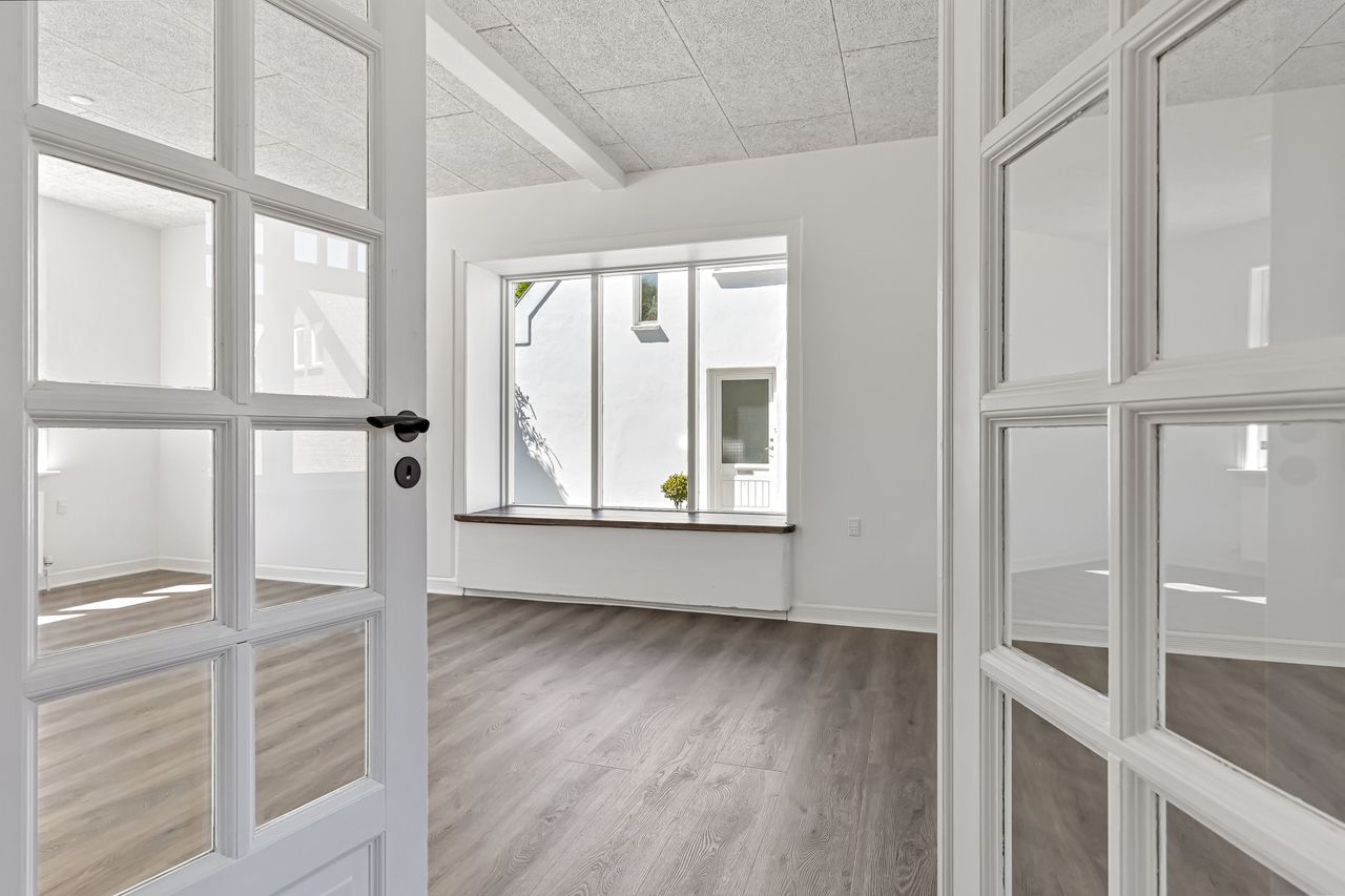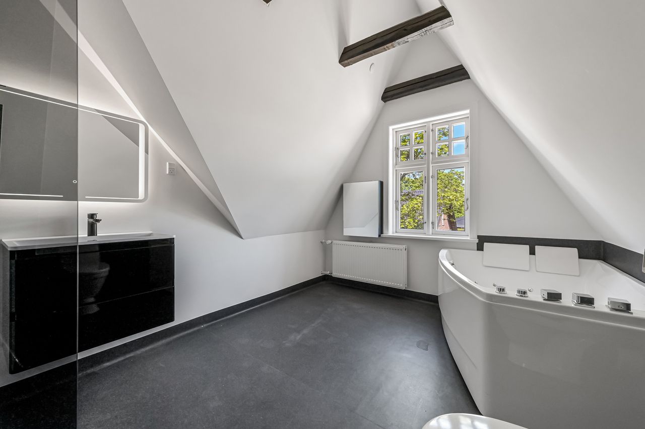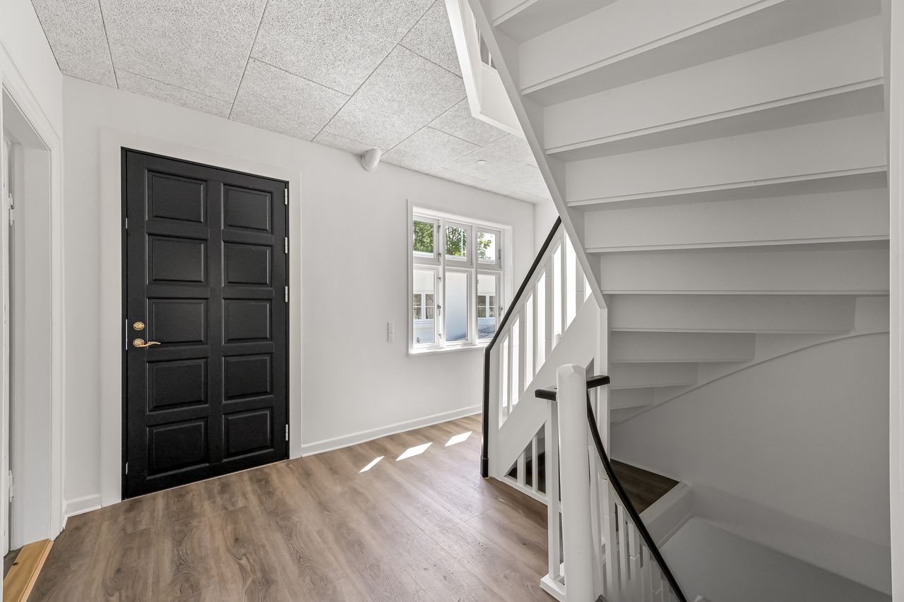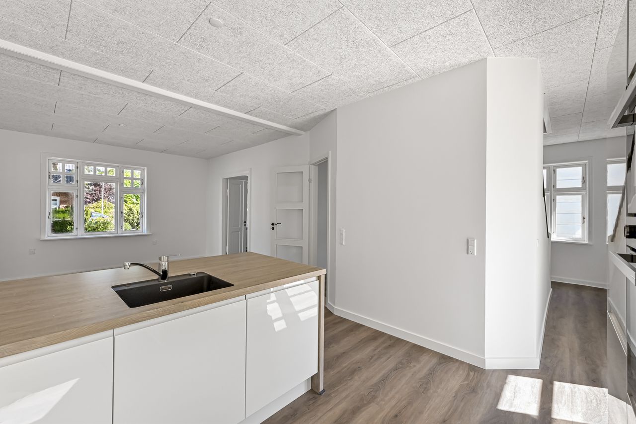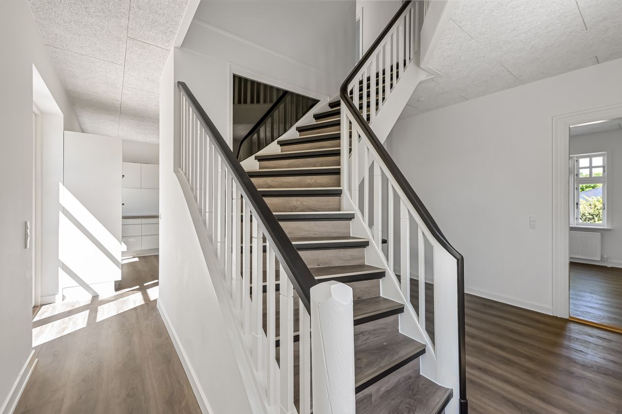 Denne flotte ældre villa har inden for det seneste år gennemgået en omfattende renovering og fremstår i særdeles velholdt stand. Facaden er vandskuret og hvidmalet, og det oprindelige eternitskifertag er renset og malet, hvilket giver huset et harmonisk og indbydende udtryk.