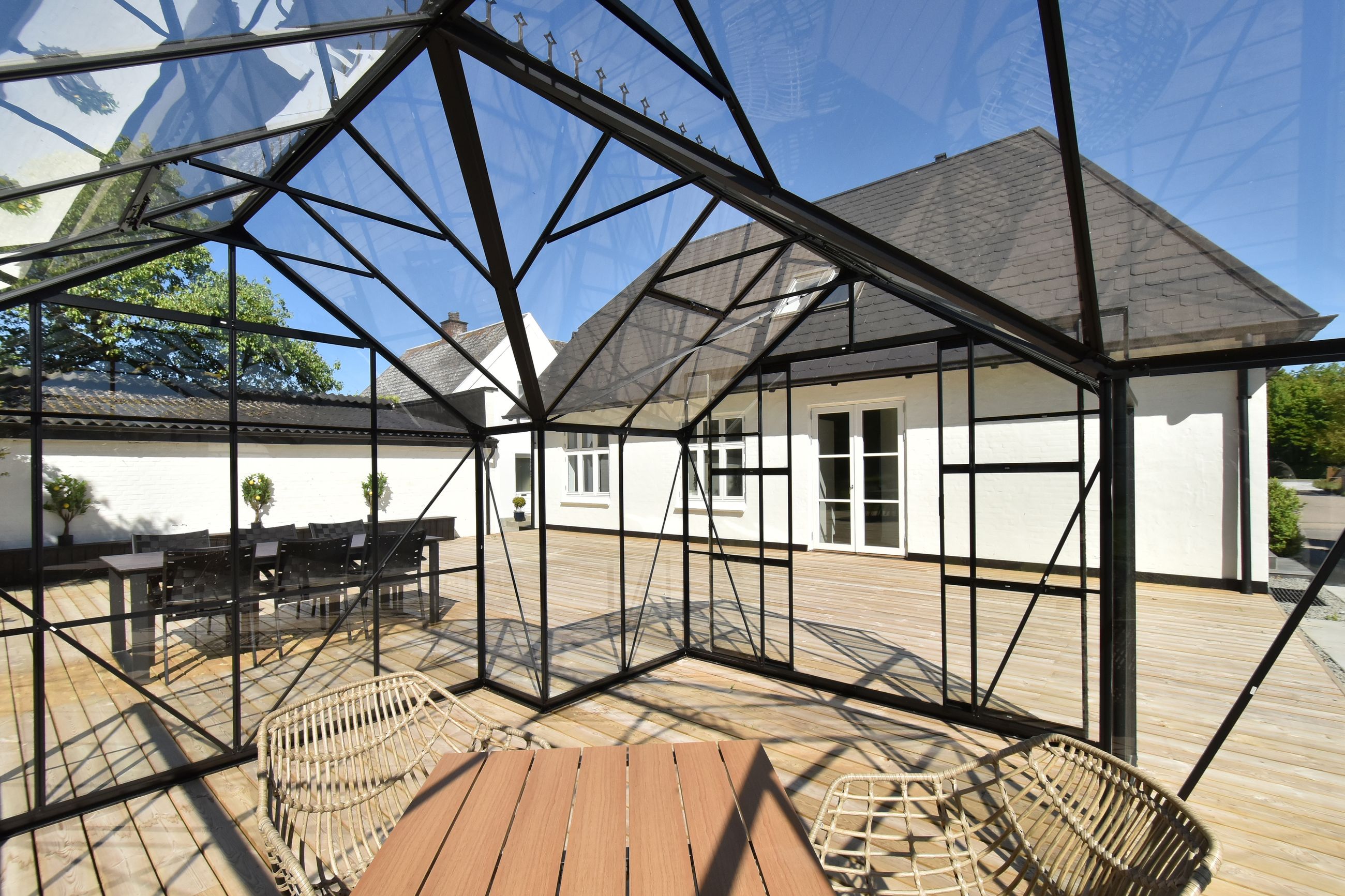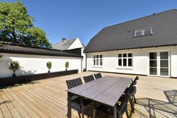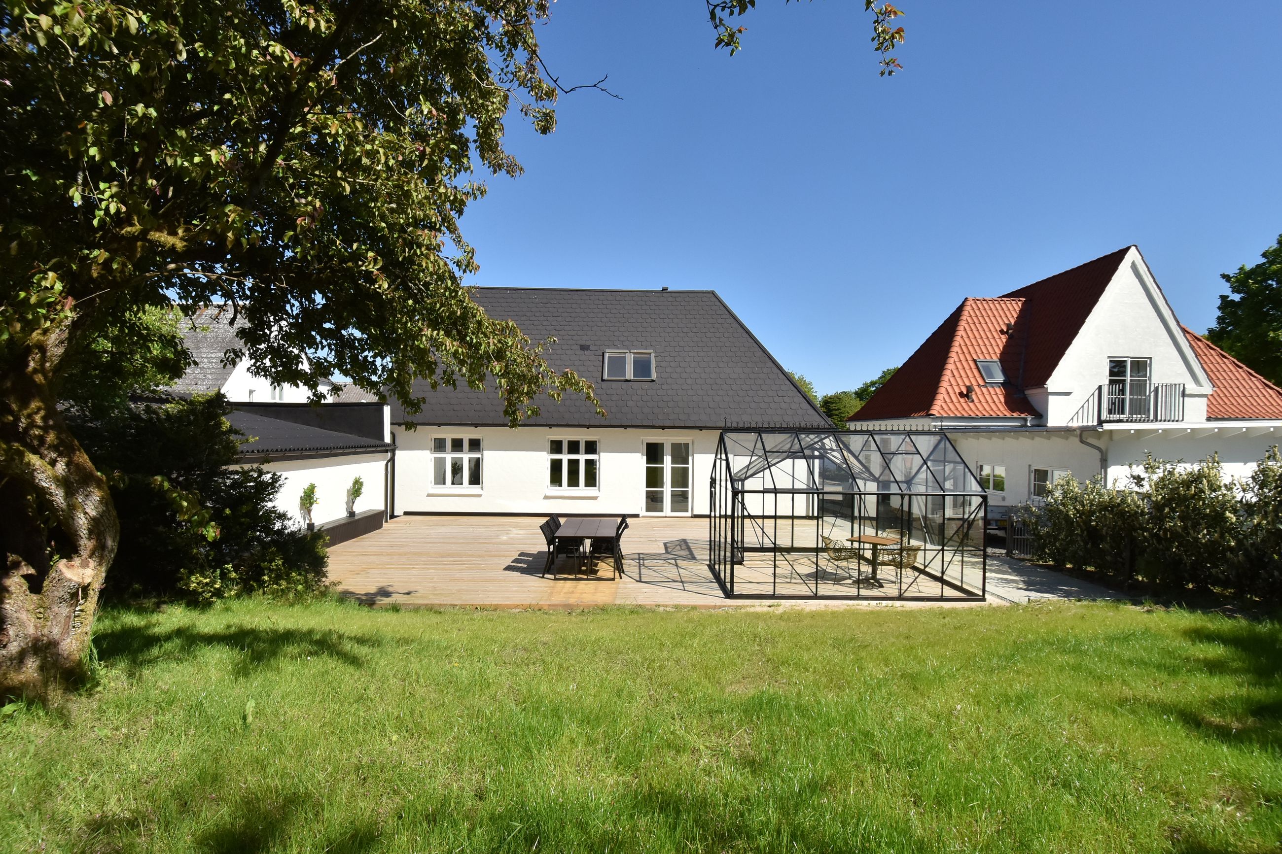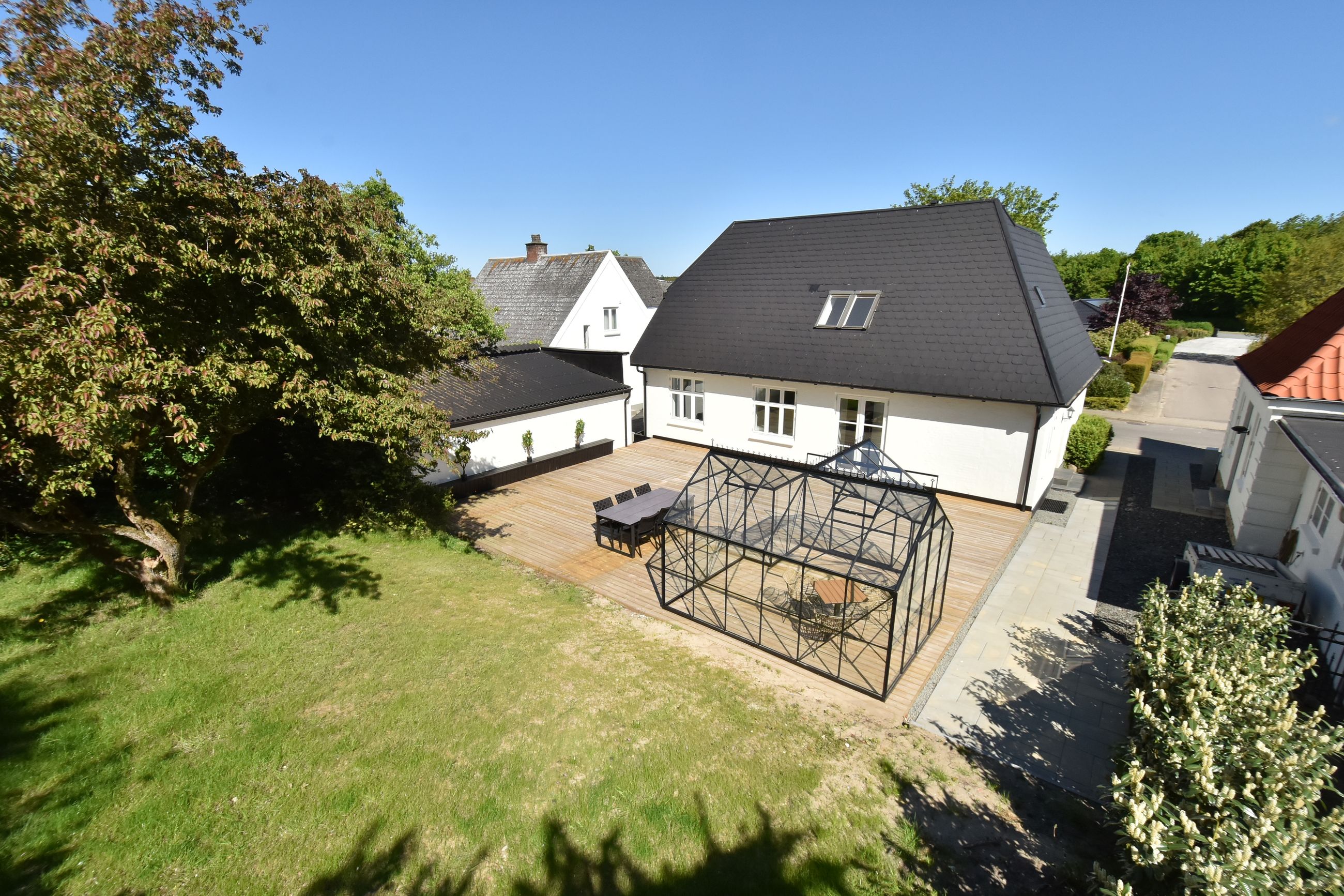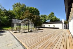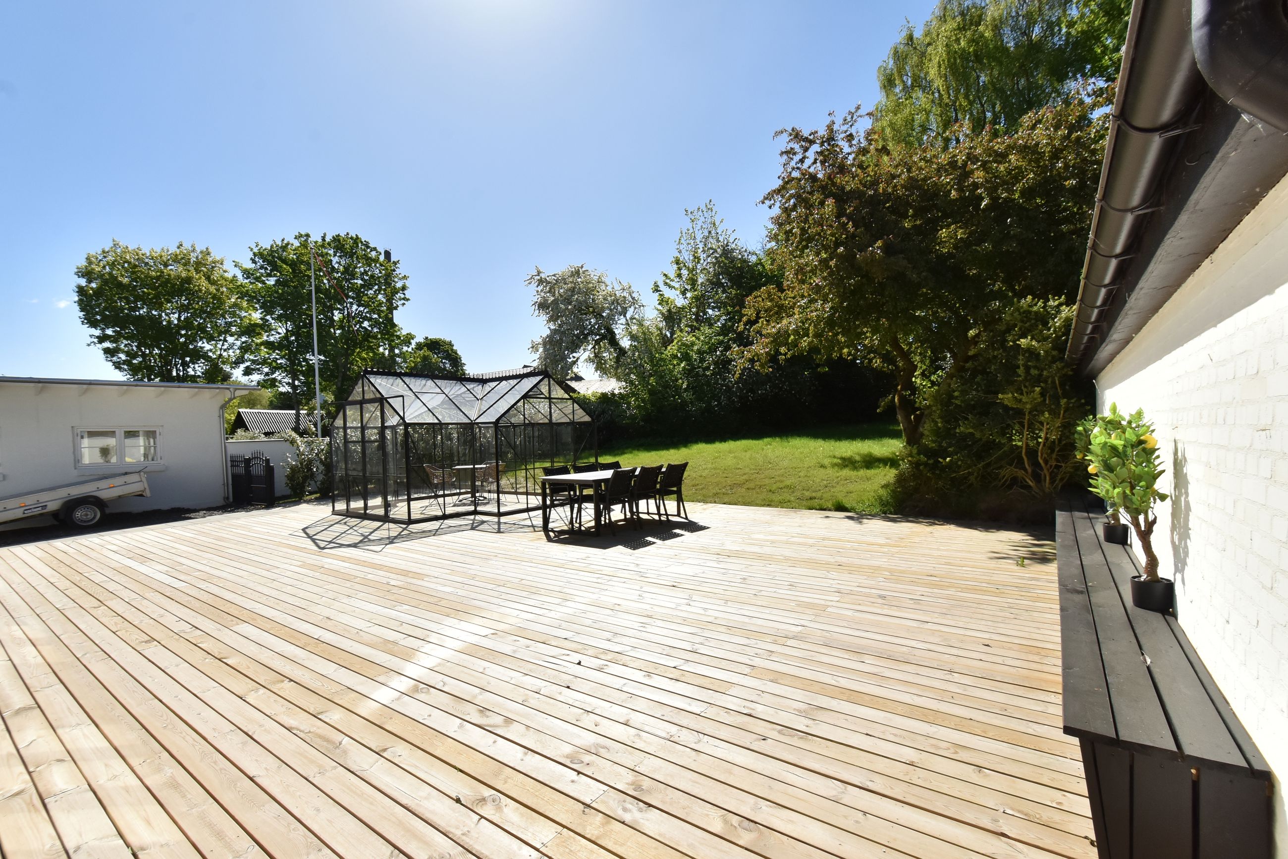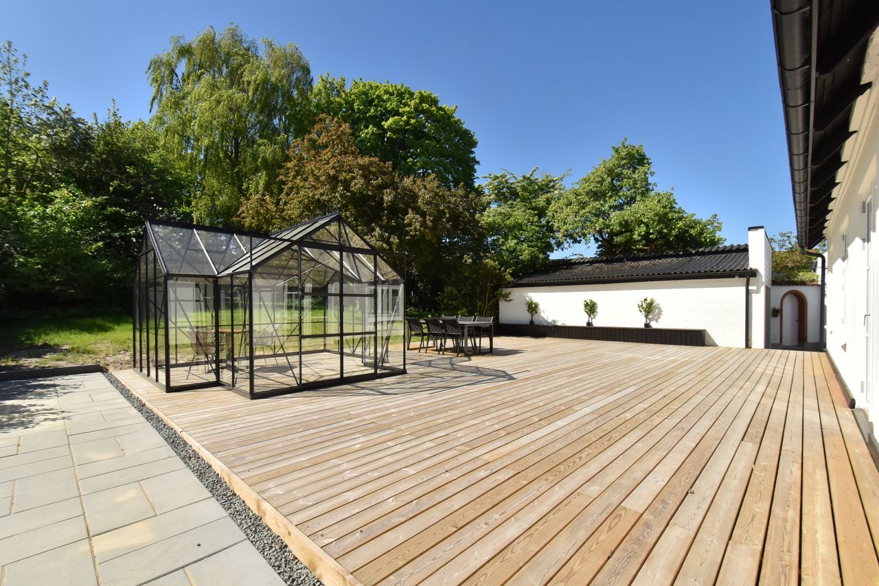 Grunden er velanlagt og byder på en stor sydvendt træterrasse, der giver god plads til udendørs ophold og samvær. I forlængelse heraf er der opført en ny og rummelig havepavillon, som tilfører ekstra anvendelsesmuligheder til udelivet.