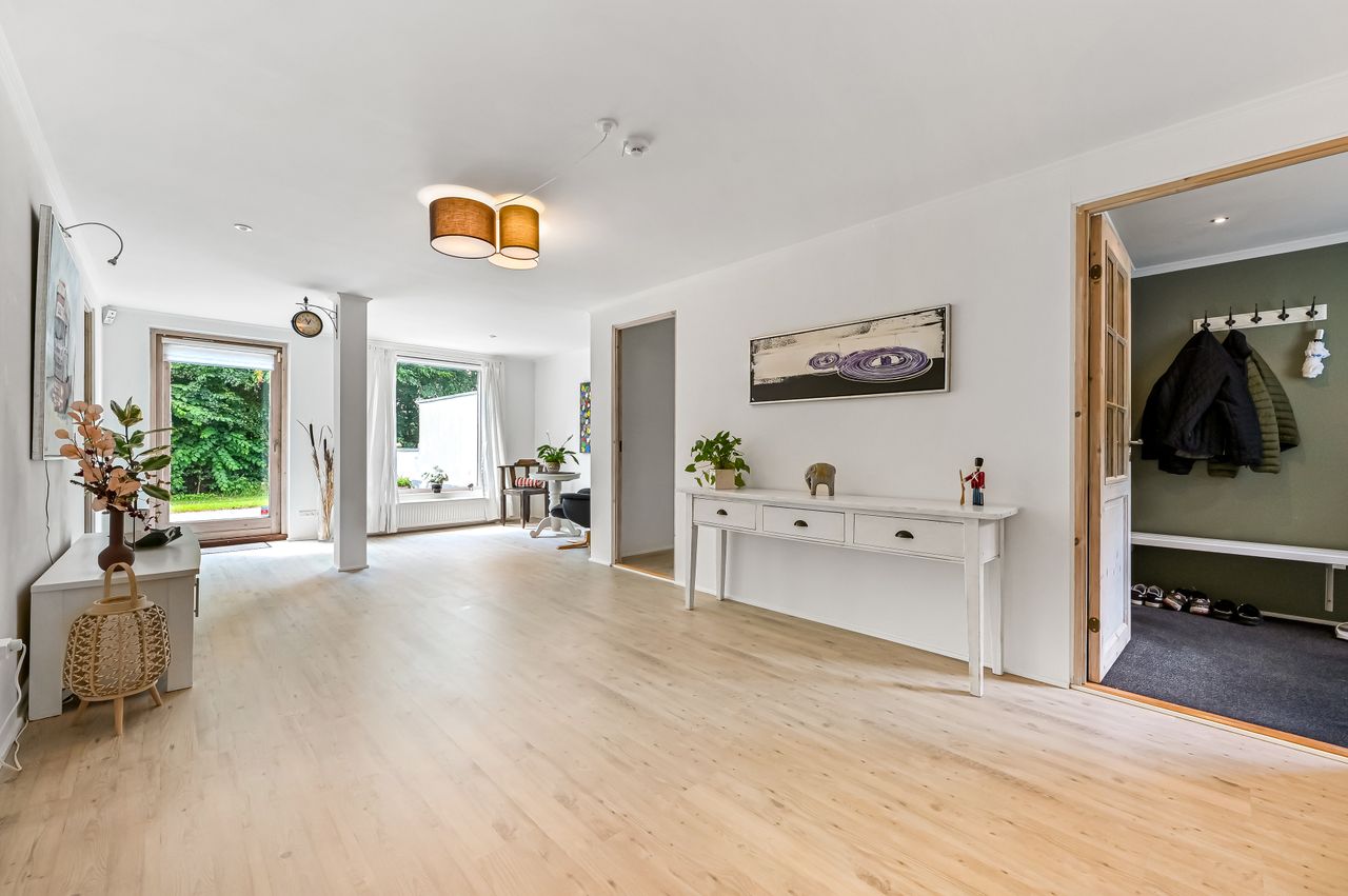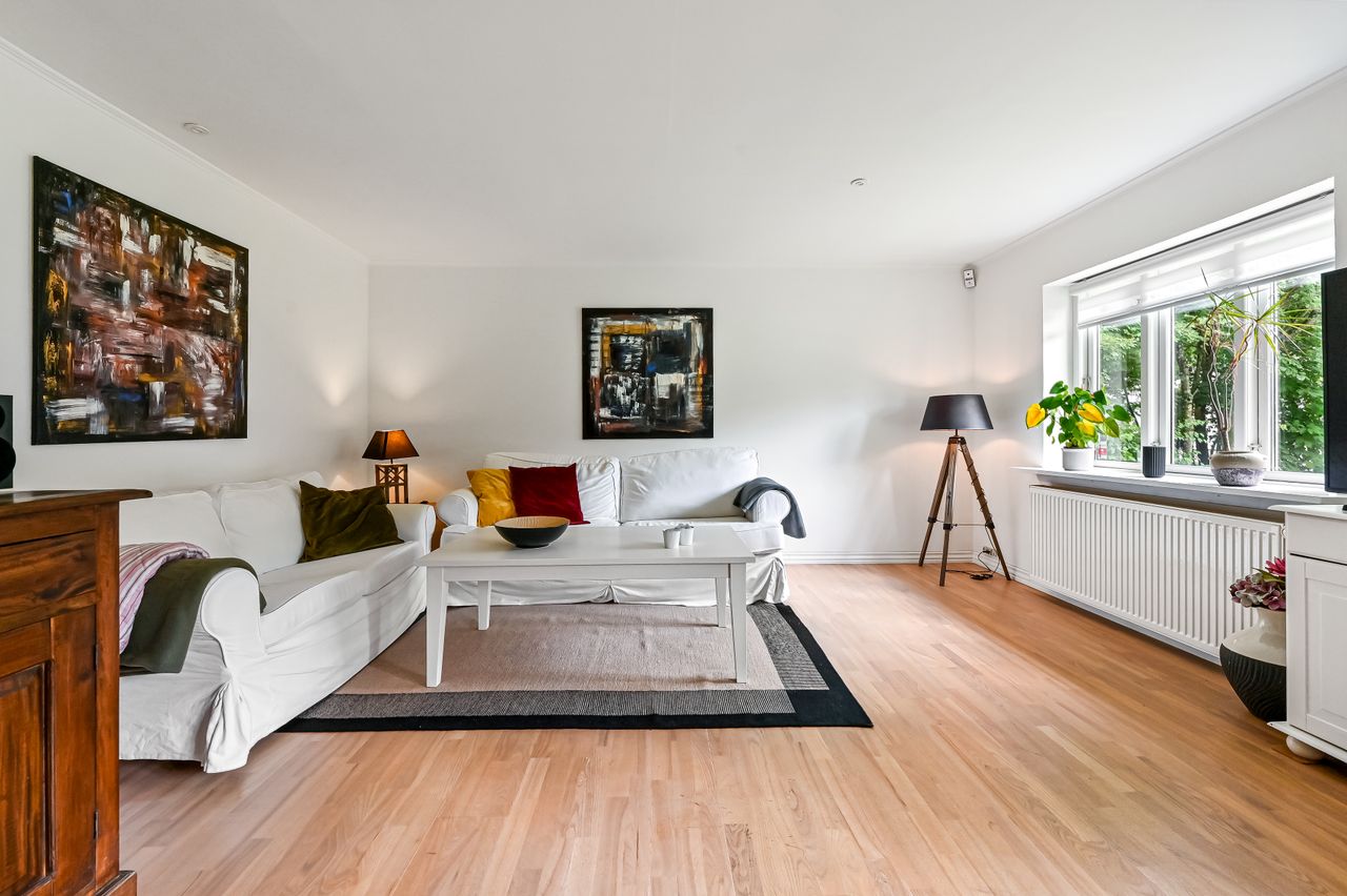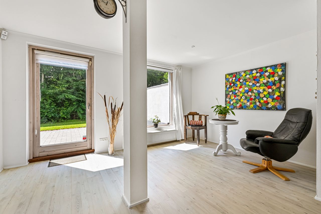 Stuen præsenterer sig flot, med et godt lysindfald gennem de store vinduer, samt en fransk dør mellem køkkenet og stuen, som skaber en harmonisk overgang mellem rummene.