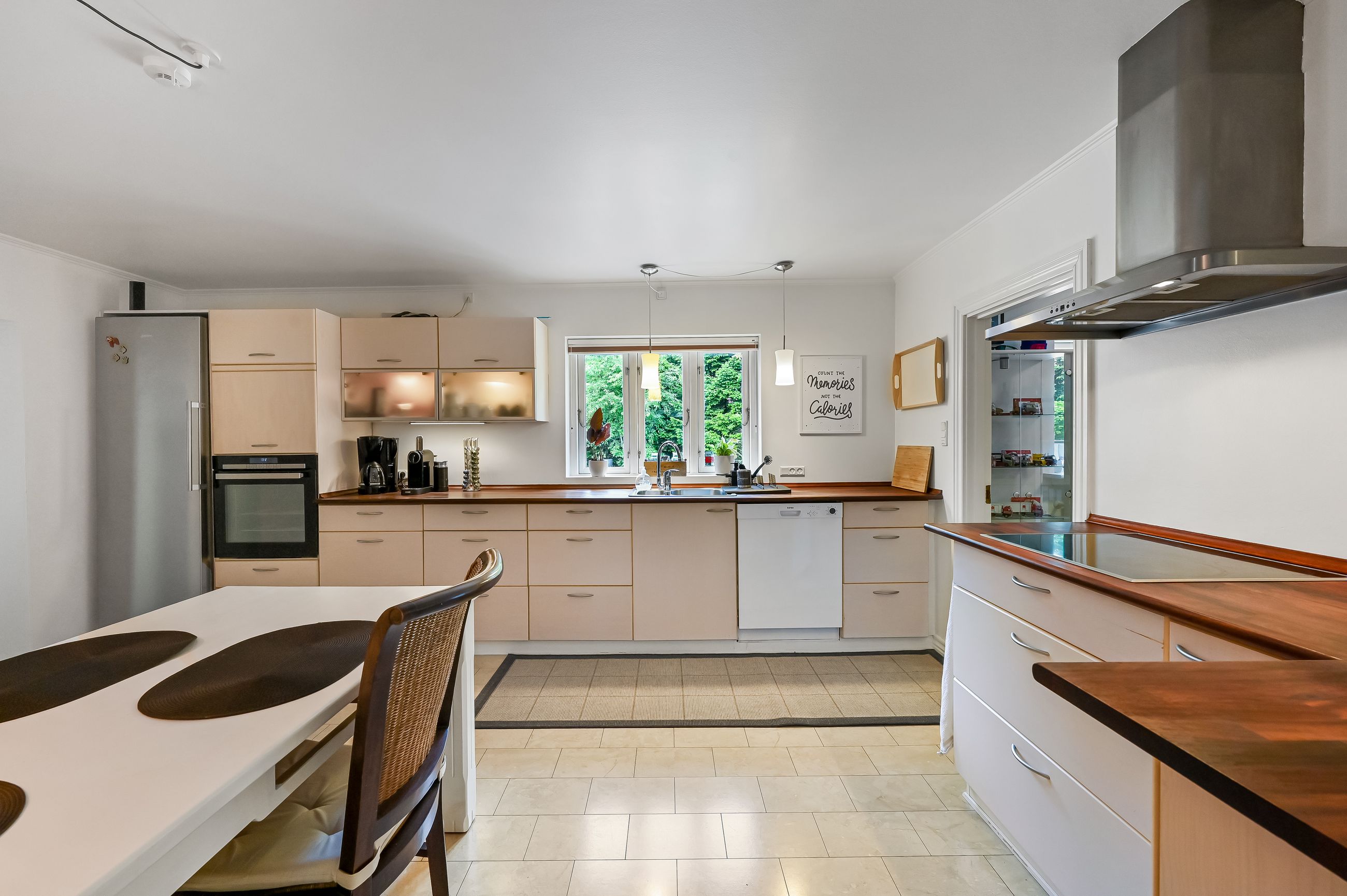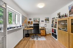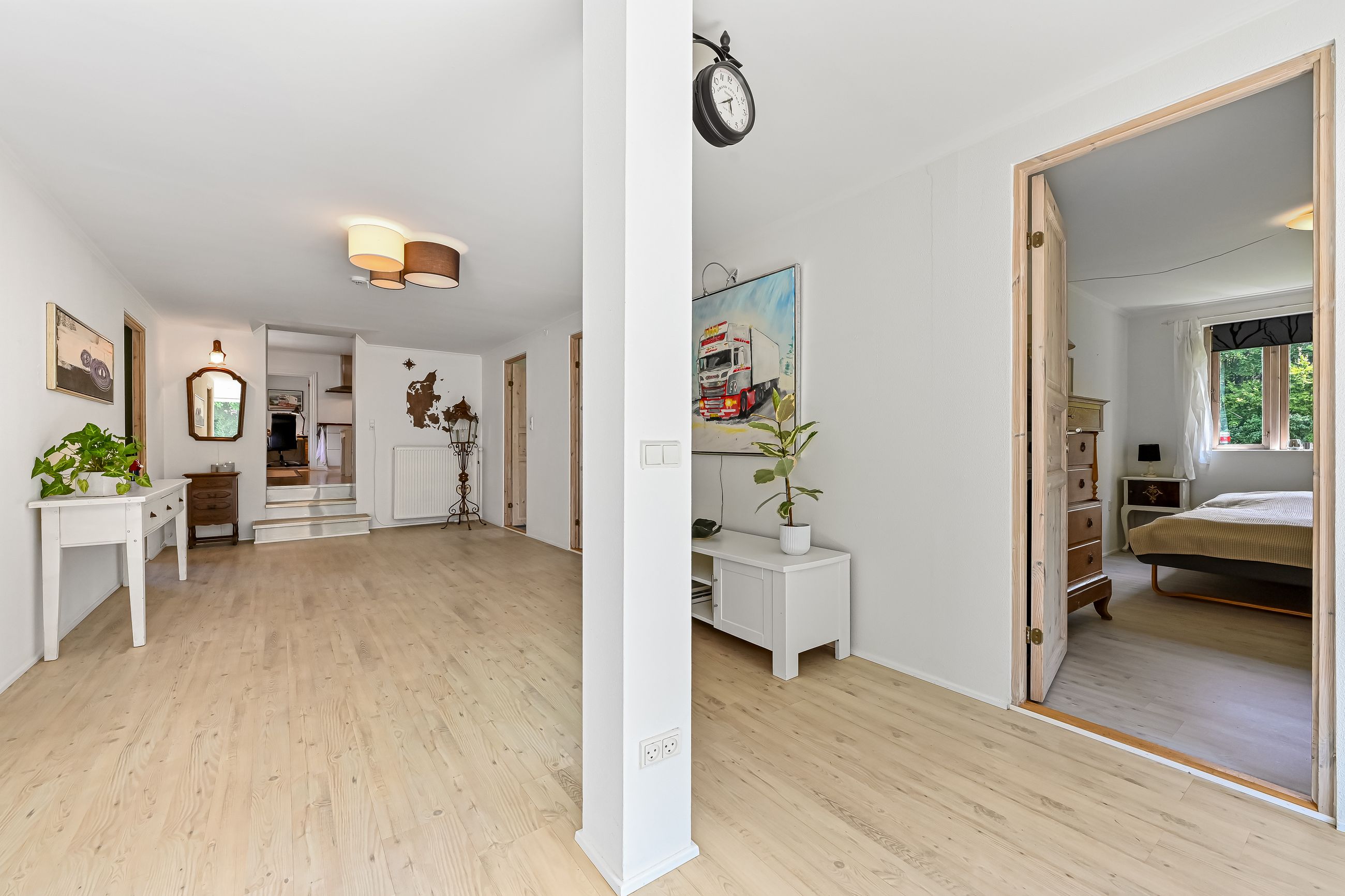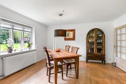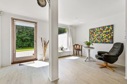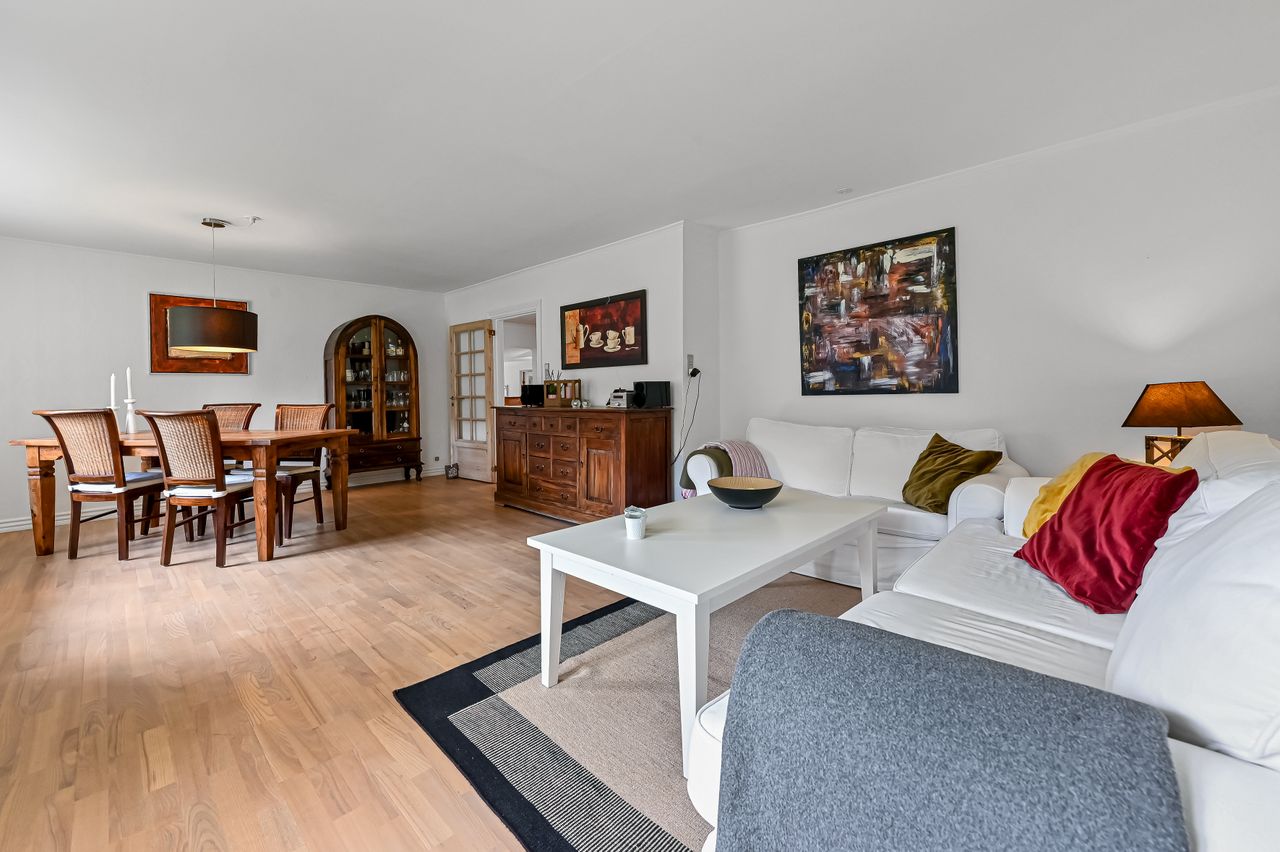 Stuen præsenterer sig flot, med et godt lysindfald gennem de store vinduer, samt en fransk dør mellem køkkenet og stuen, som skaber en harmonisk overgang mellem rummene.