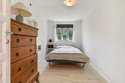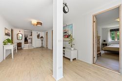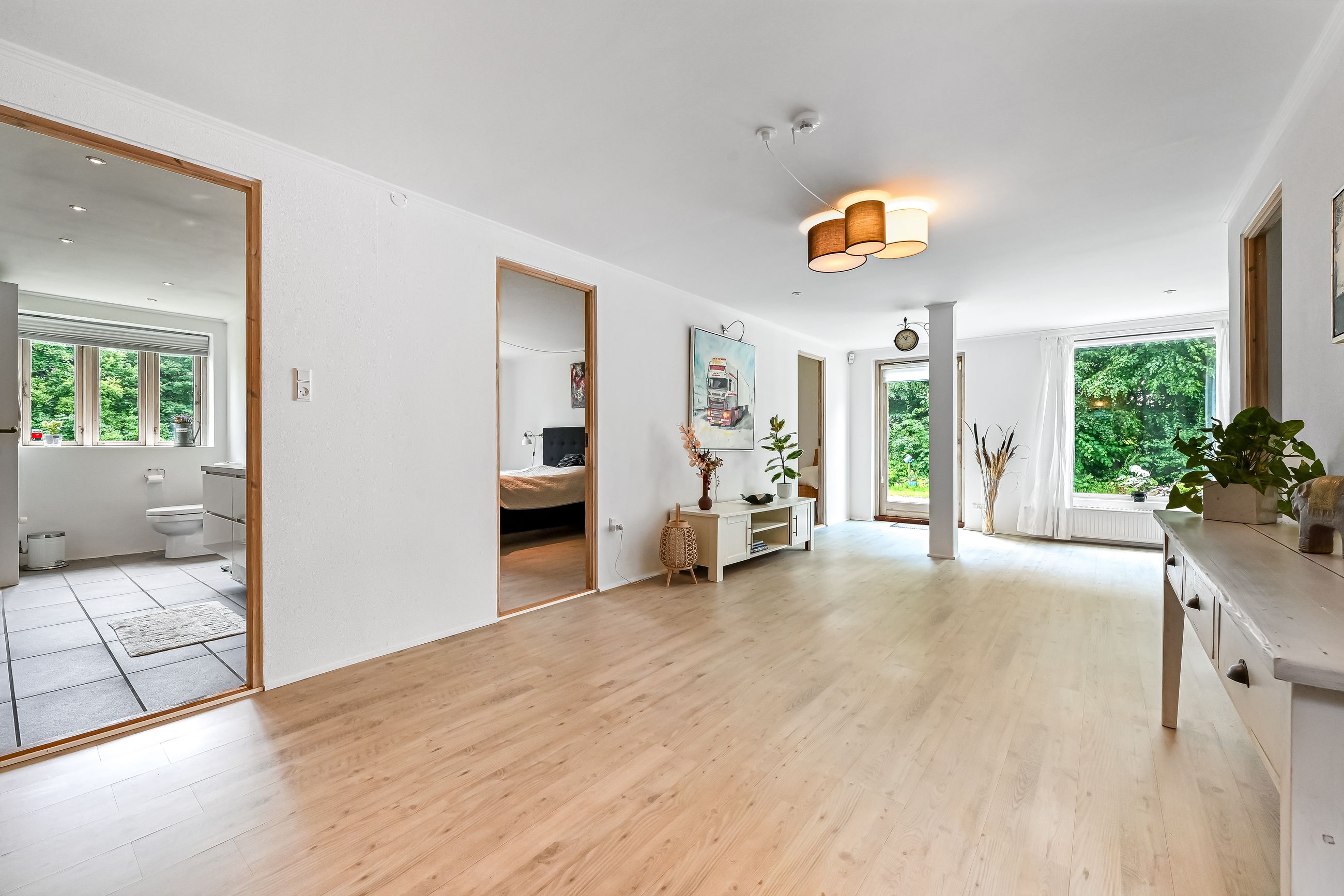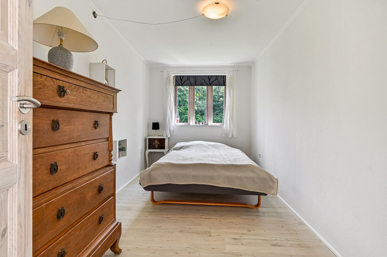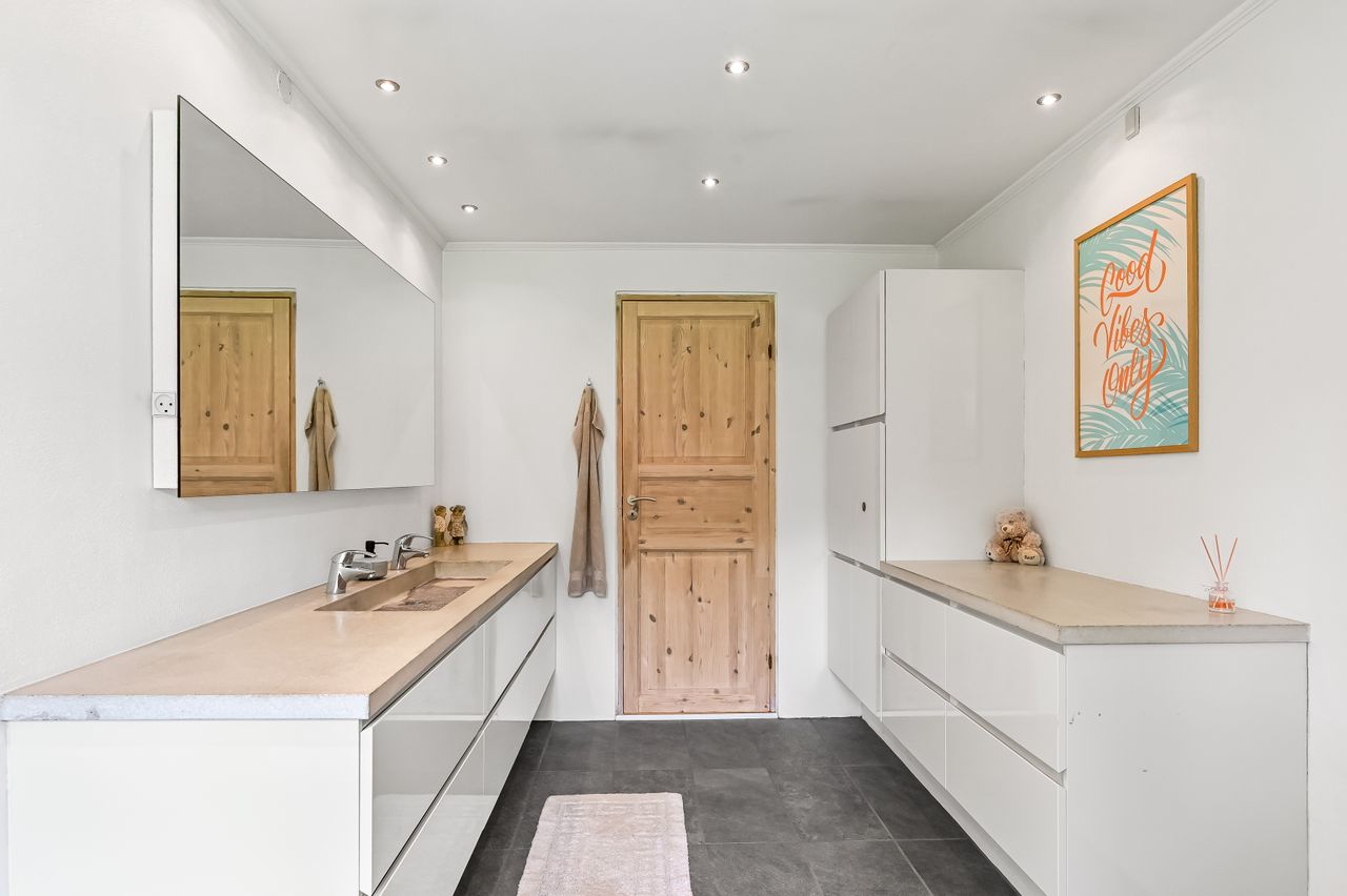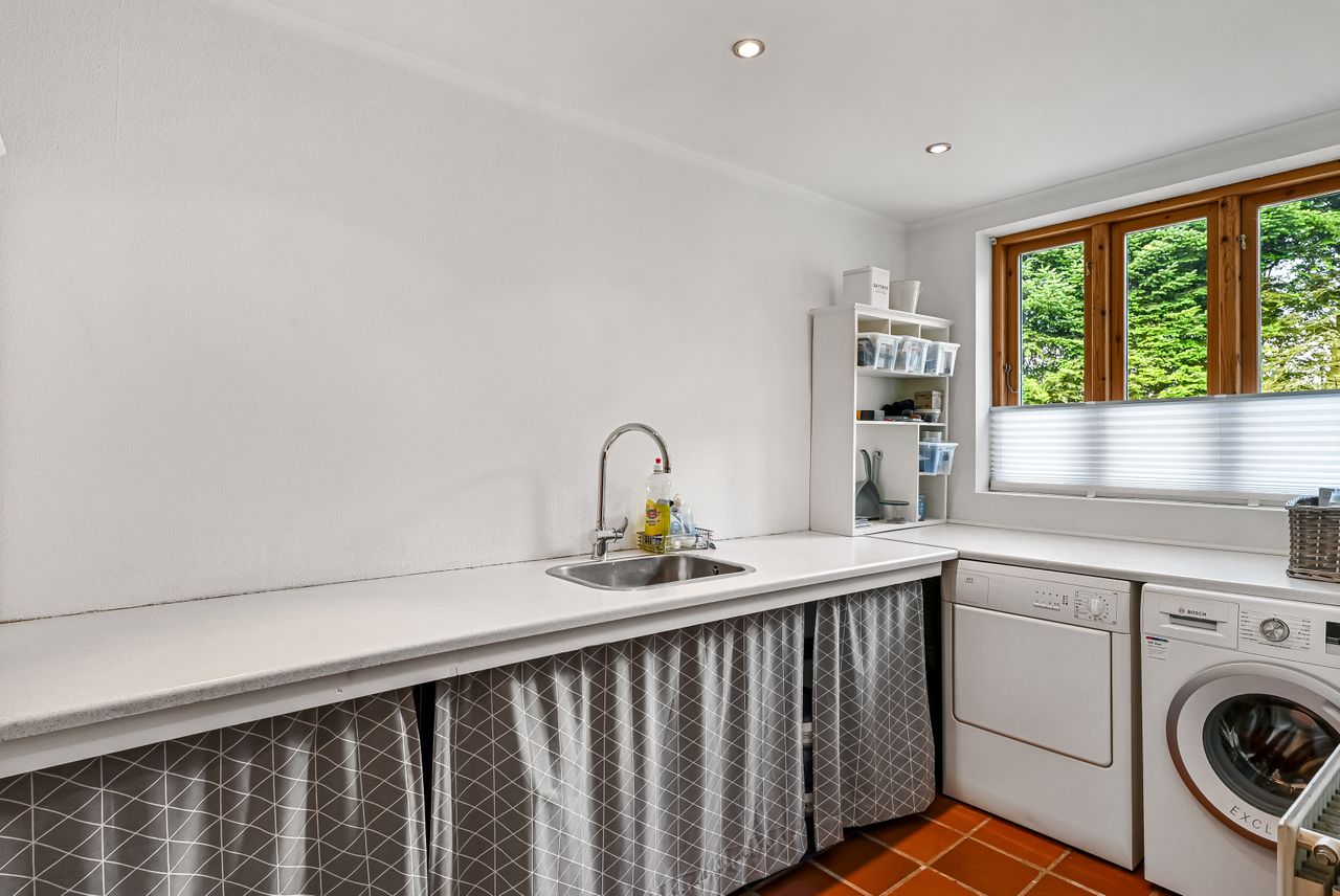Du bydes velkommen i en lille entré der har direkte adgang til et praktisk bryggers med skabe og god bordplads. Fra entréen ledes du videre ind i boligens store multirum. Det lyse og åbne multirum fungerer som fordelingsgang og opholdsrum, med direkte udgang til en dejlig terrasse. Herfra er der adgang til to hyggelige værelser samt et soveværelse, med en skabsvæg. Badeværelset imponerer med sin moderne stil, der er lyst og elegant indrettet med bl.a to håndvaske.