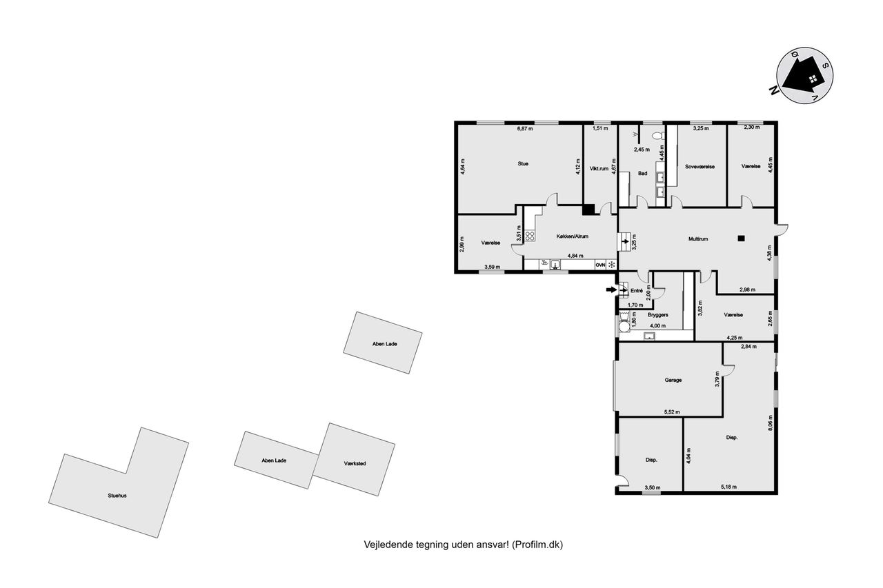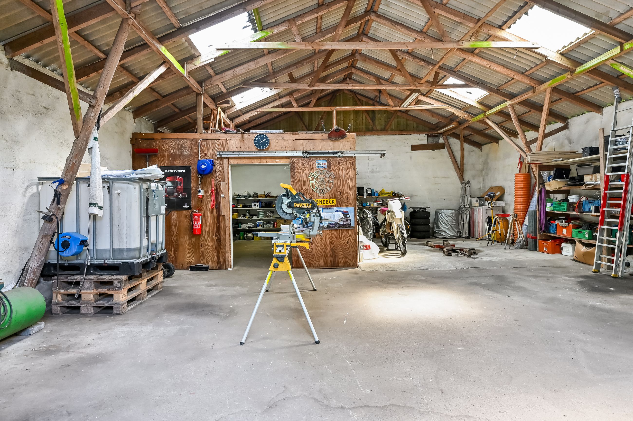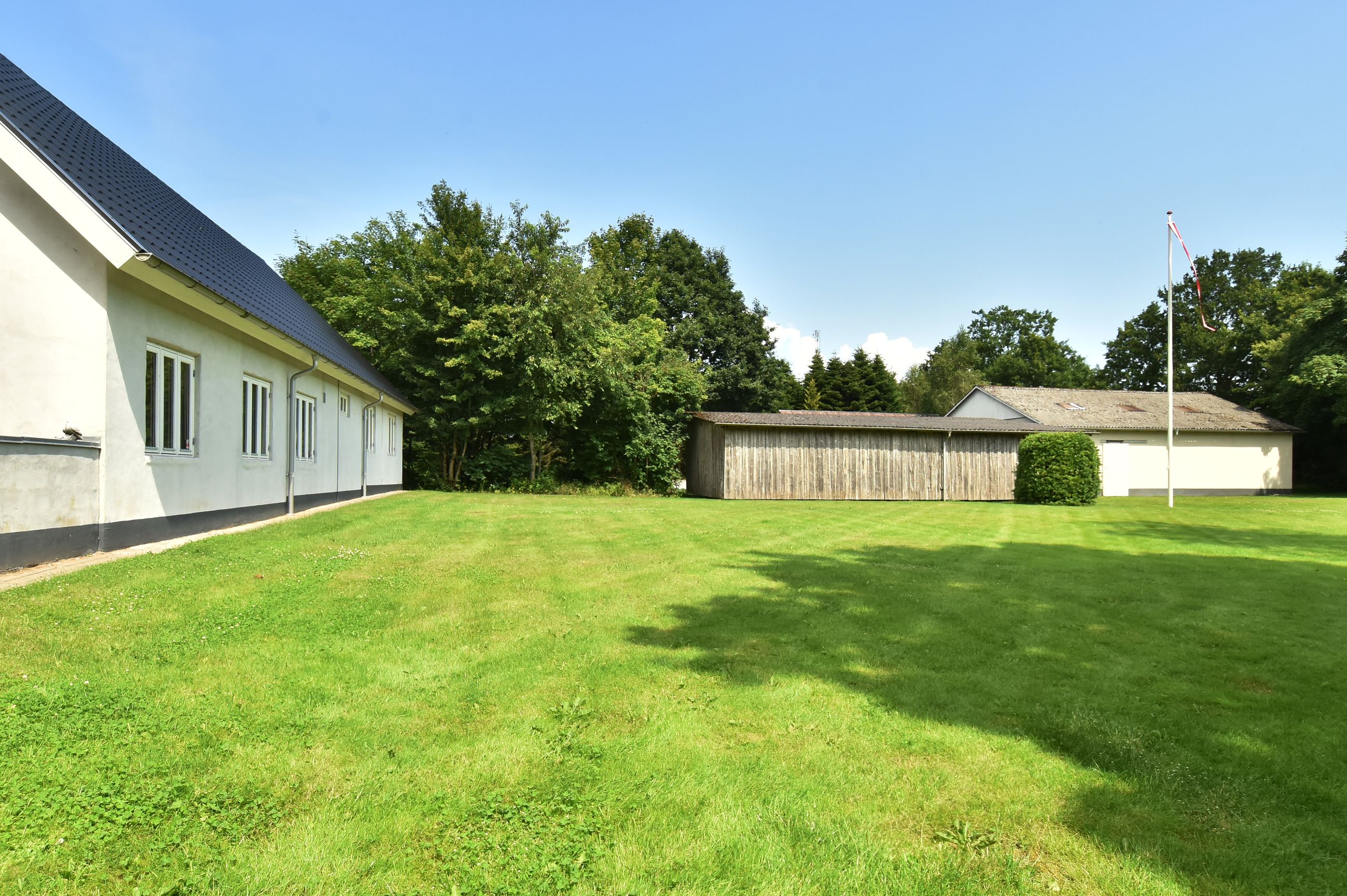 Til ejendommen hører også nogle gode udhusbygninger, som byder på bl.a. en værkstedsbygning der velegnet til større maskiner eller campingvogne.