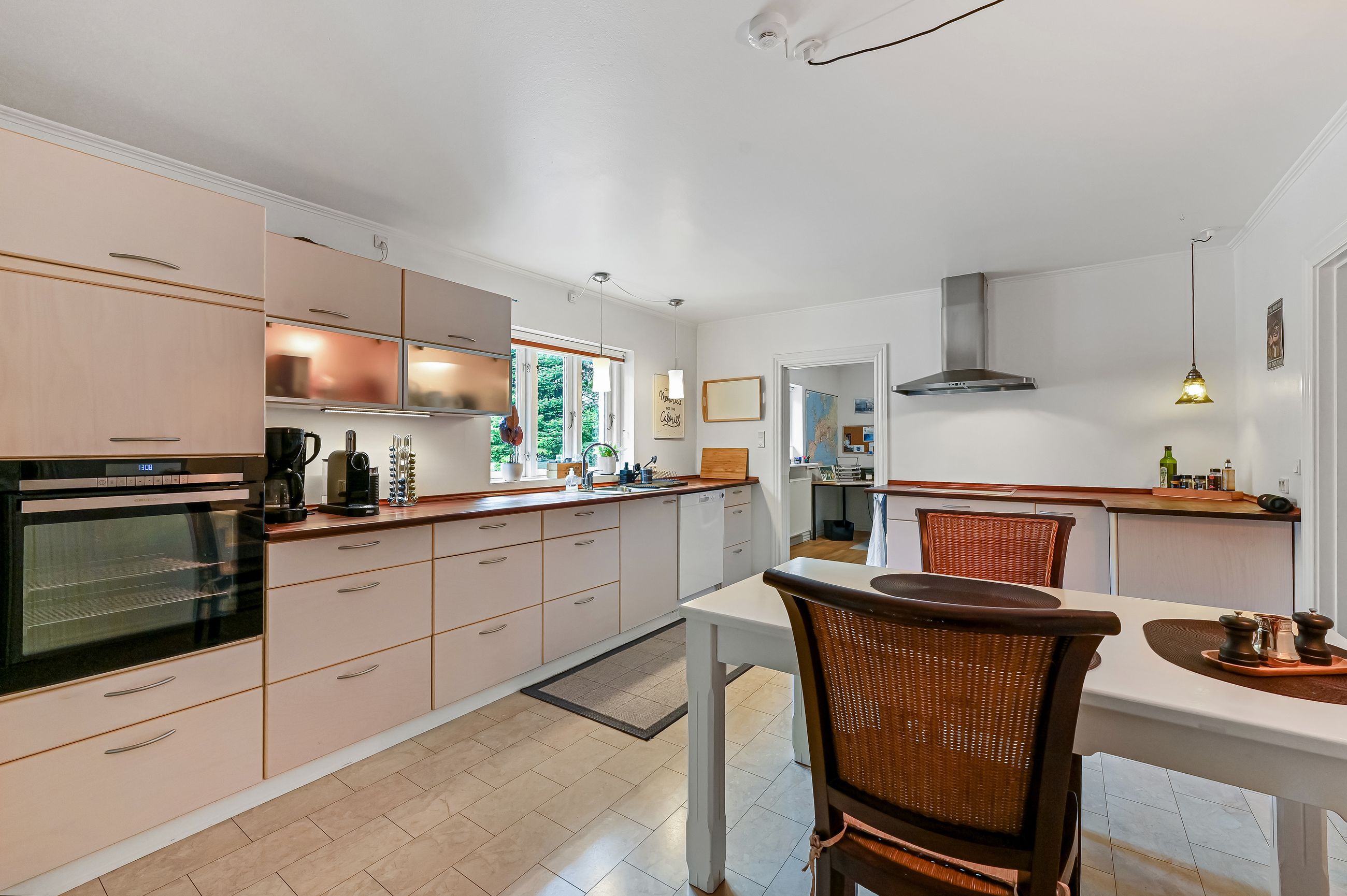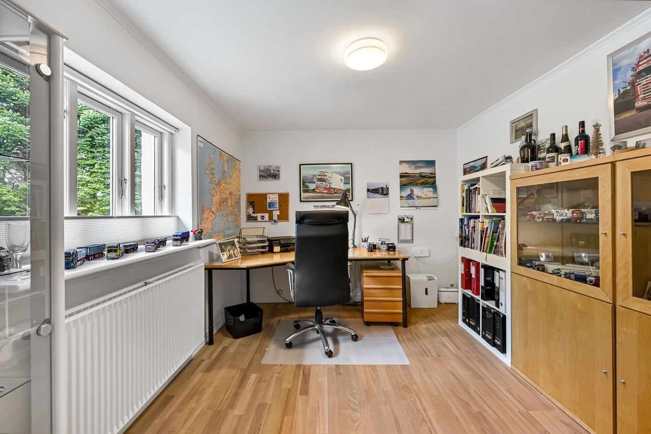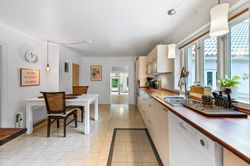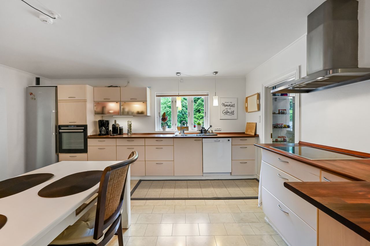 Fra multirummet fører to trin op til køkkenet, her er plads til en spisekrog og selve køkkenet fremstår velholdt. I forbindelse med køkkenet findes et viktualierum. Derudover er der mulighed for at indrette enten kontor, legerum eller et lille værelse alt efter behov, i forlængelse af køkkenet.