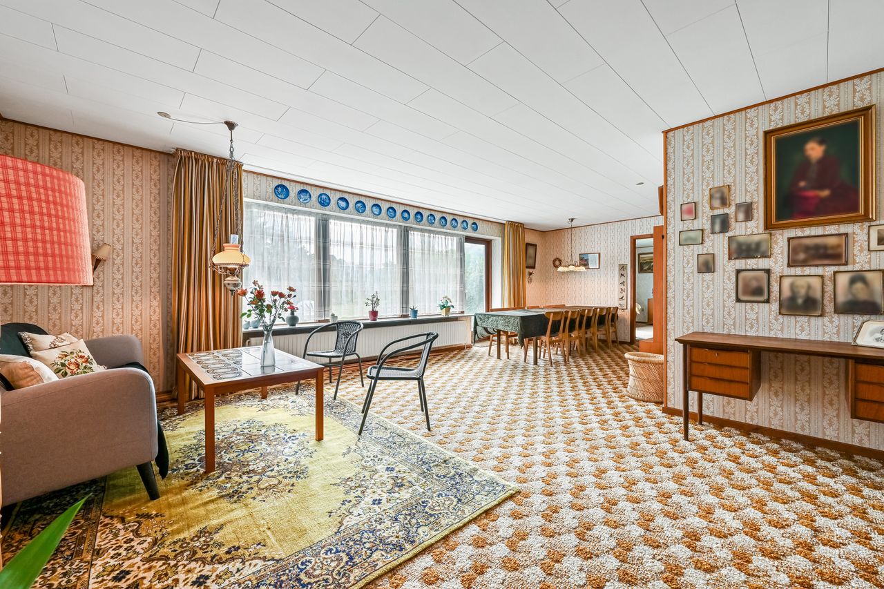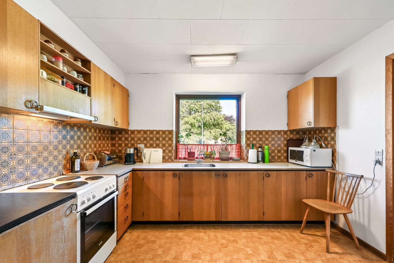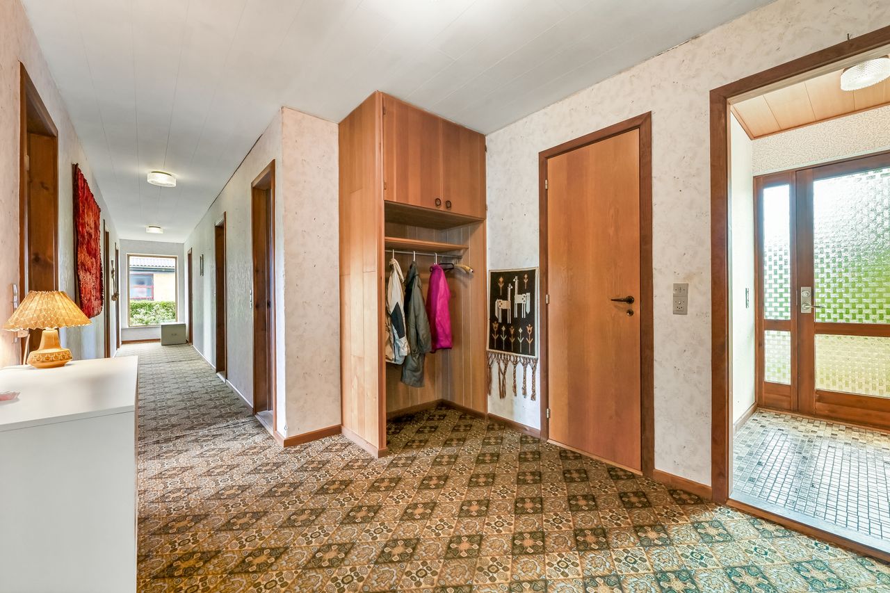 Villen er opført i 1975 og fremstår meget oprindelig men pænt. Indenfor er en gennemtænkt planløsning. Når du kommer ind af entrédøren træder du ind i husets lyse fordelingsgang, hvorfra du ledes rundt i hele huset. Husets køkken har en god størrelse og har plads til en spisekrog. Husets bryggers har plads til vaskemaskine og andre praktiske gøremål. Den store vinkelstue imponerer med sit fantastiske lysindfald fra de store vinduer samt direkte udgang til haven, hvilket giver mulighed for at skabe et harmonisk indendørs-udendørs liv. Her er god plads til langbord hvor familien og husets gæster kan samles.