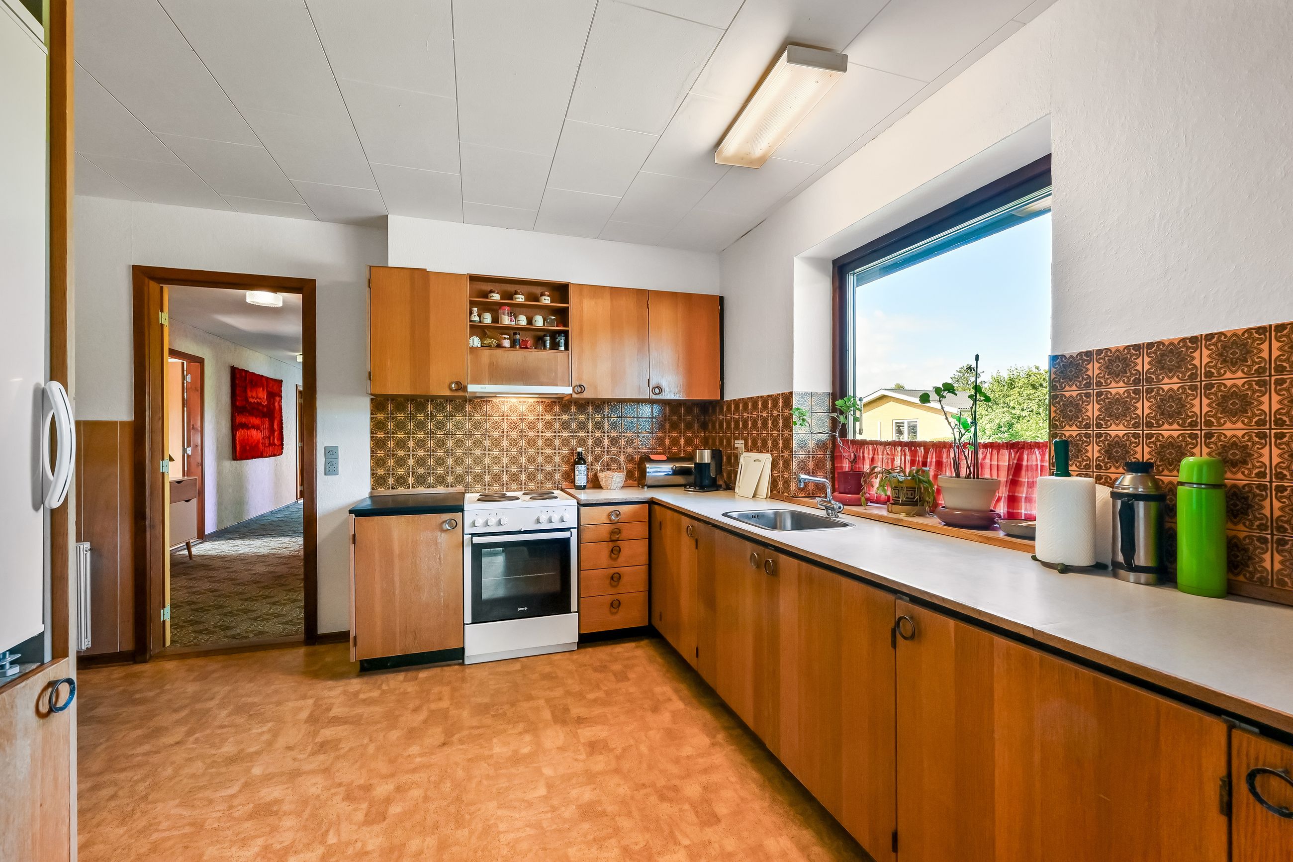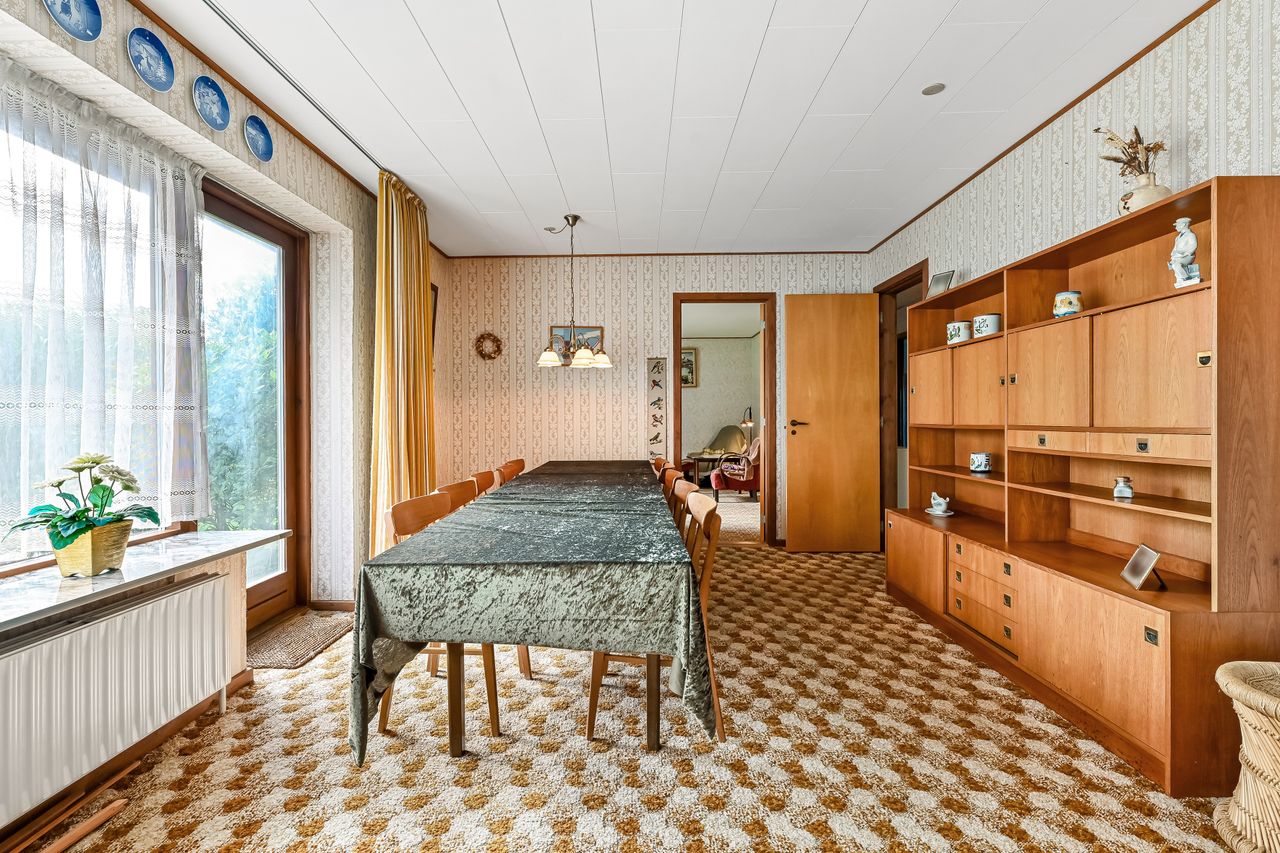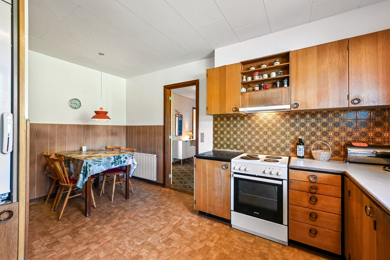 Villen er opført i 1975 og fremstår meget oprindelig men pænt. Indenfor er en gennemtænkt planløsning. Når du kommer ind af entrédøren træder du ind i husets lyse fordelingsgang, hvorfra du ledes rundt i hele huset. Husets køkken har en god størrelse og har plads til en spisekrog. Husets bryggers har plads til vaskemaskine og andre praktiske gøremål. Den store vinkelstue imponerer med sit fantastiske lysindfald fra de store vinduer samt direkte udgang til haven, hvilket giver mulighed for at skabe et harmonisk indendørs-udendørs liv. Her er god plads til langbord hvor familien og husets gæster kan samles.