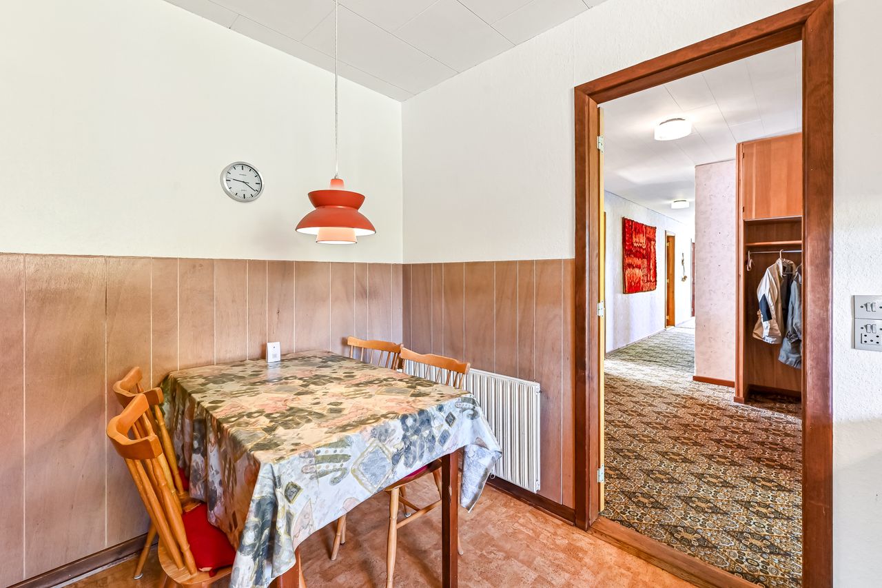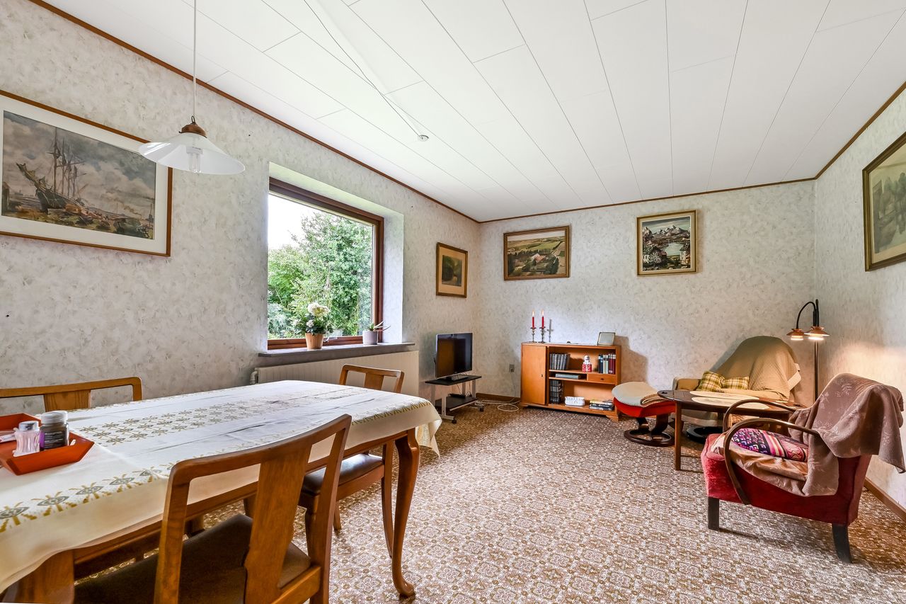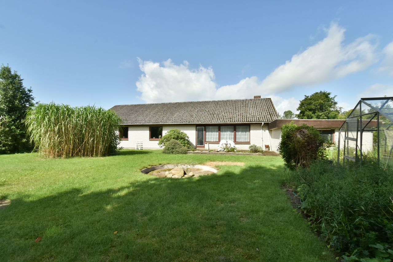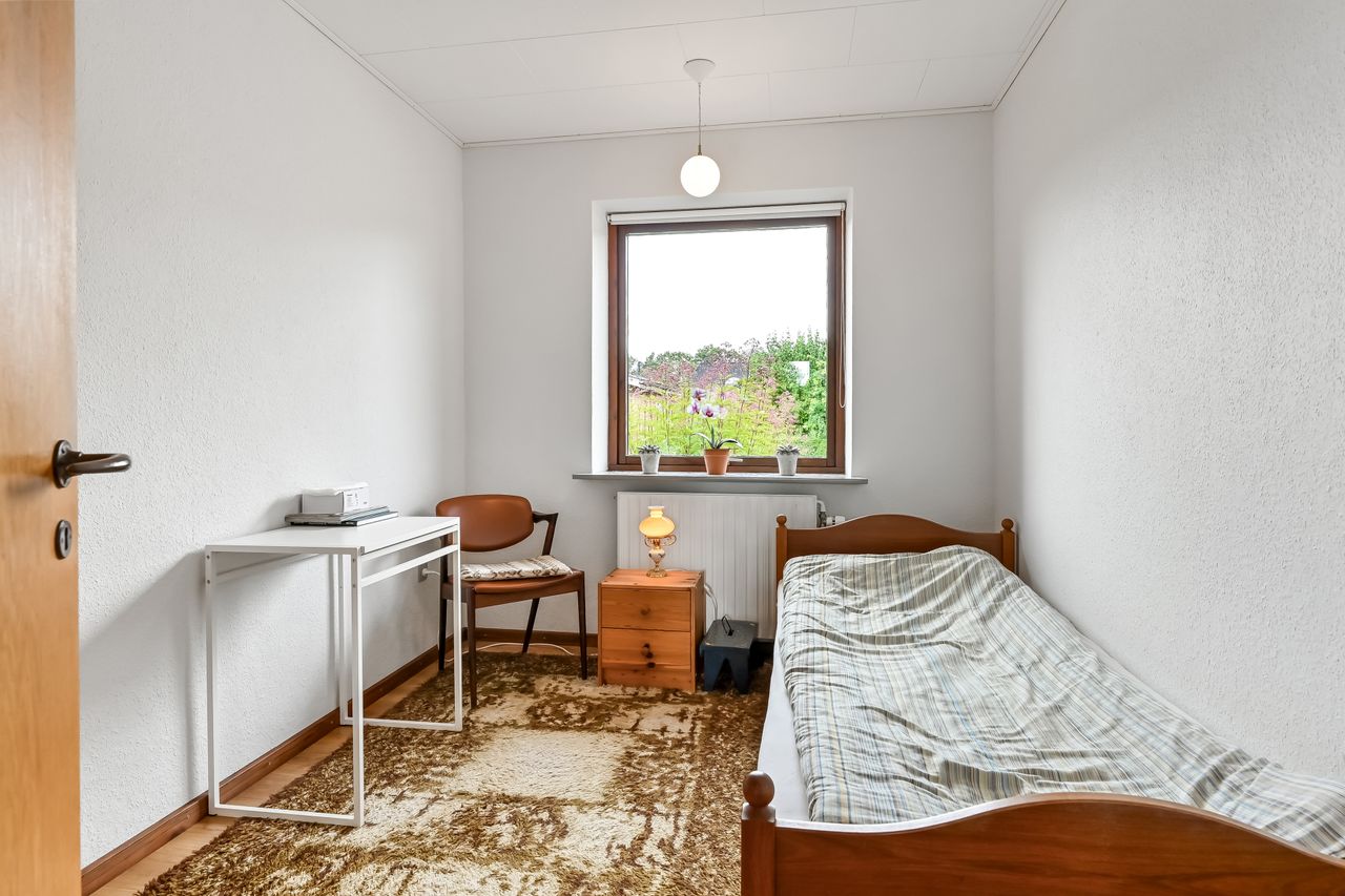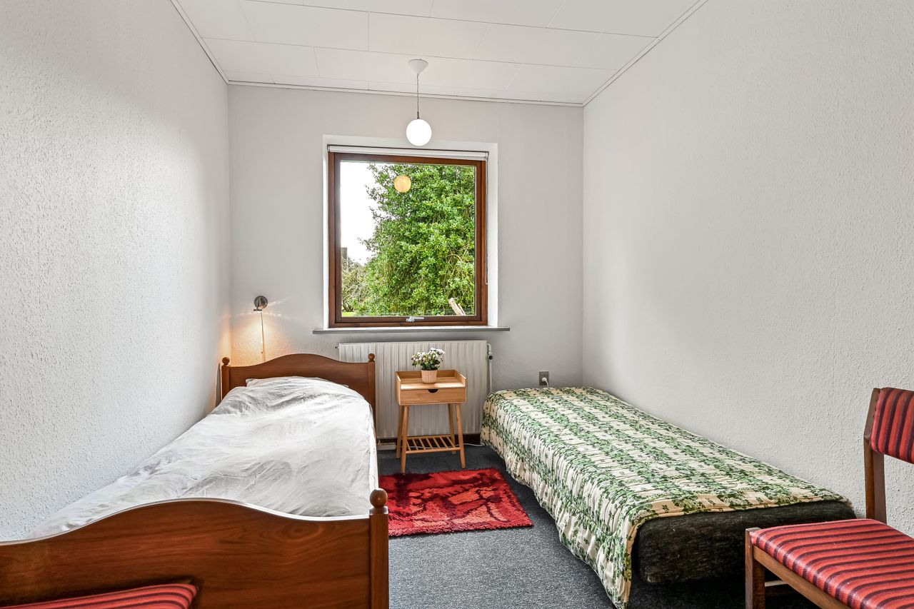 Udover stuen findes der også et mindre dagligstueområde eller et ekstra stort værelse alt efter behov. For enden af fordelingsgangen finder du husets 3 fine værelser og soveværelset der har indbygget skabsvæg. Sidst rummer huset et badeværelse, der er lyst og pænt og har gulvvarme, samt et disponibelt rum, som kan anvendes efter eget ønske.