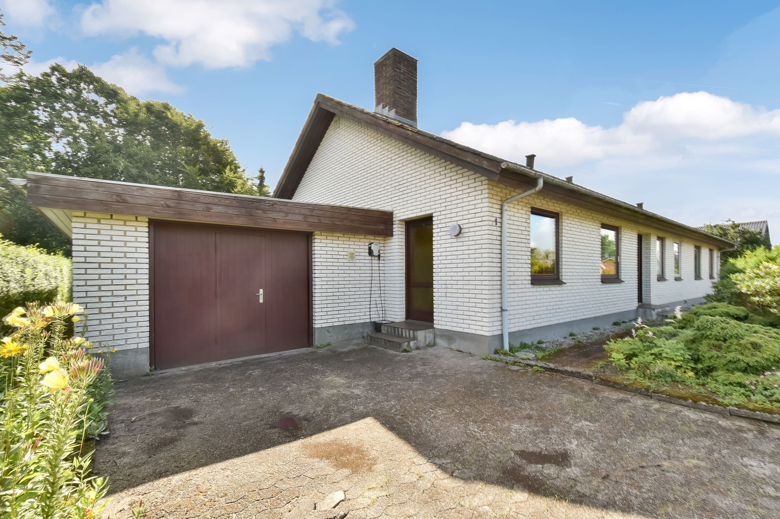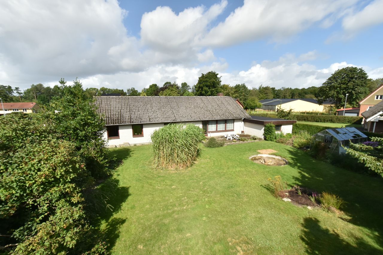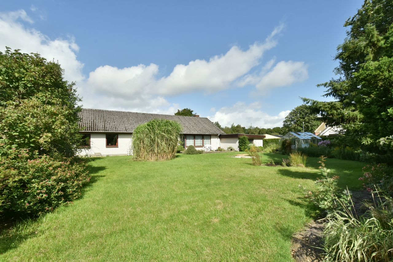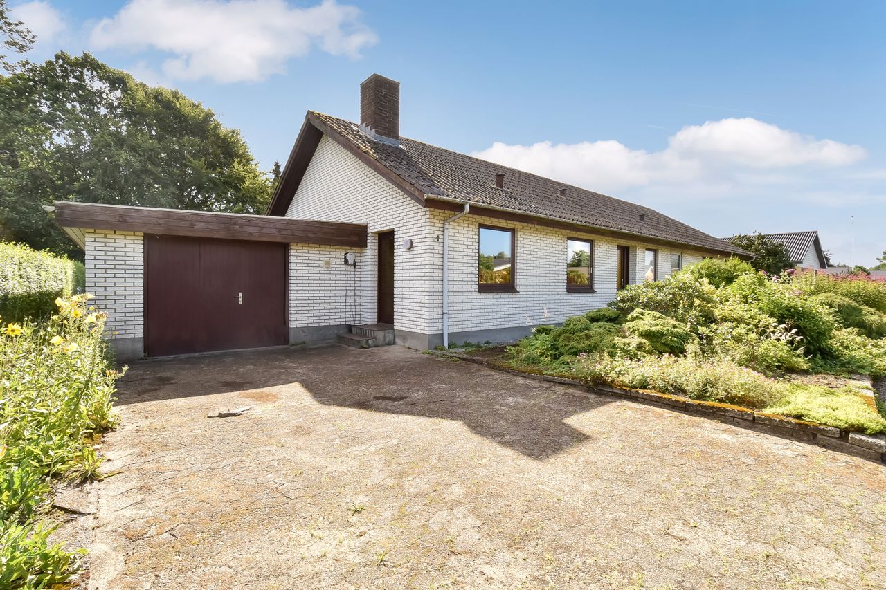 Udendørs finder du en charmerende lille forhave med buske samt en imponerende stor garage på 50m2, der er perfekt til bilentusiasten, ekstra opbevaringsplads, eller lille værkstedsplads. Haven bag huset er privat og rummelig med få bede, hvilket gør den nem at vedligeholde samtidig med at den tilbyder masser af plads til leg eller afslapning.
