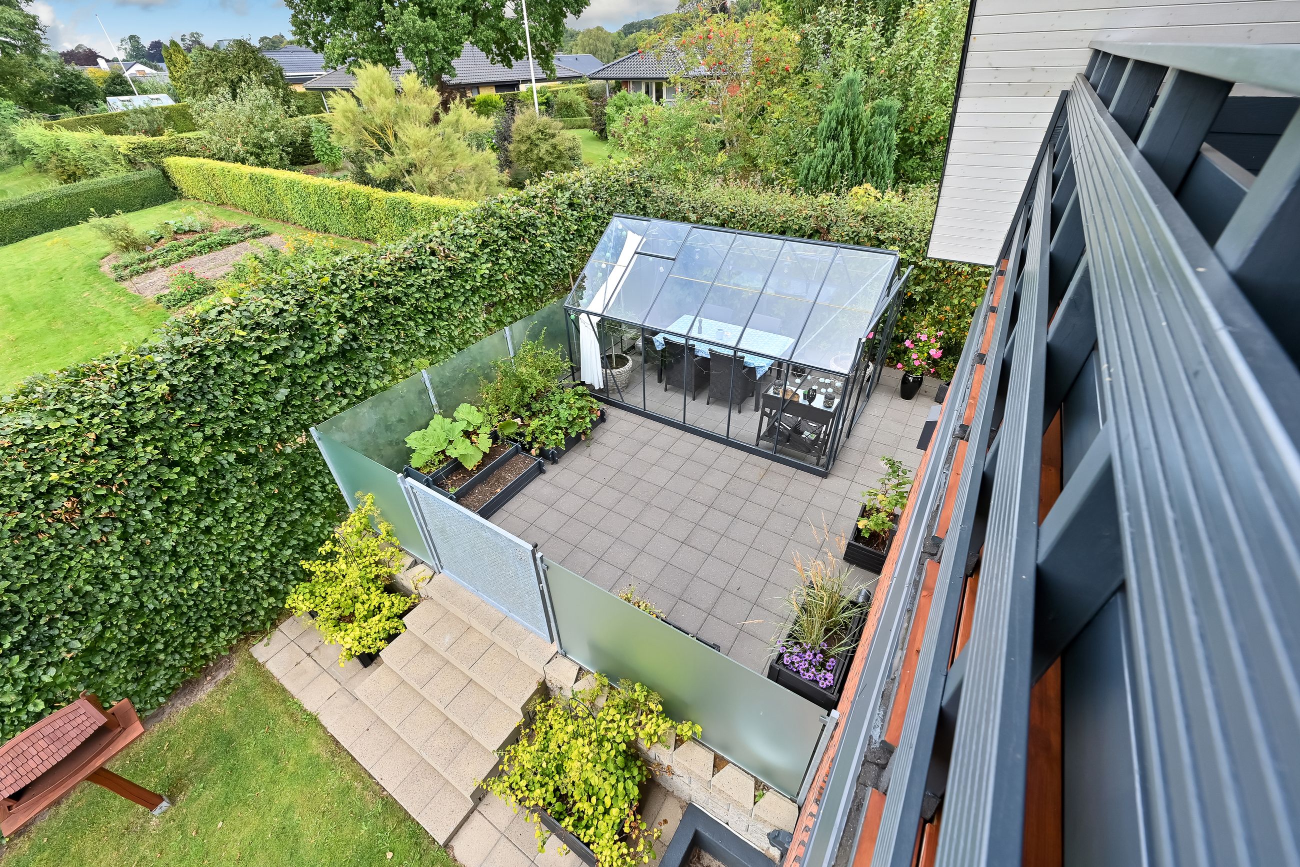 Haven er en oase for sig selv med flere læfulde områder skabt på grunden. Der er nye flisebelægninger, hegn udelukkende lavet af vedligeholdelsesfrie materialer samt et flot orangeri nær køkkenets terrasse og et loungeområde skabt under den flotteste pergola.