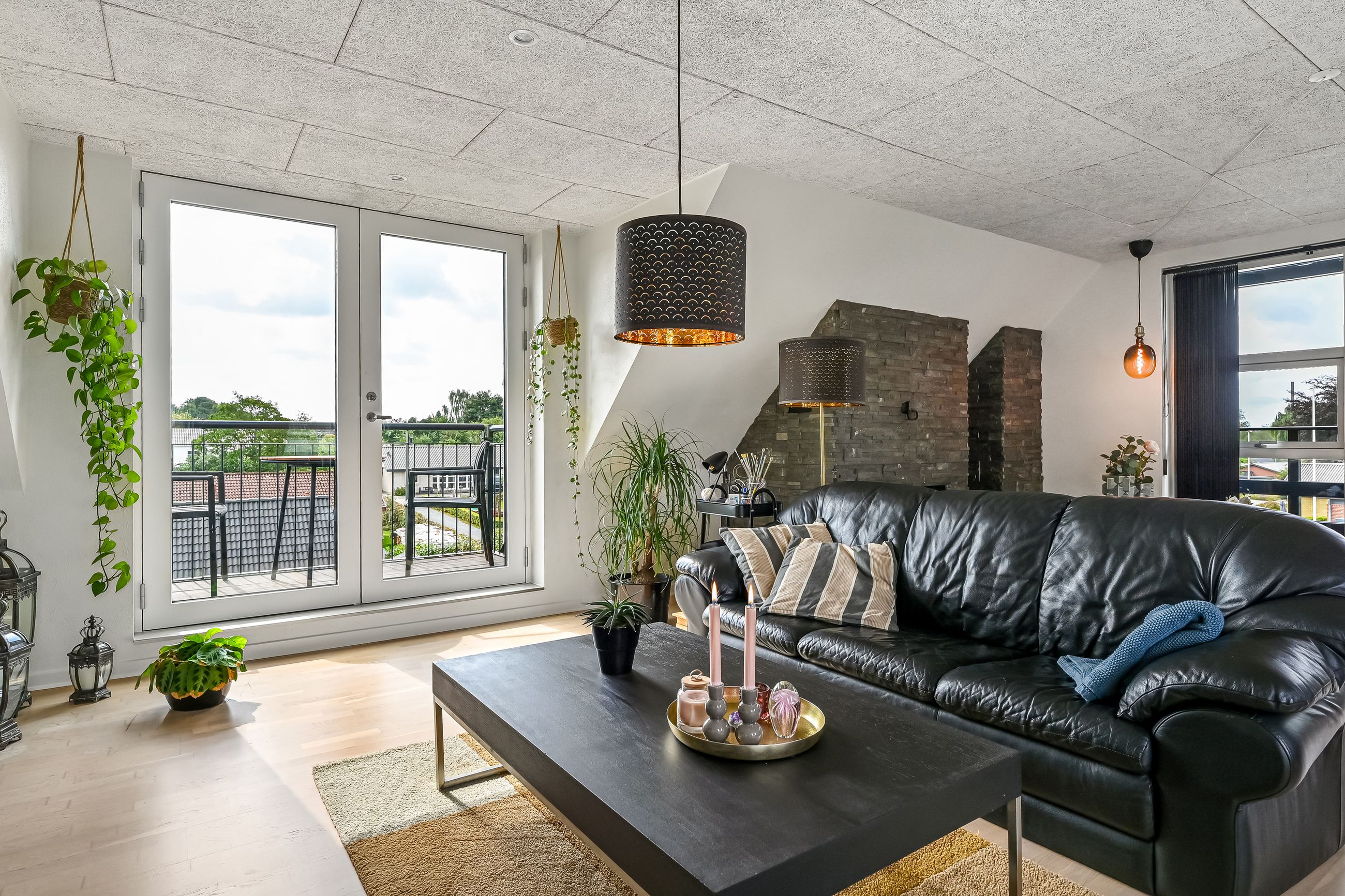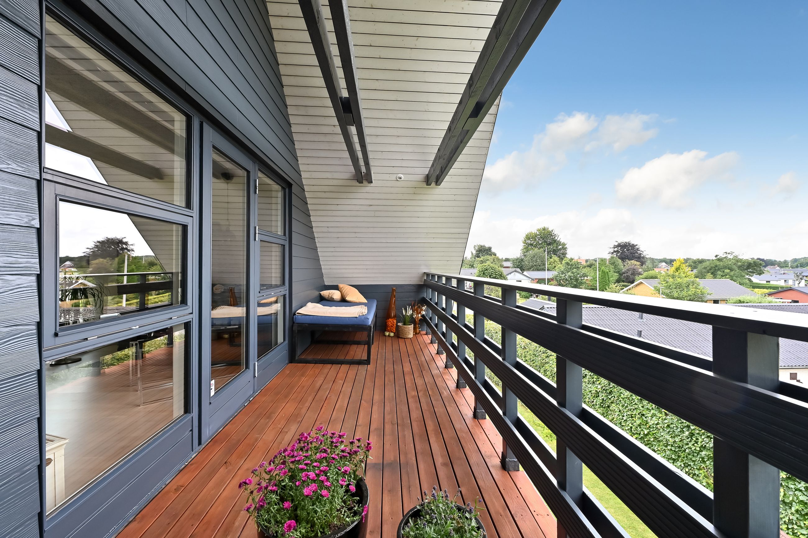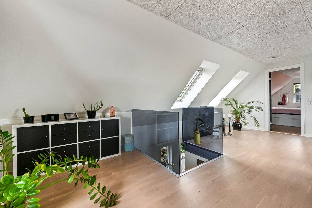 På øverste plan finder I en mere privat stue med udgang til ikke bare én men hele to altaner - én mod syd og én mod vest - hvorfra der er udsigt over området.