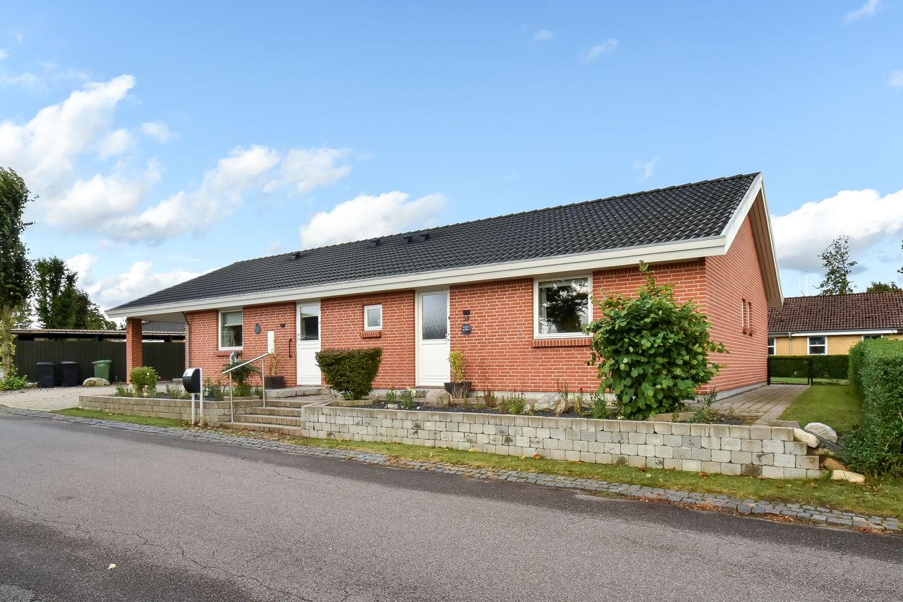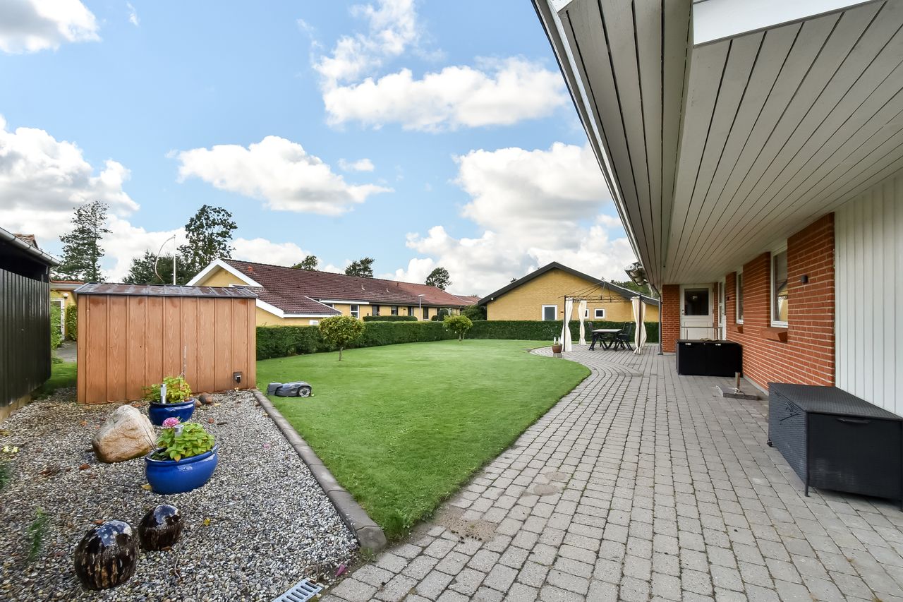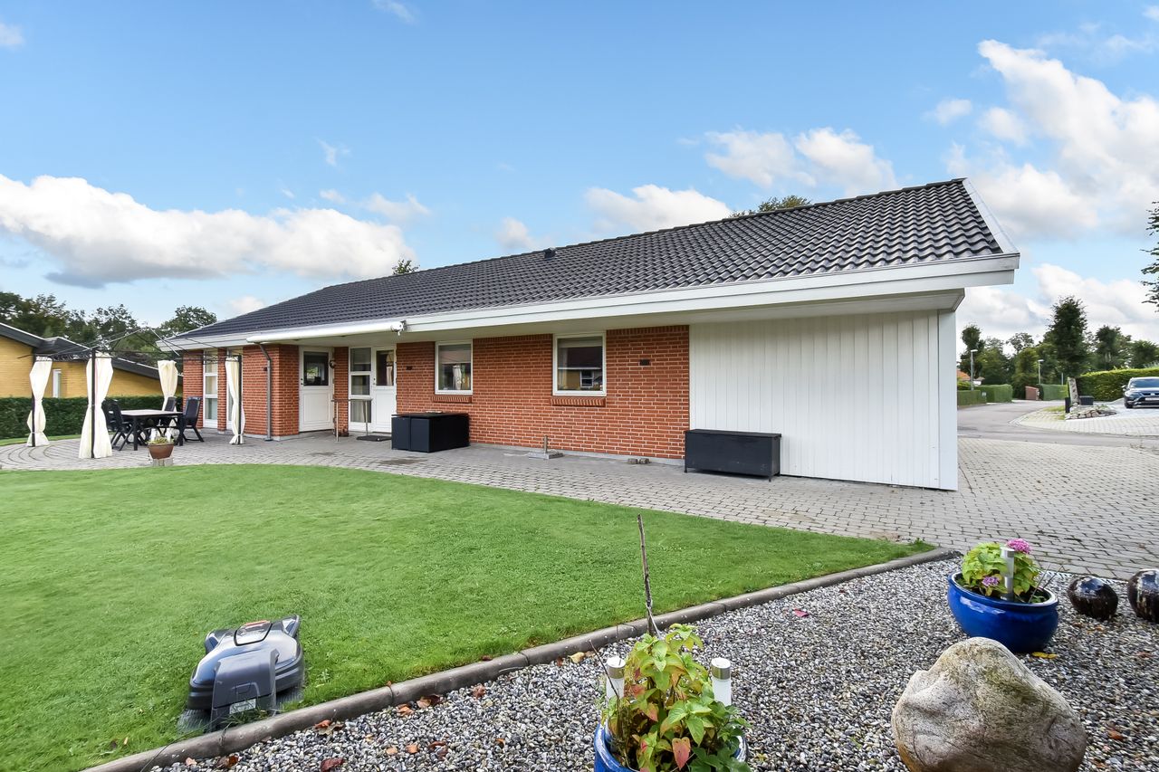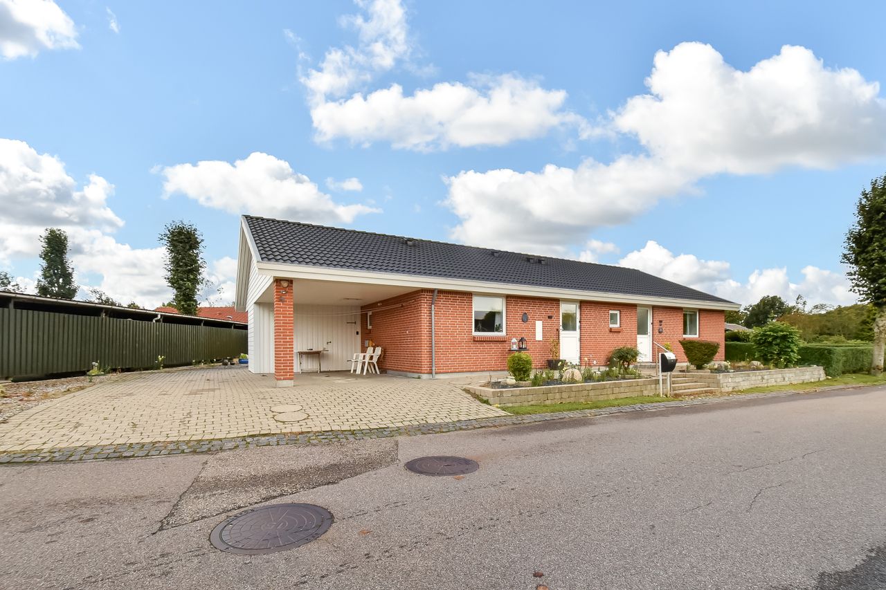 Udendørsarealerne kræver minimal vedligeholdelse med den flisebelagte indkørsel, som fører direkte op til carporten. Forhaven præsenterer sig pænt med simple bede mens baghaven hovedsageligt består af græsplæne med få buske samt en dejlig flisebelagt terrasse – perfekt til sommerens grillfester eller stille eftermiddage med en god bog.
