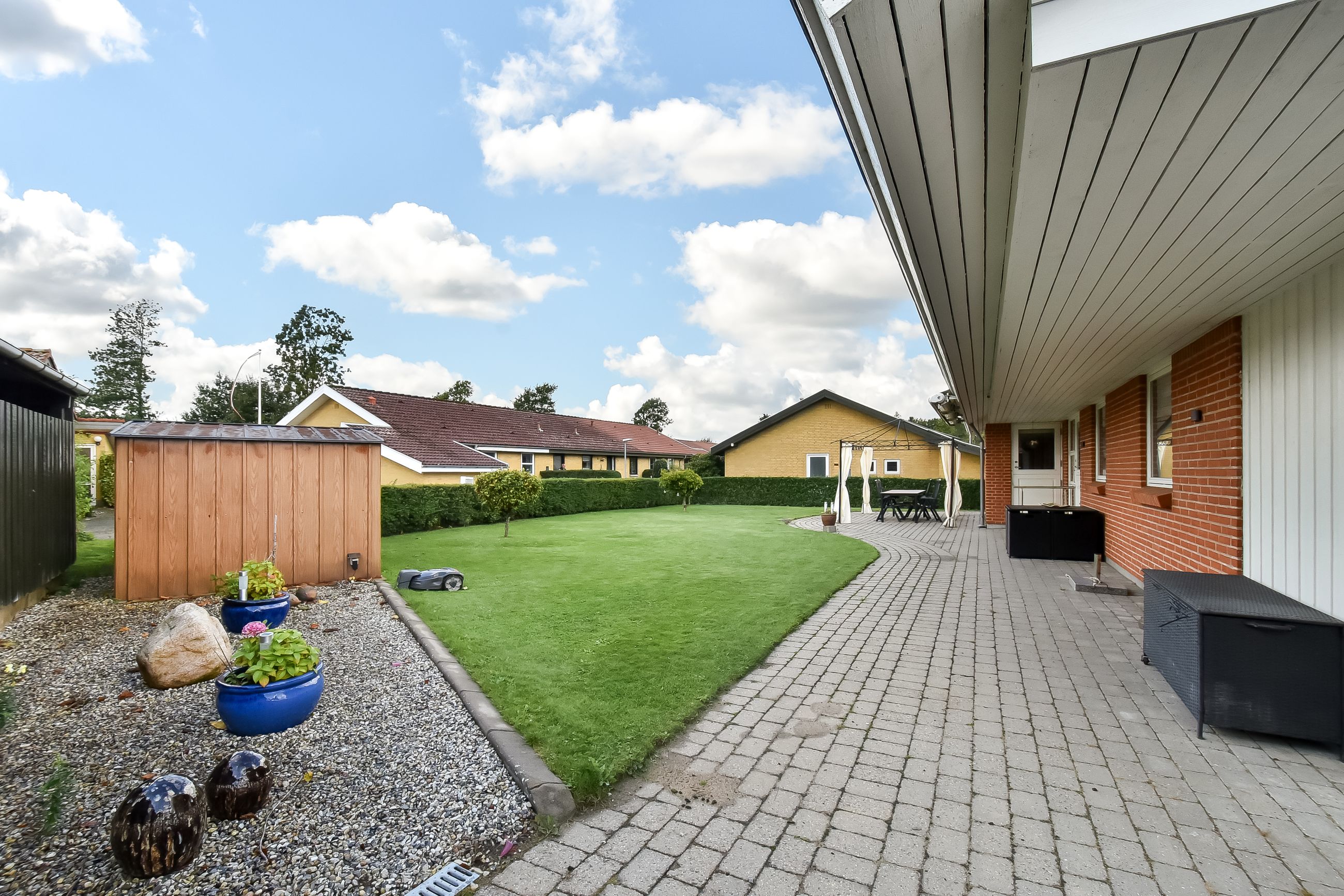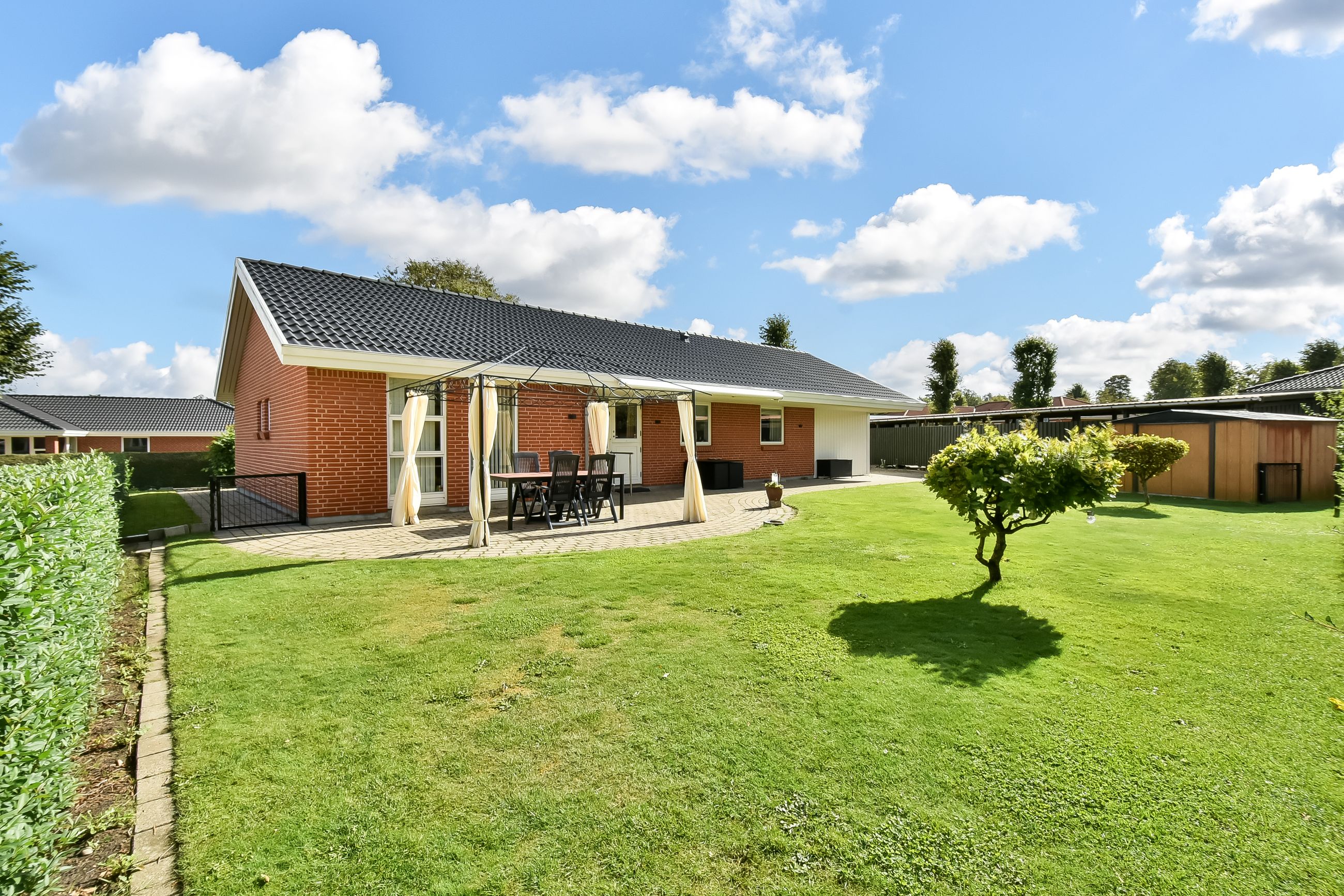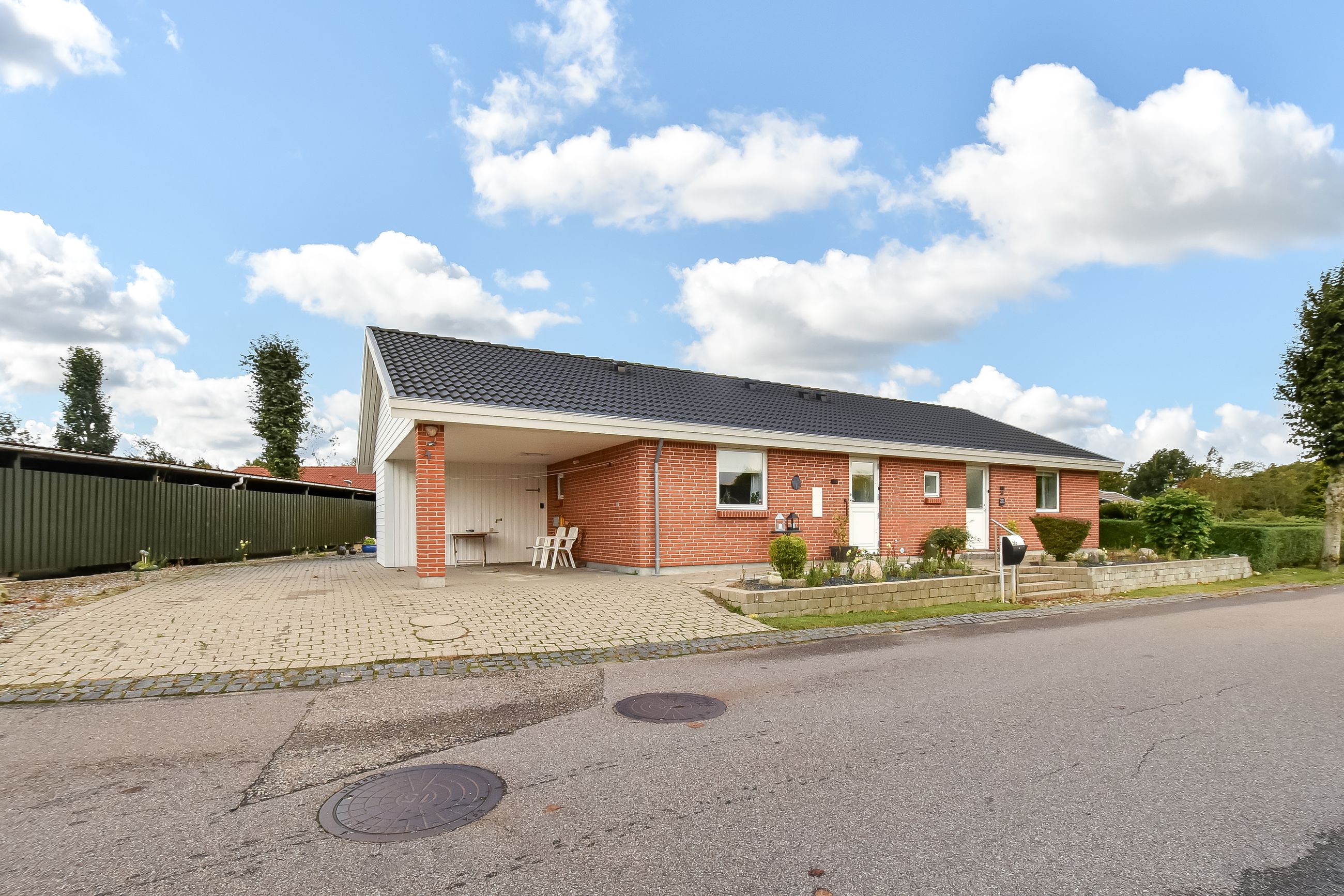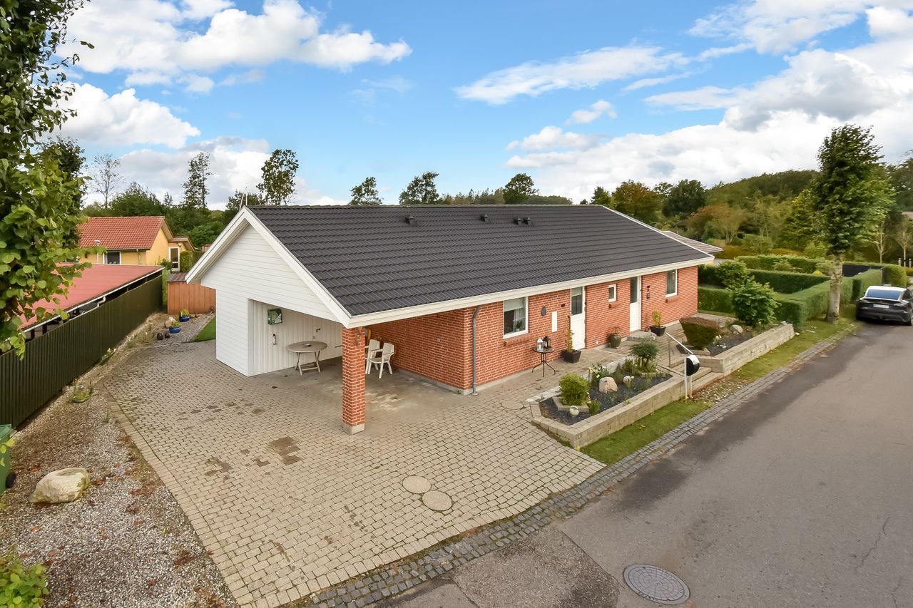 Udendørsarealerne kræver minimal vedligeholdelse med den flisebelagte indkørsel, som fører direkte op til carporten. Forhaven præsenterer sig pænt med simple bede mens baghaven hovedsageligt består af græsplæne med få buske samt en dejlig flisebelagt terrasse – perfekt til sommerens grillfester eller stille eftermiddage med en god bog.