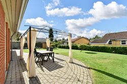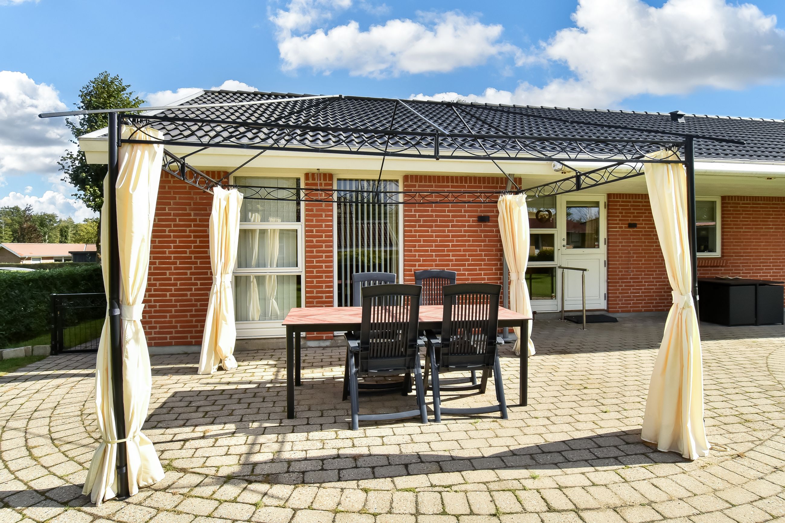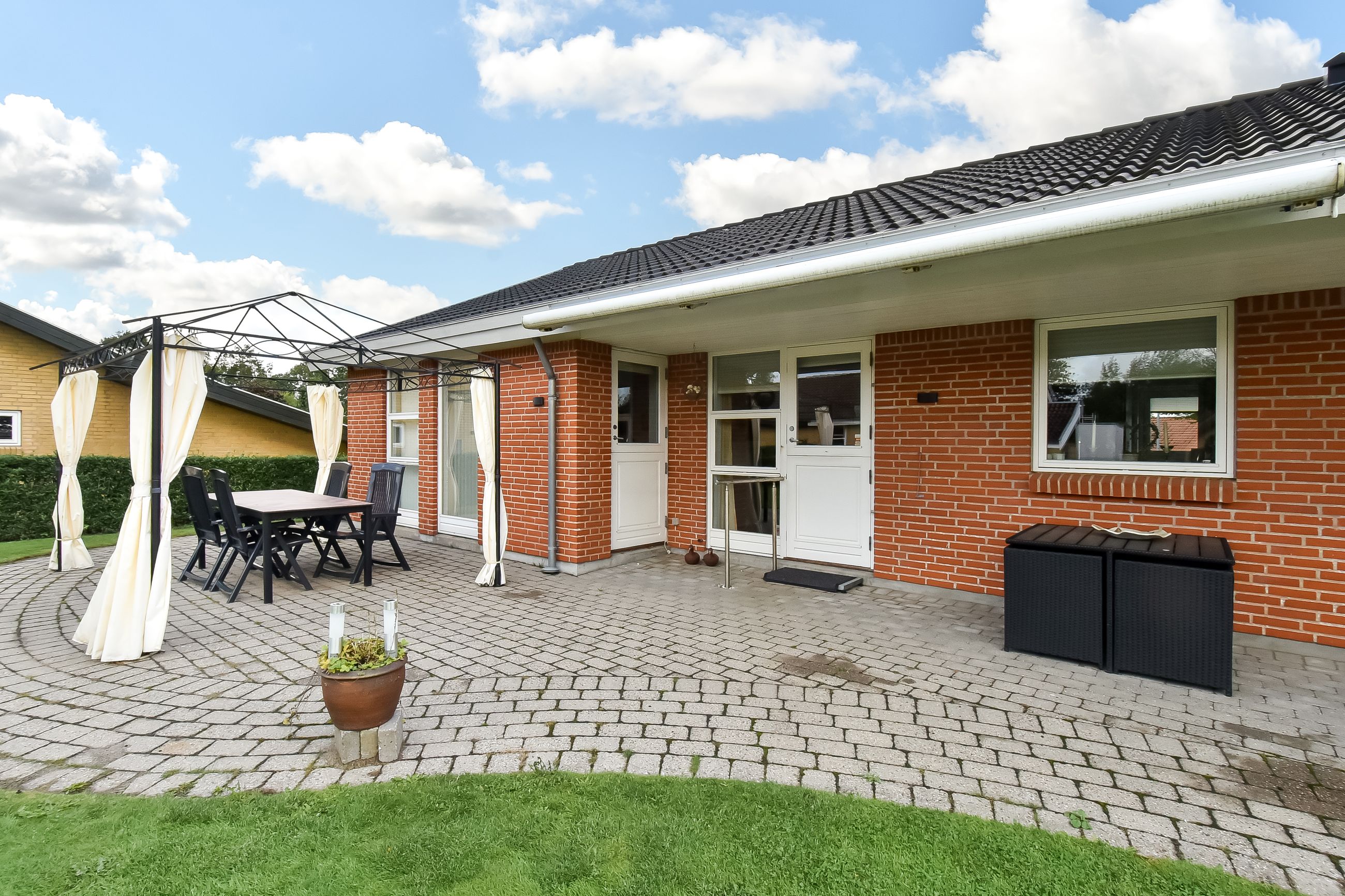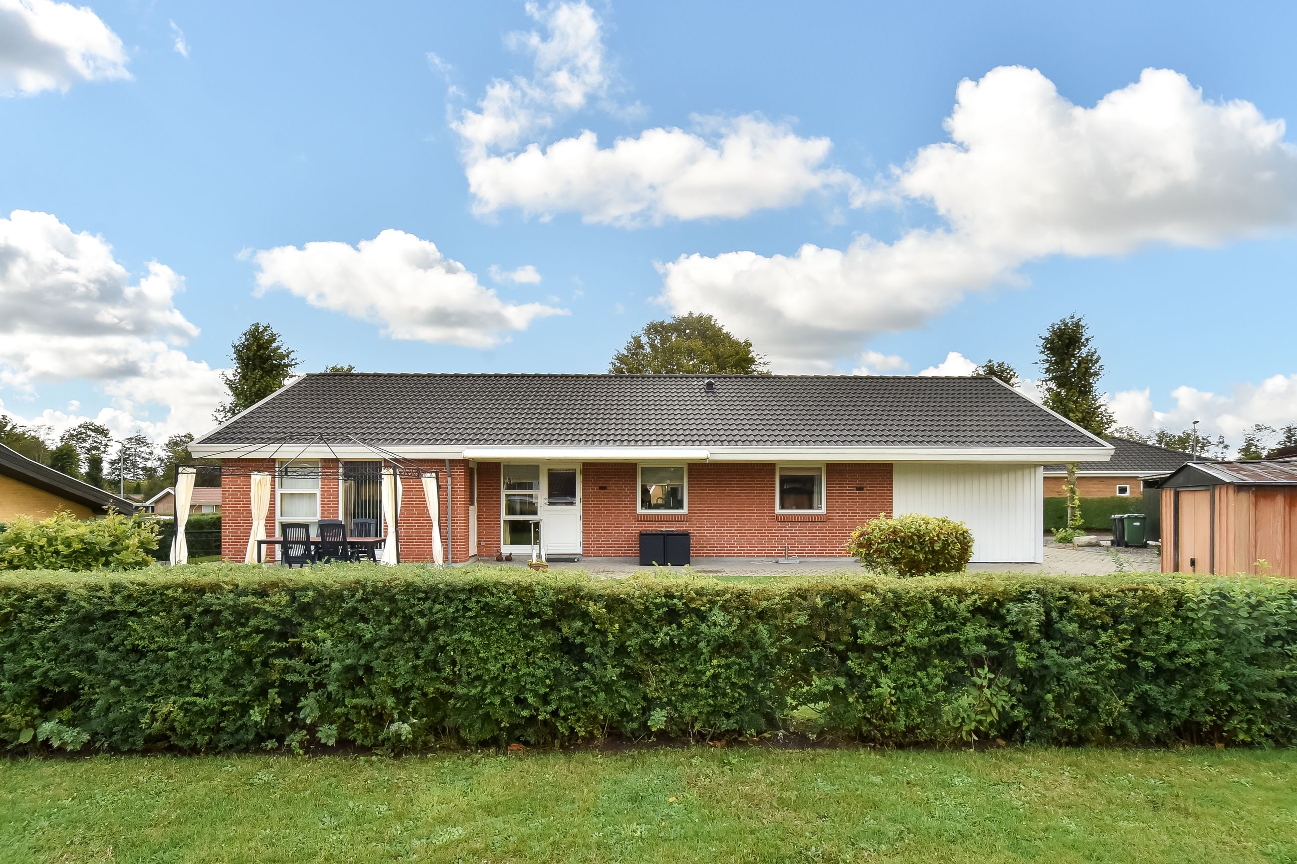 Udendørsarealerne kræver minimal vedligeholdelse med den flisebelagte indkørsel, som fører direkte op til carporten. Forhaven præsenterer sig pænt med simple bede mens baghaven hovedsageligt består af græsplæne med få buske samt en dejlig flisebelagt terrasse – perfekt til sommerens grillfester eller stille eftermiddage med en god bog.