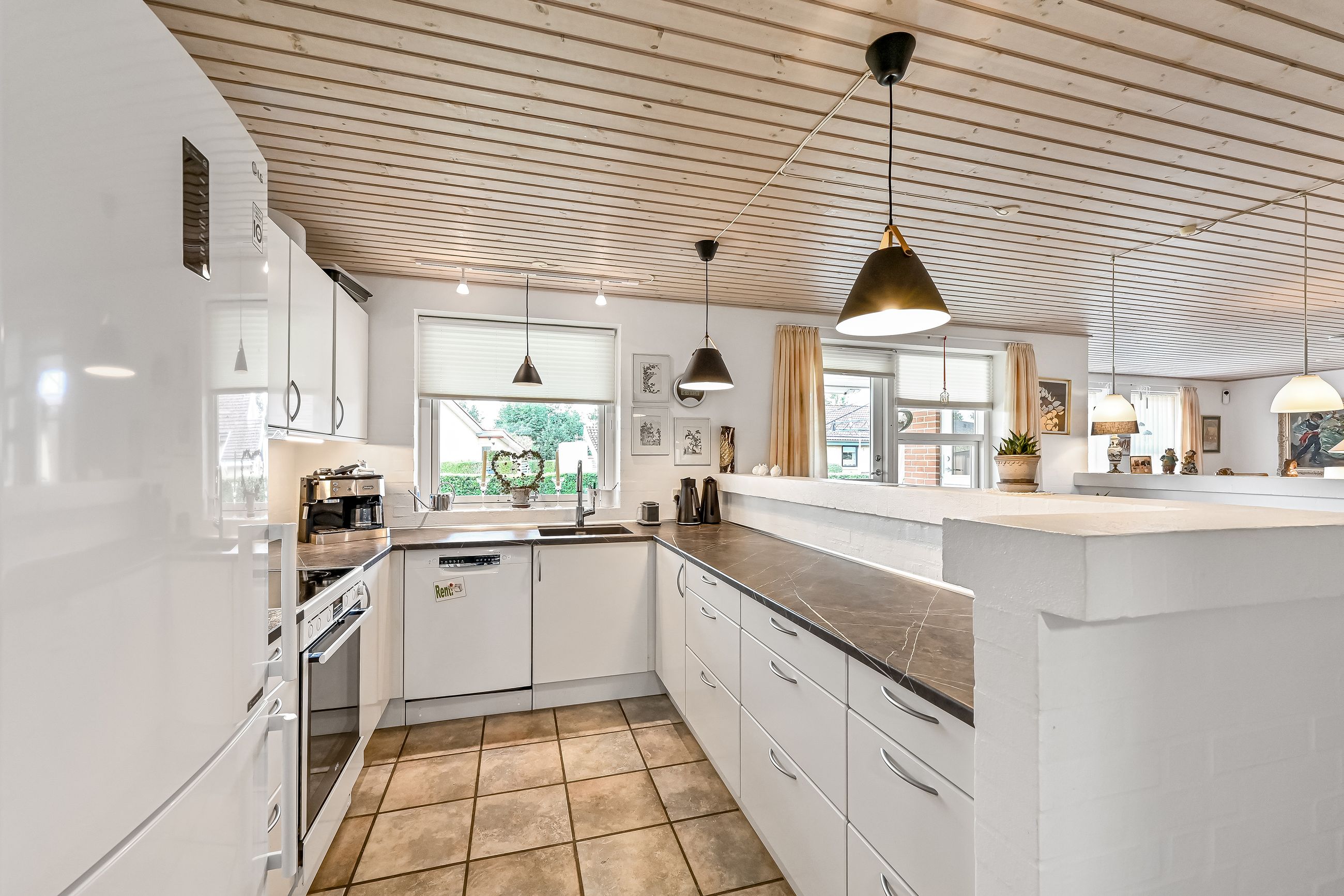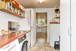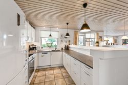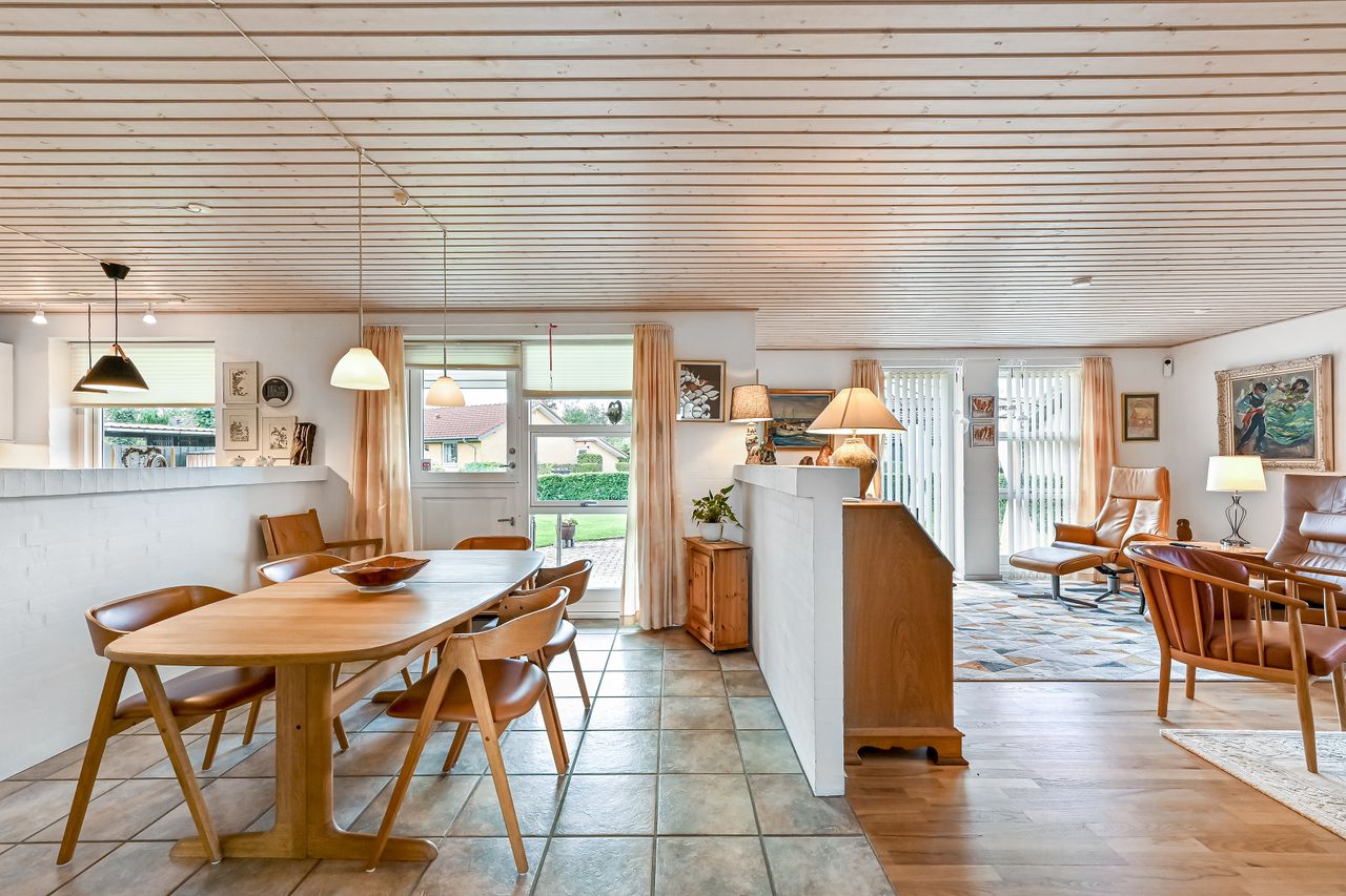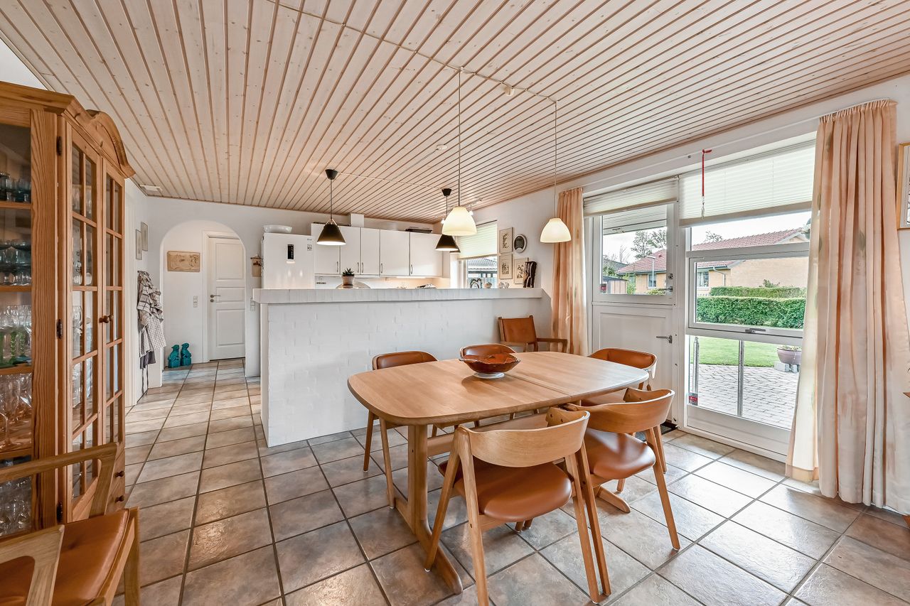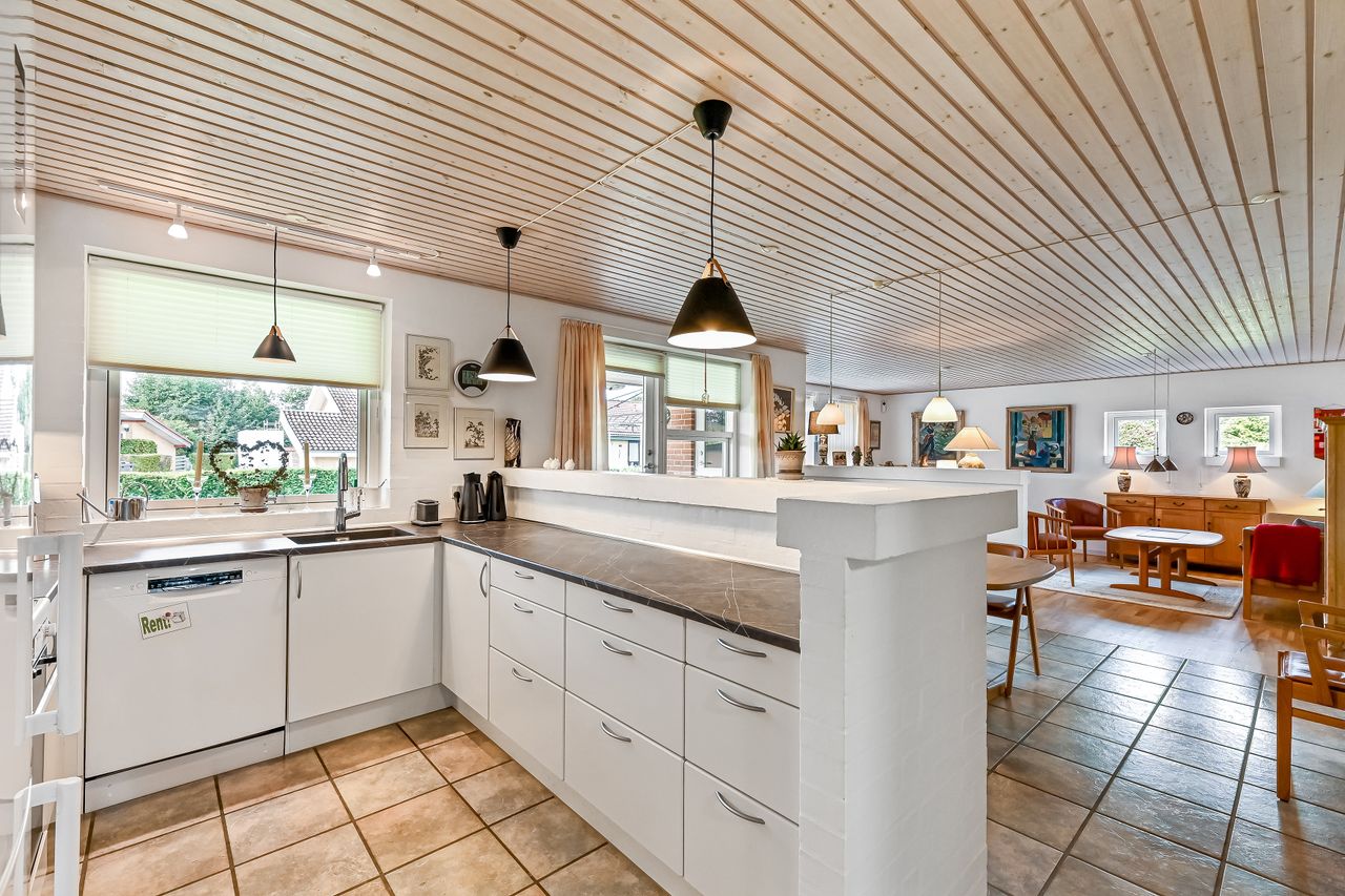 Huset har to indgange hvor den daglige indgang byder på et lyst og praktrisk bryggers og som leder dig direkte ind i køkkenet. Det åbne køkken/alrum/stue skaber et rummeligt hjerterum i boligen, hvor madlavning, spisning og samvær smelter sammen. Køkkenet er holdt i tidløse hvide elementer. Den delvist åbne stue har flotte lyse gulve, der tilfører varme til rummet samt giver mulighed for at skabe hyggelige kroge til afslapning.