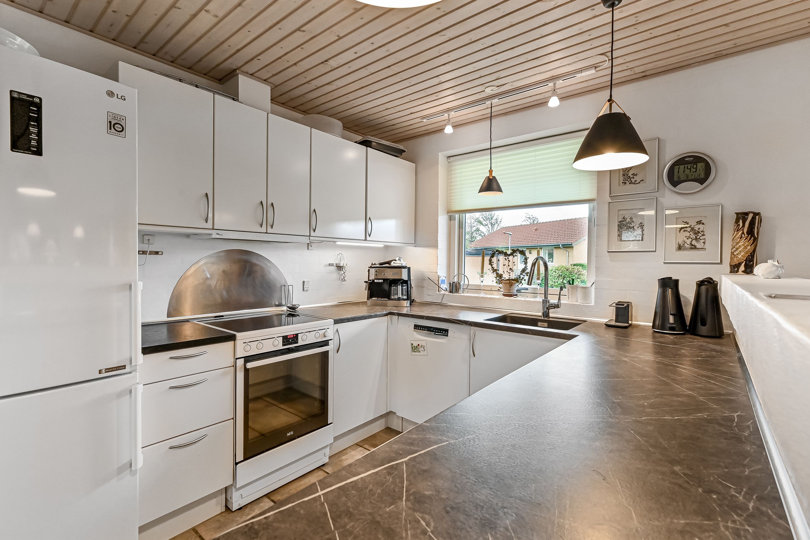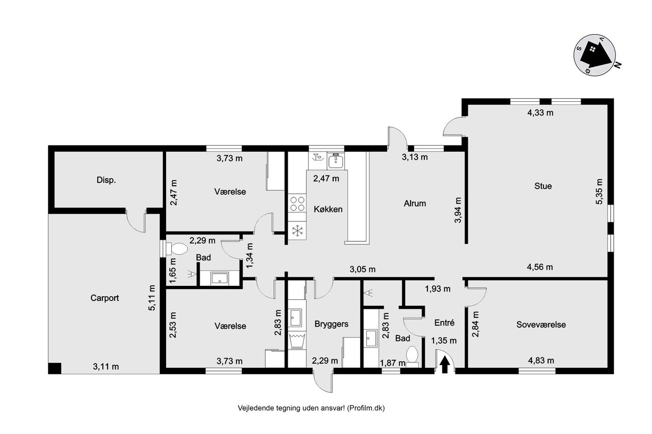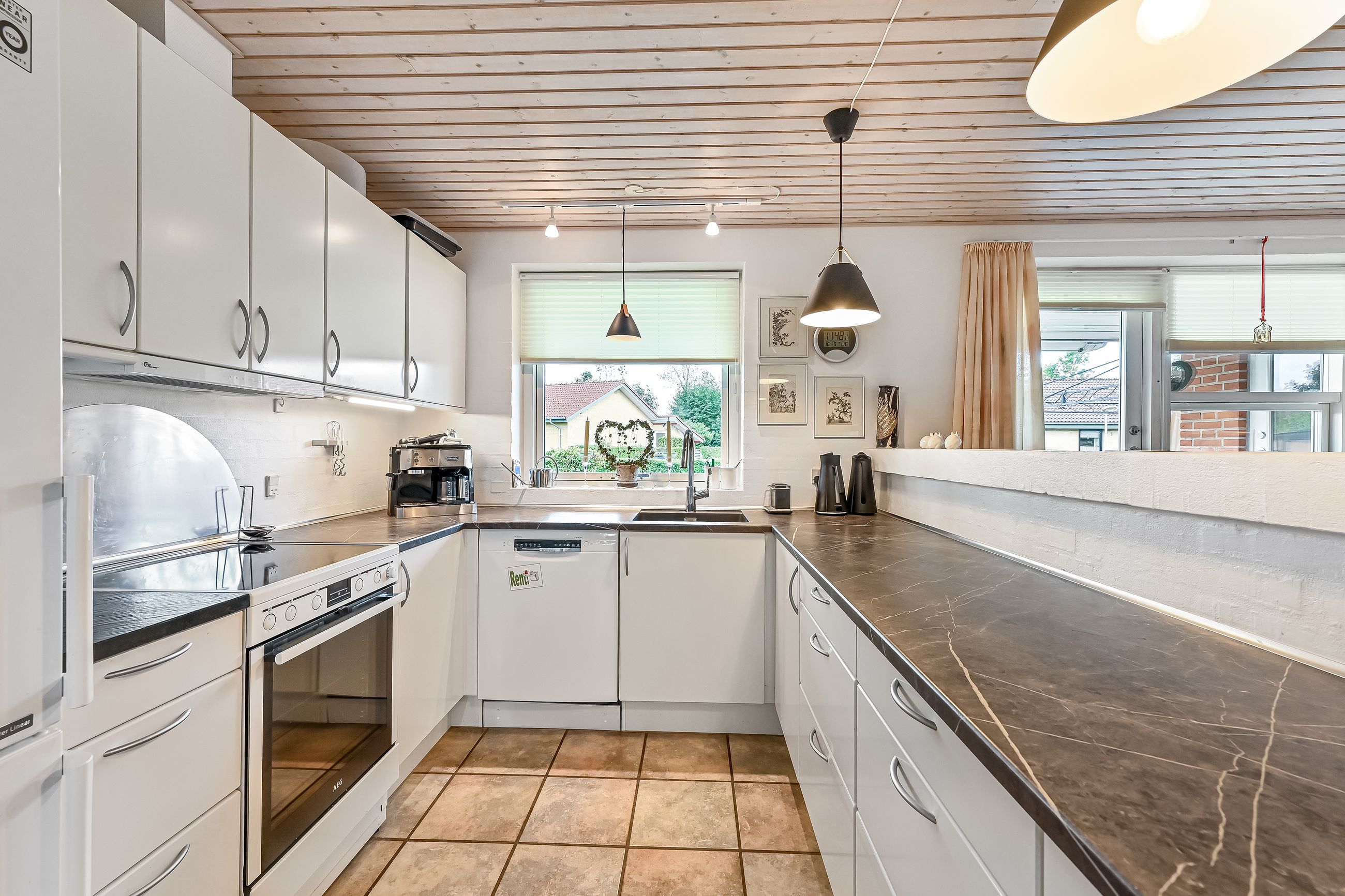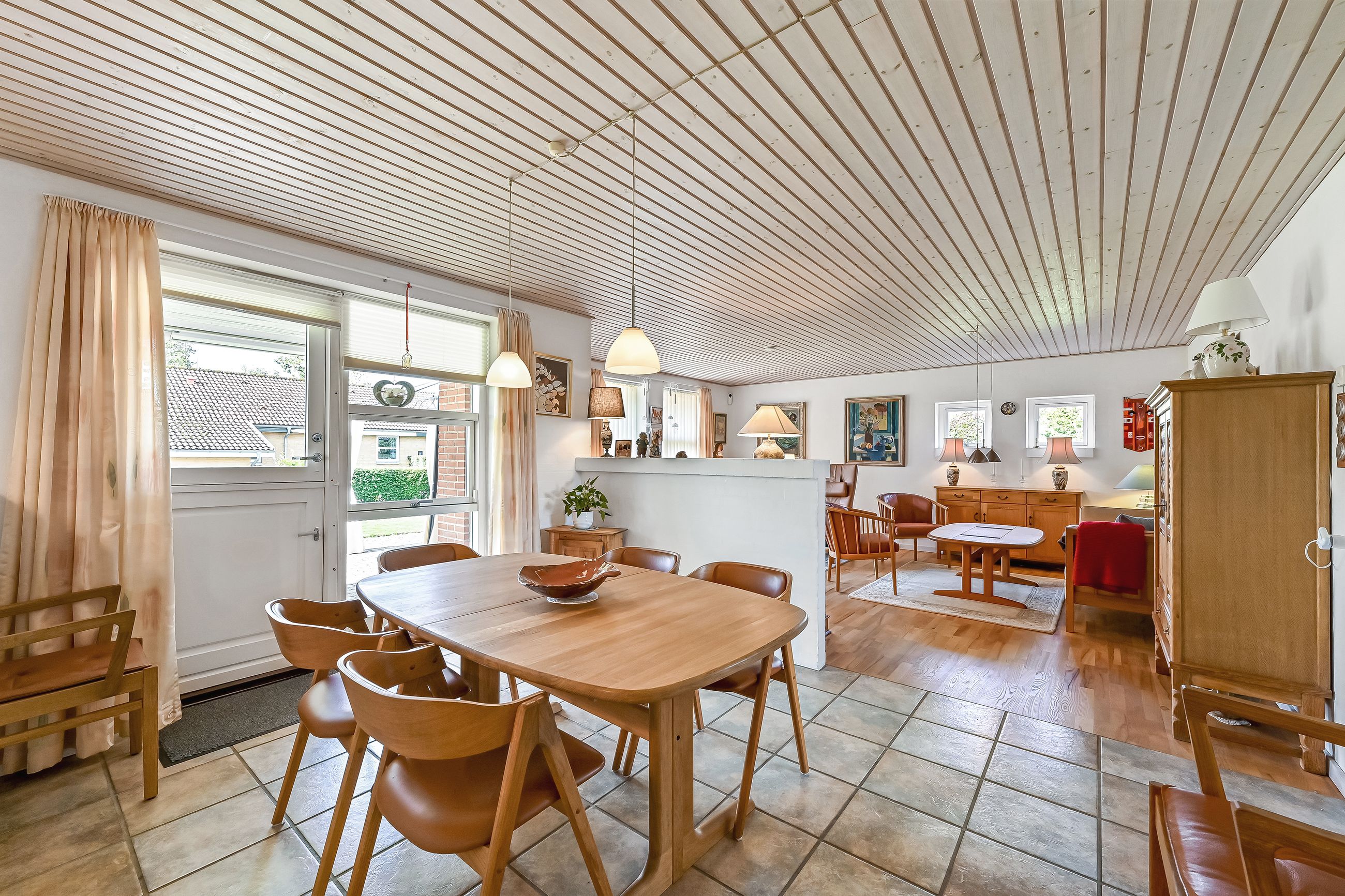 Huset har to indgange hvor den daglige indgang byder på et lyst og praktrisk bryggers og som leder dig direkte ind i køkkenet. Det åbne køkken/alrum/stue skaber et rummeligt hjerterum i boligen, hvor madlavning, spisning og samvær smelter sammen. Køkkenet er holdt i tidløse hvide elementer. Den delvist åbne stue har flotte lyse gulve, der tilfører varme til rummet samt giver mulighed for at skabe hyggelige kroge til afslapning.