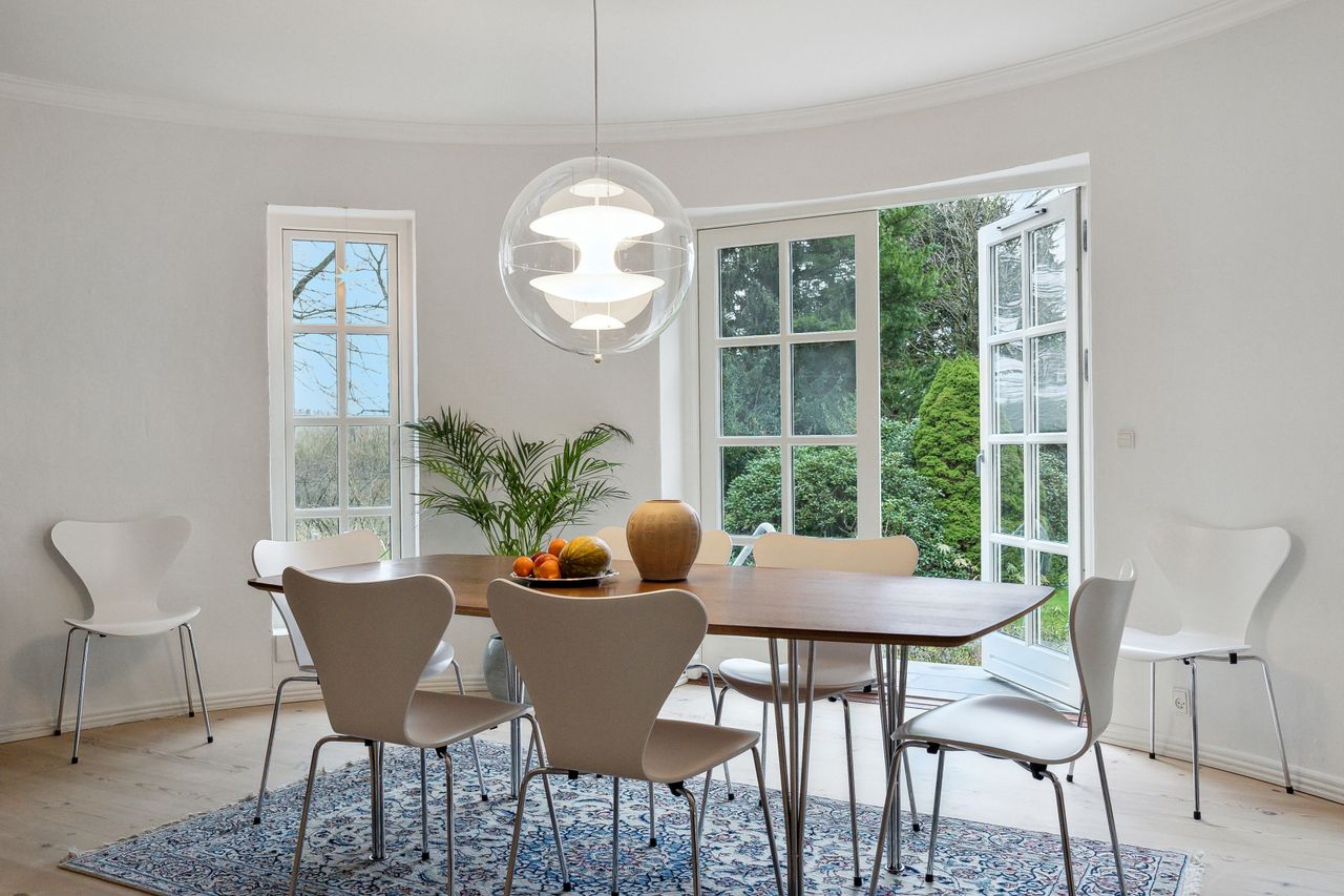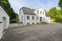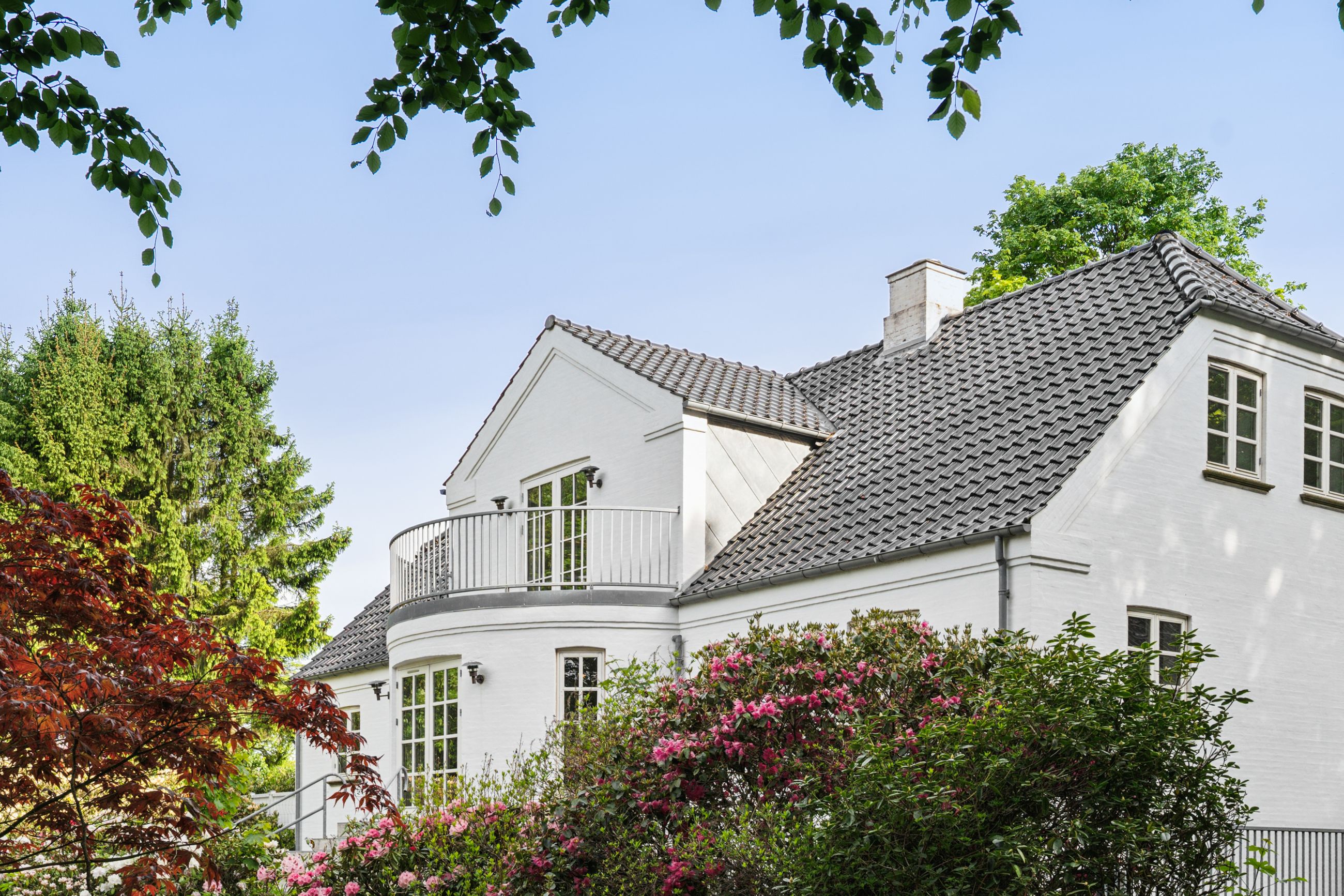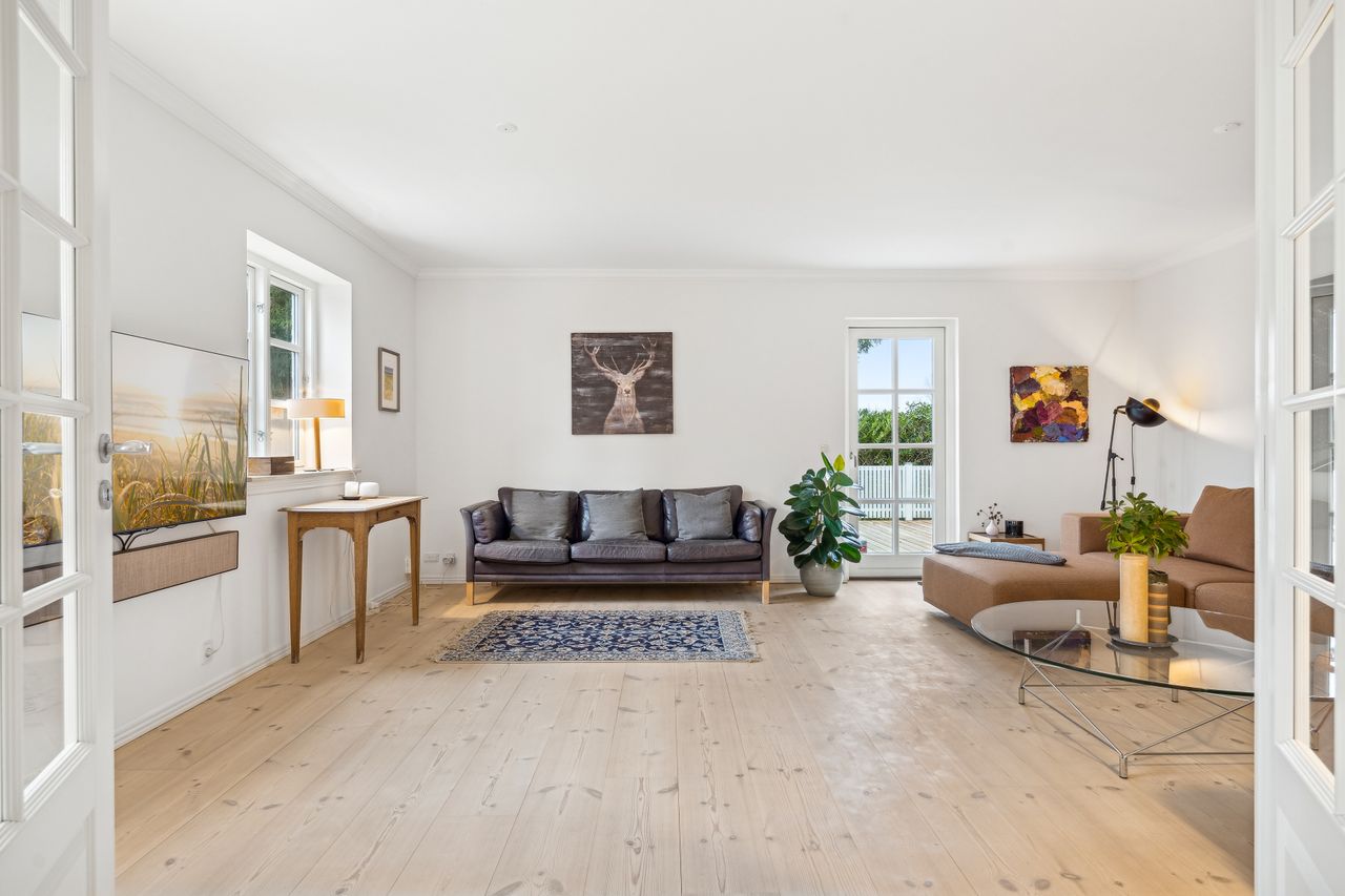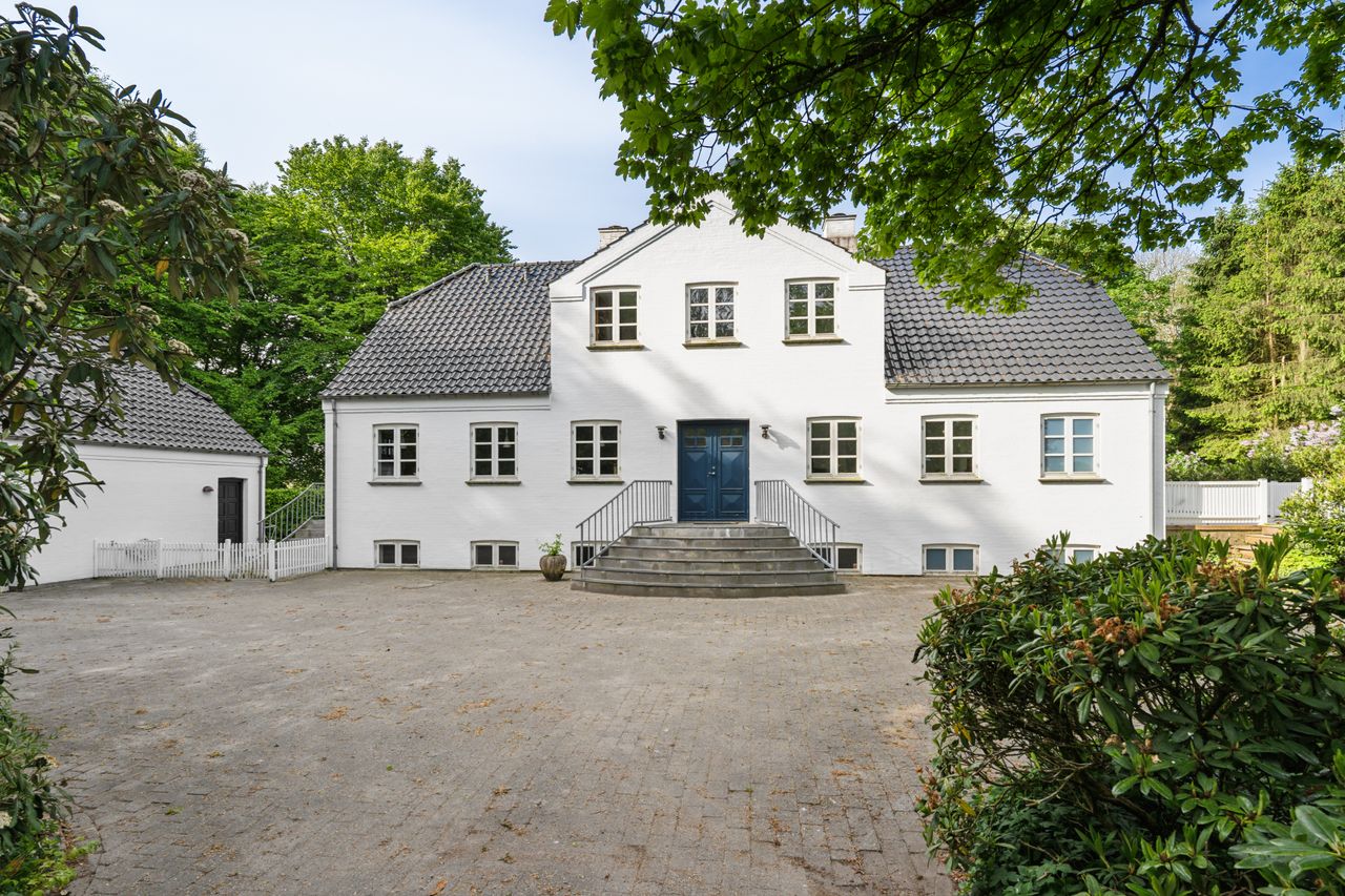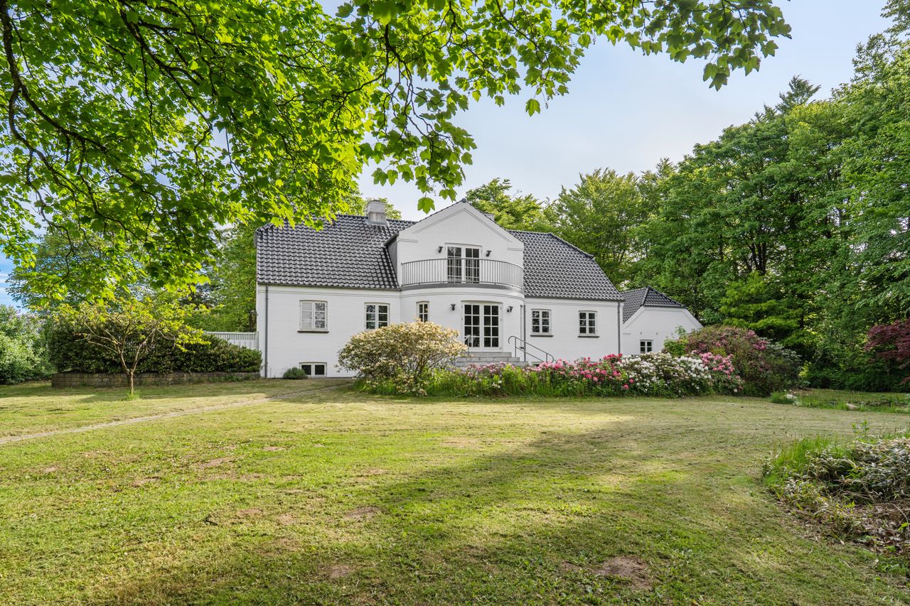 Villaen fremstår smuk og indflytningsklar med hvidmalet facade, sortglaseret tegltag og en klassisk arkitektur med bl.a. sprossede vinduer. Facaden er malet i 2024, og opvarmningen er moderniseret med en luft-til-vand-varmepumpe.