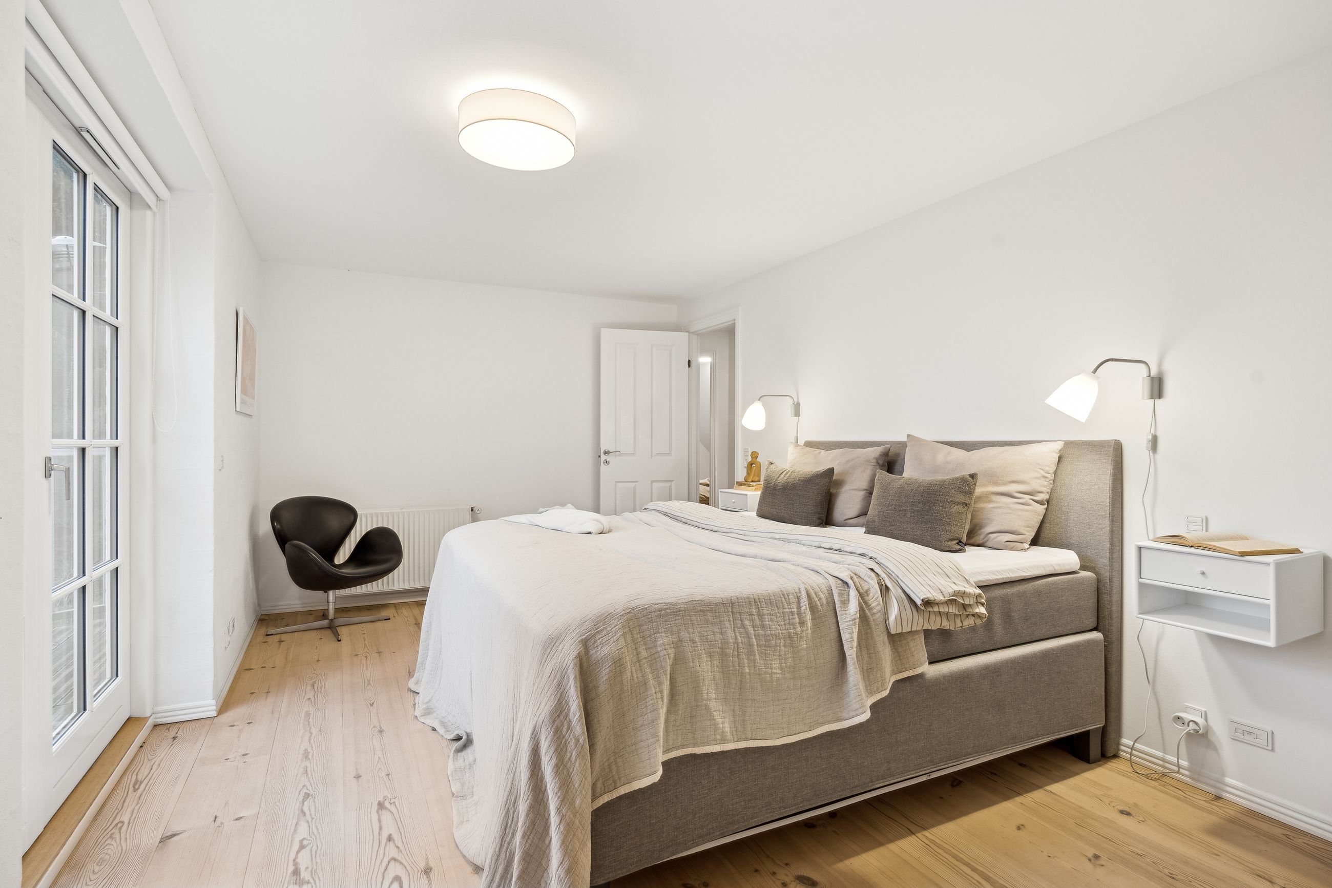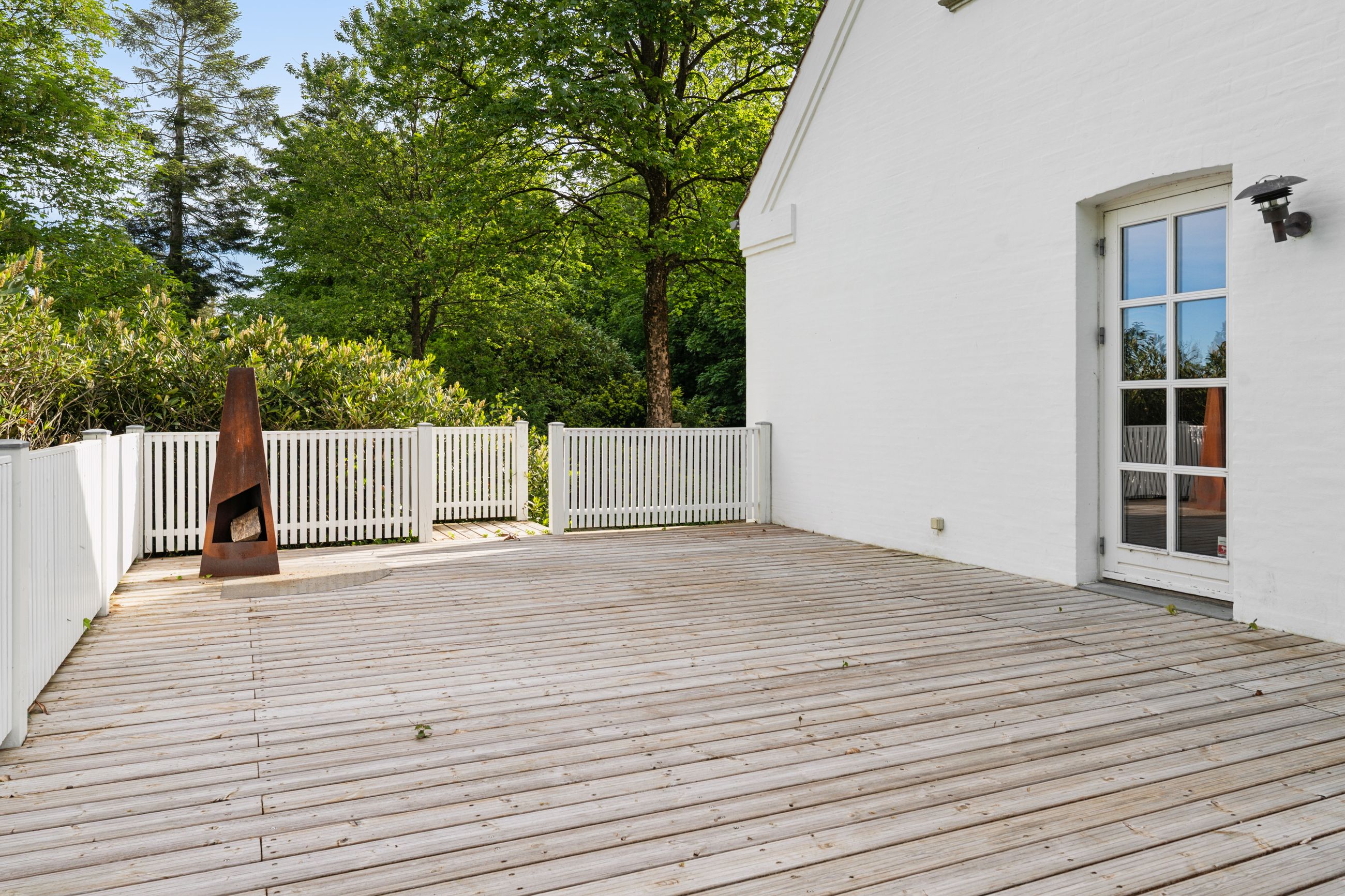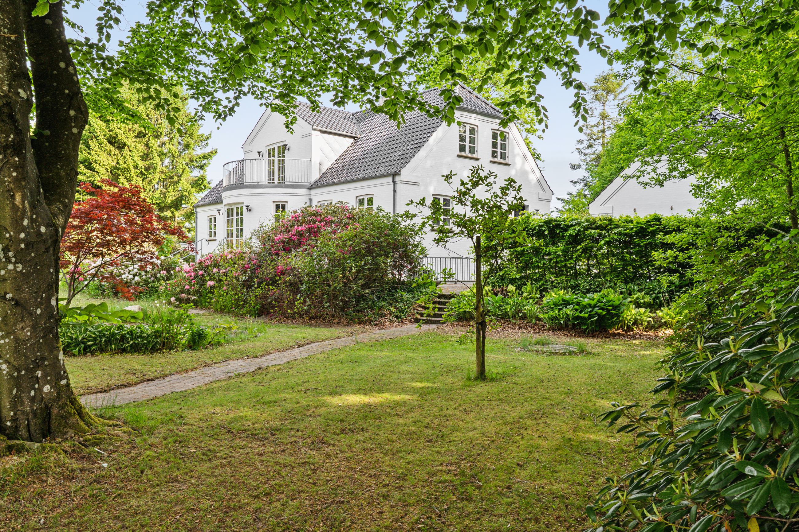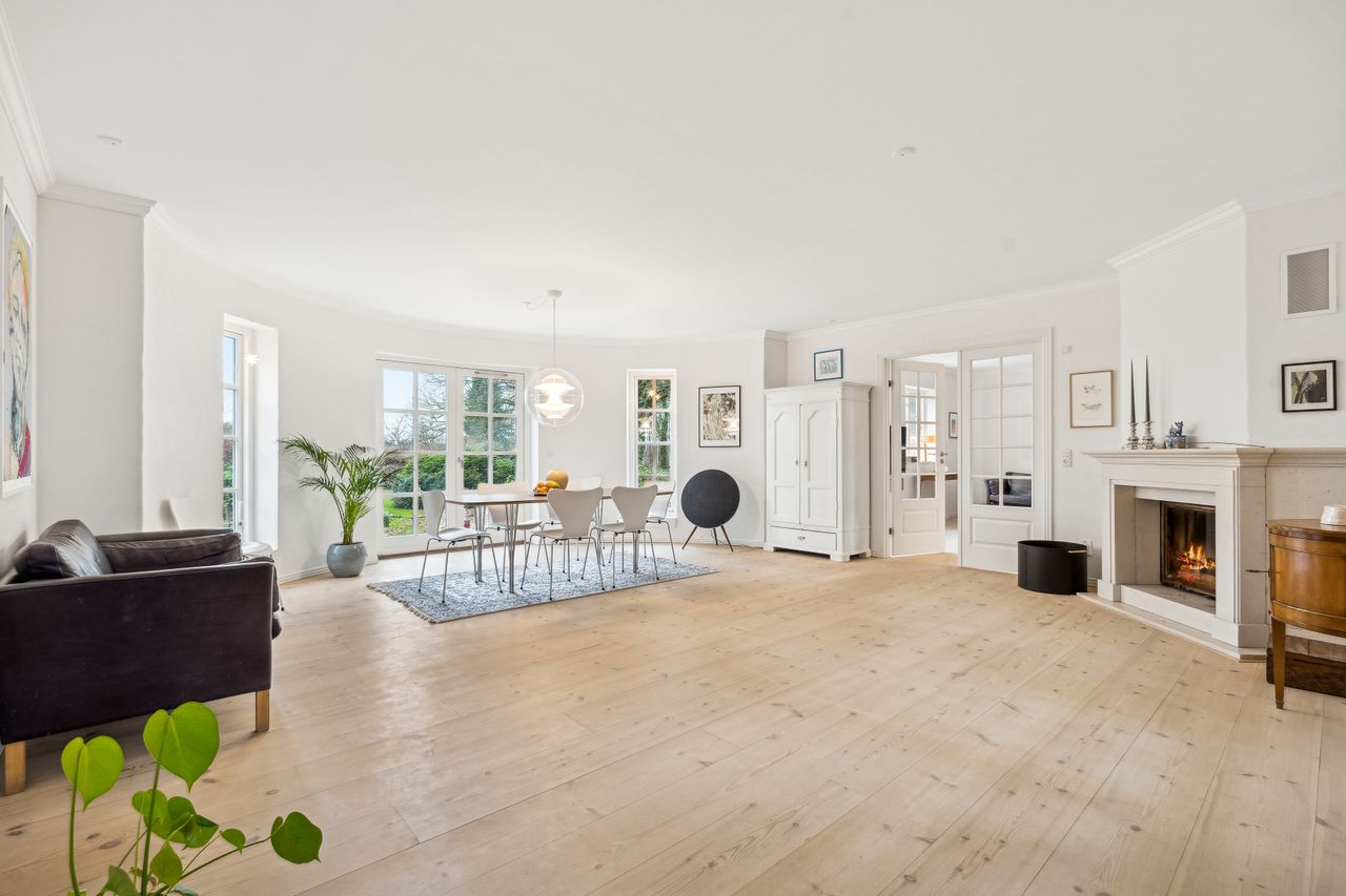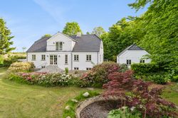 Villaen fremstår smuk og indflytningsklar med hvidmalet facade, sortglaseret tegltag og en klassisk arkitektur med bl.a. sprossede vinduer. Facaden er malet i 2024, og opvarmningen er moderniseret med en luft-til-vand-varmepumpe.