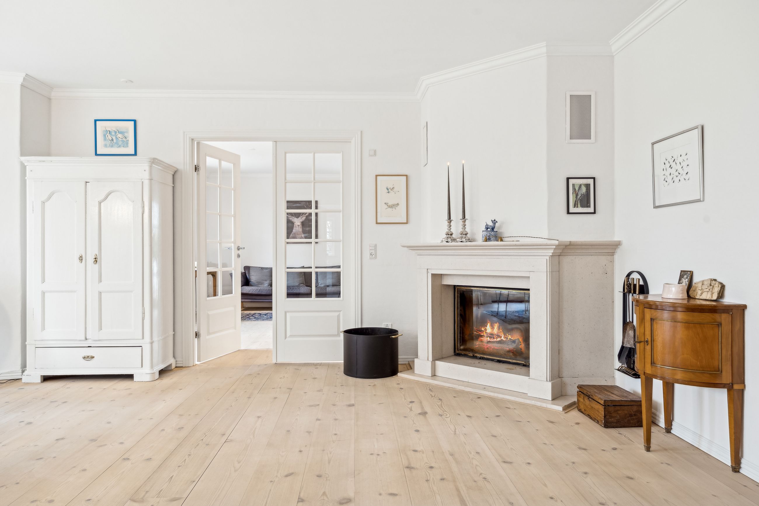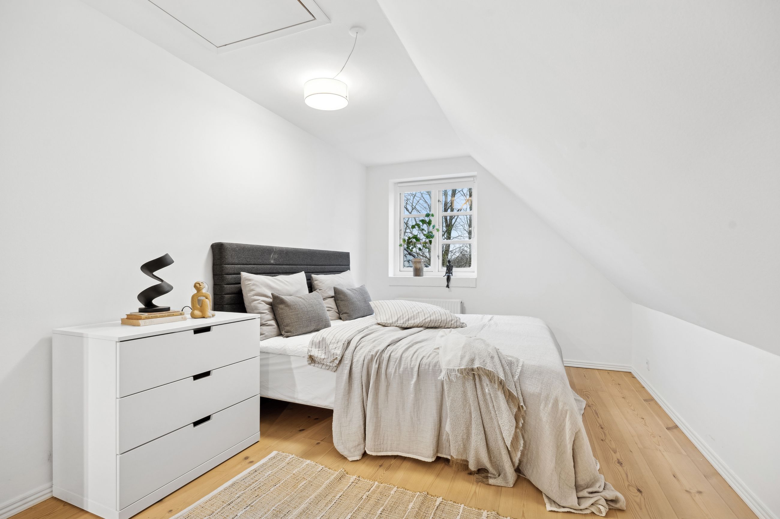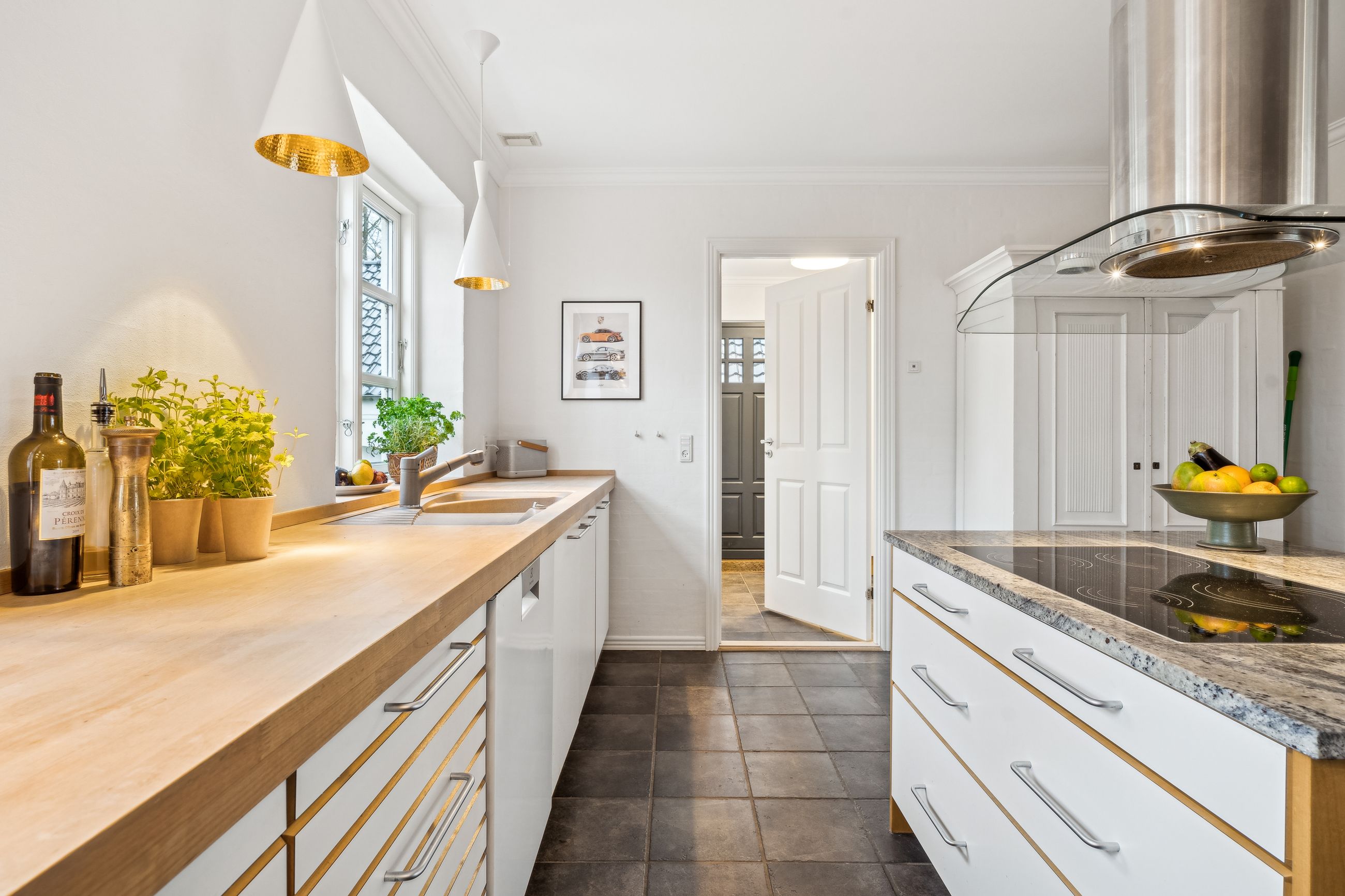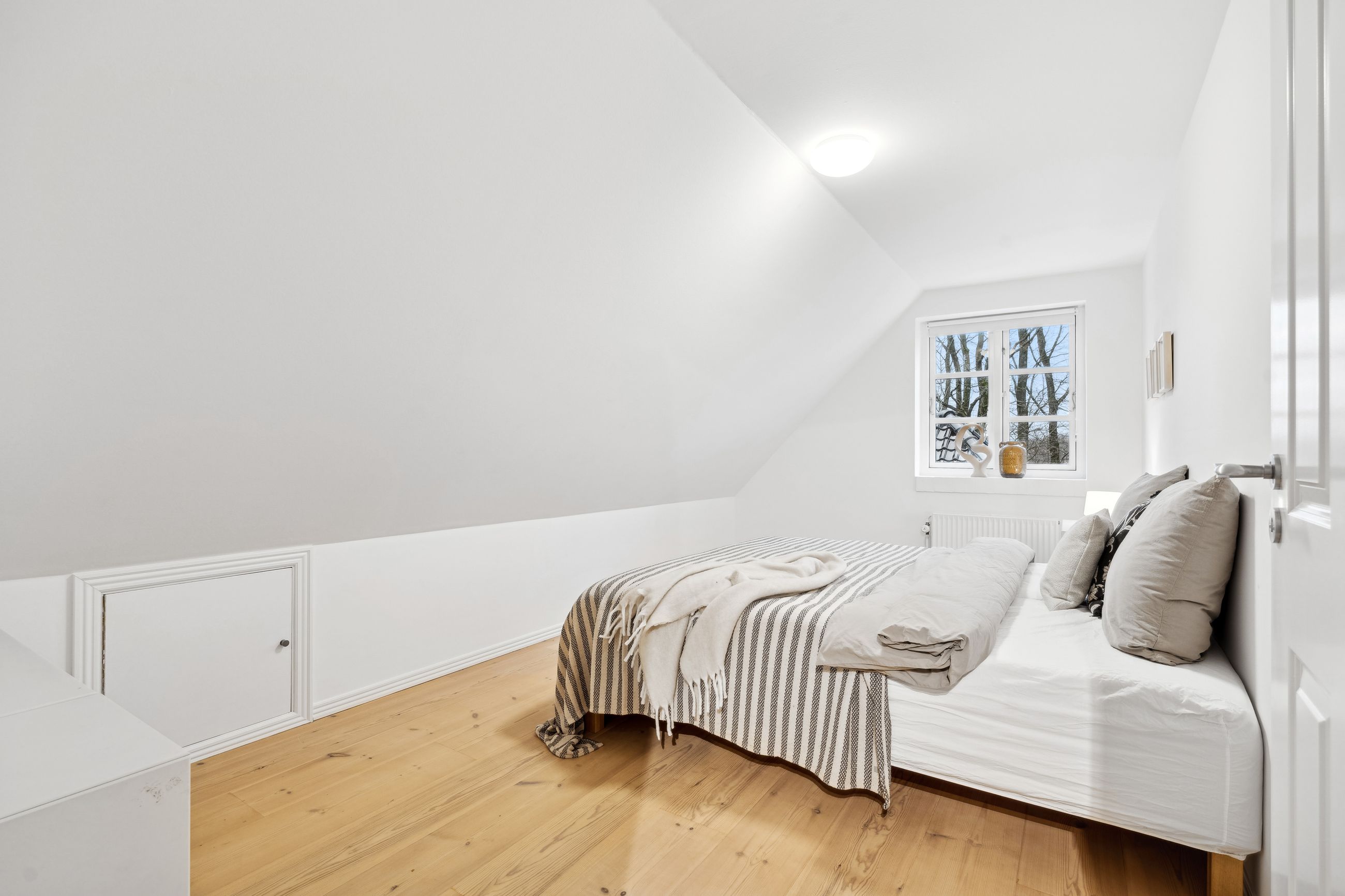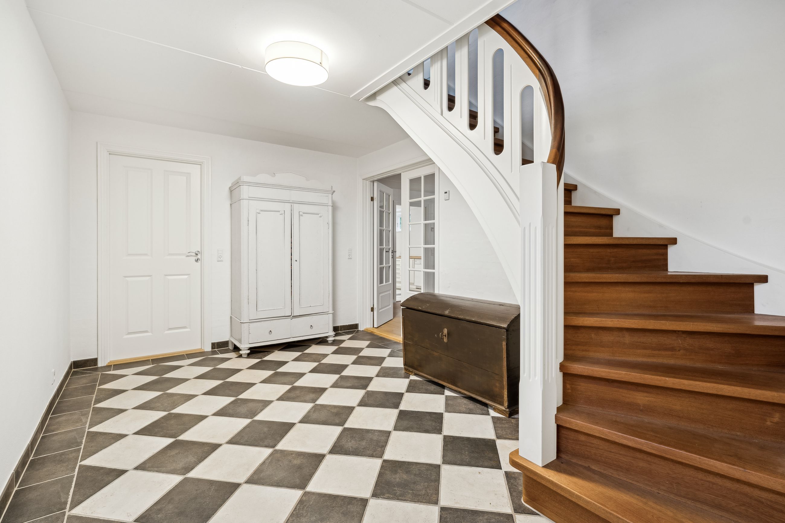Villaen fremstår smuk og indflytningsklar med hvidmalet facade, sortglaseret tegltag og en klassisk arkitektur med bl.a. sprossede vinduer. Facaden er malet i 2024, og opvarmningen er moderniseret med en luft-til-vand-varmepumpe.