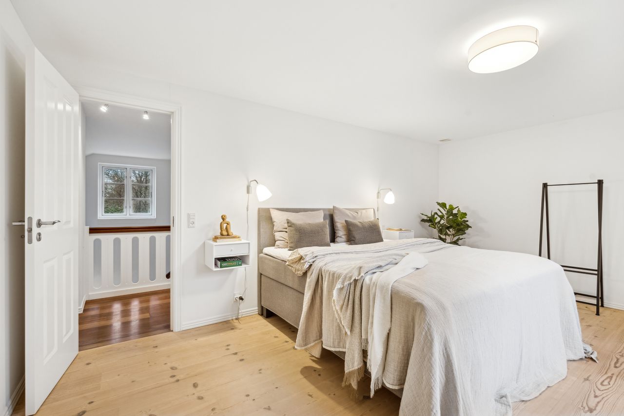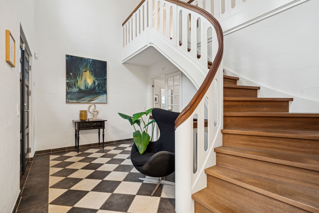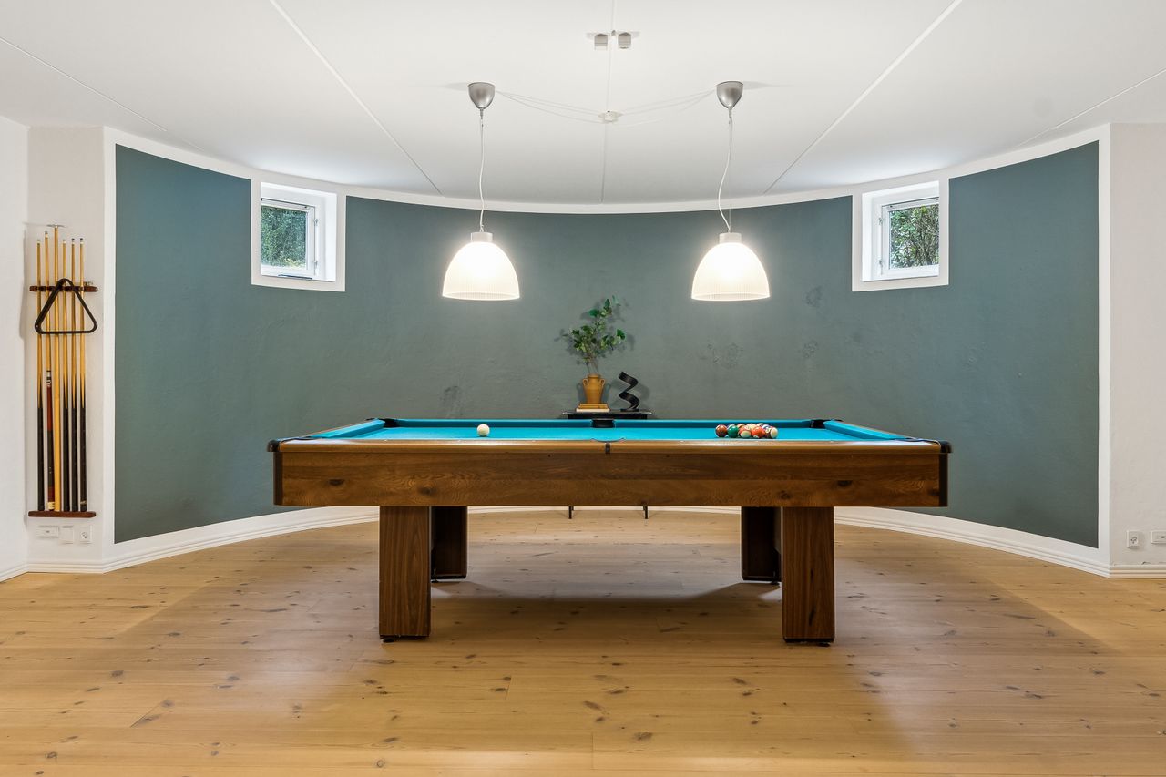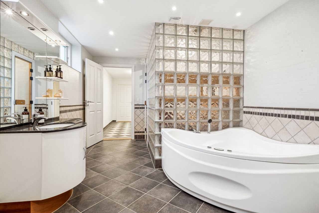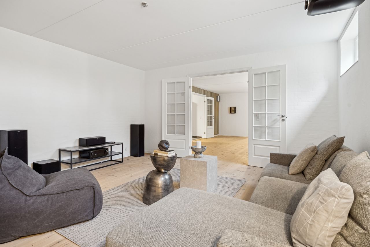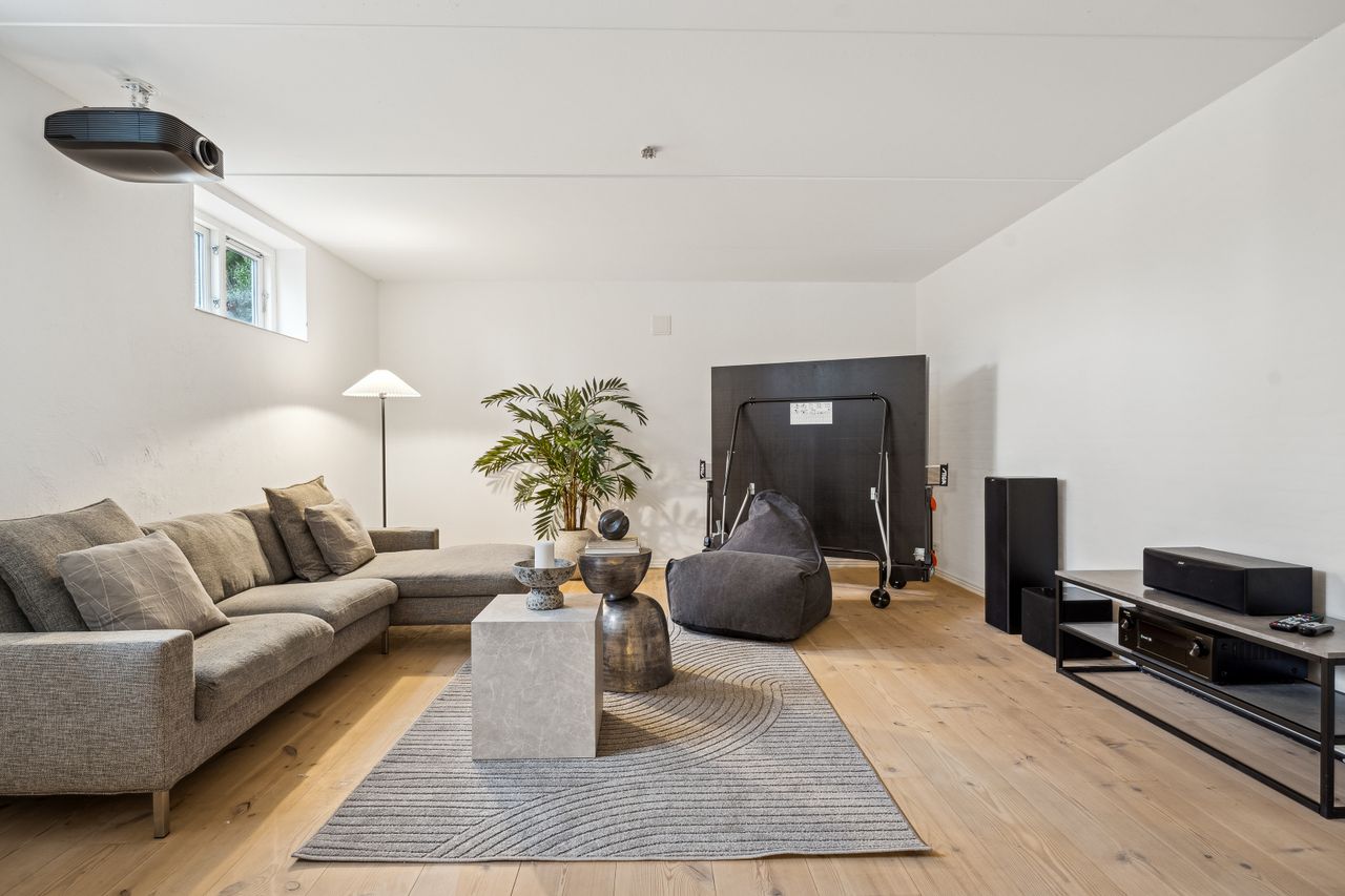 Indvendigt byder huset på i alt fem værelser og tre badeværelser. Stueplan rummer et stort køkken-alrum med karnap og udgang til terrasse samt en rummelig stue med flot lysindfald og endnu en terrassedør. Hertil kommer et stort værelse, et badeværelse og et praktisk grovkøkken. På førstesalen ligger fire værelser, herunder ét med adgang til altan mod sydvest, samt et stort badeværelse med dobbelt håndvask og bruseniche. I kælderen finder man husets tredje badeværelse, sauna, viktualierum, bryggers samt gode aktivitetsrum – oplagt til f.eks. billard, hjemmebiograf eller fitness.