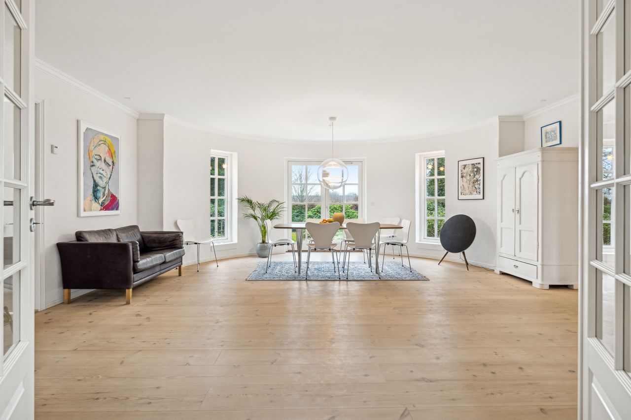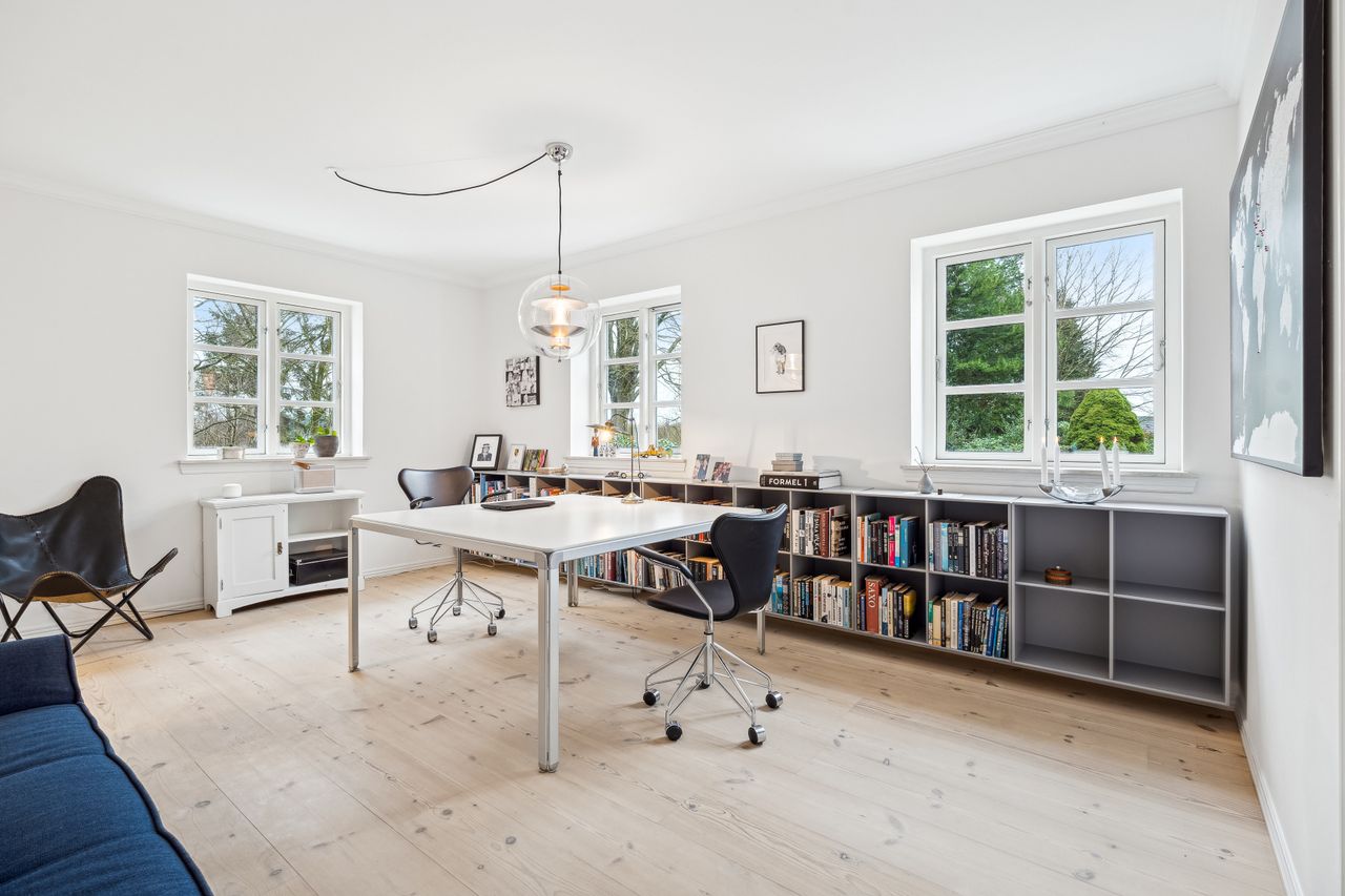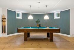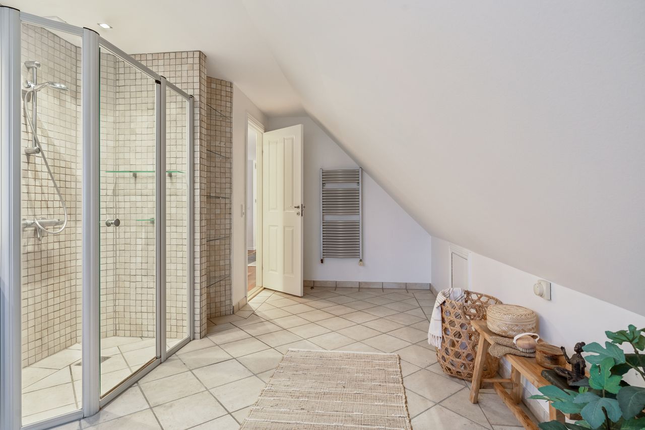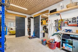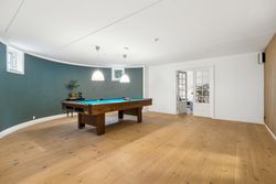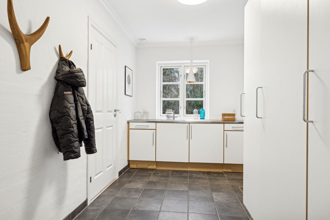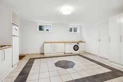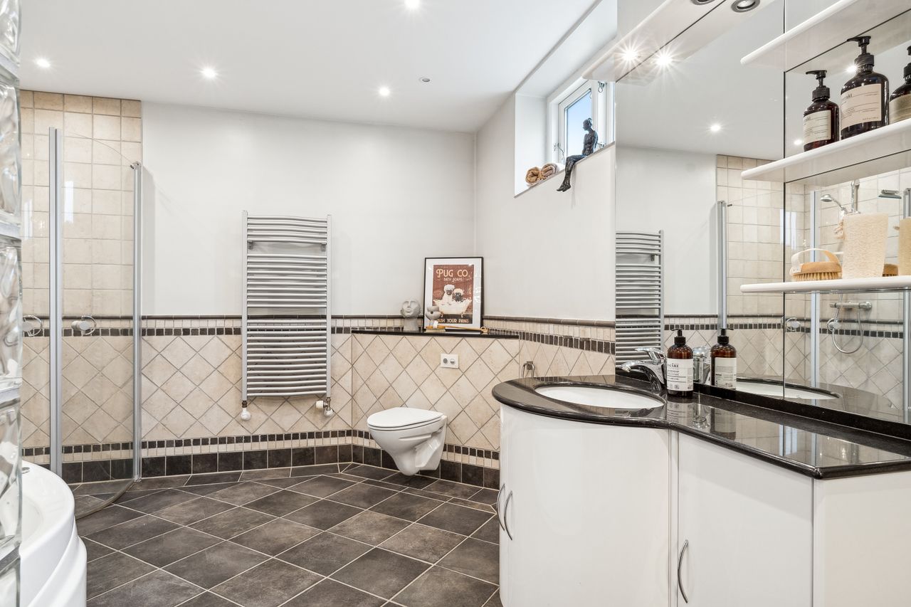 Indvendigt byder huset på i alt fem værelser og tre badeværelser. Stueplan rummer et stort køkken-alrum med karnap og udgang til terrasse samt en rummelig stue med flot lysindfald og endnu en terrassedør. Hertil kommer et stort værelse, et badeværelse og et praktisk grovkøkken. På førstesalen ligger fire værelser, herunder ét med adgang til altan mod sydvest, samt et stort badeværelse med dobbelt håndvask og bruseniche. I kælderen finder man husets tredje badeværelse, sauna, viktualierum, bryggers samt gode aktivitetsrum – oplagt til f.eks. billard, hjemmebiograf eller fitness.