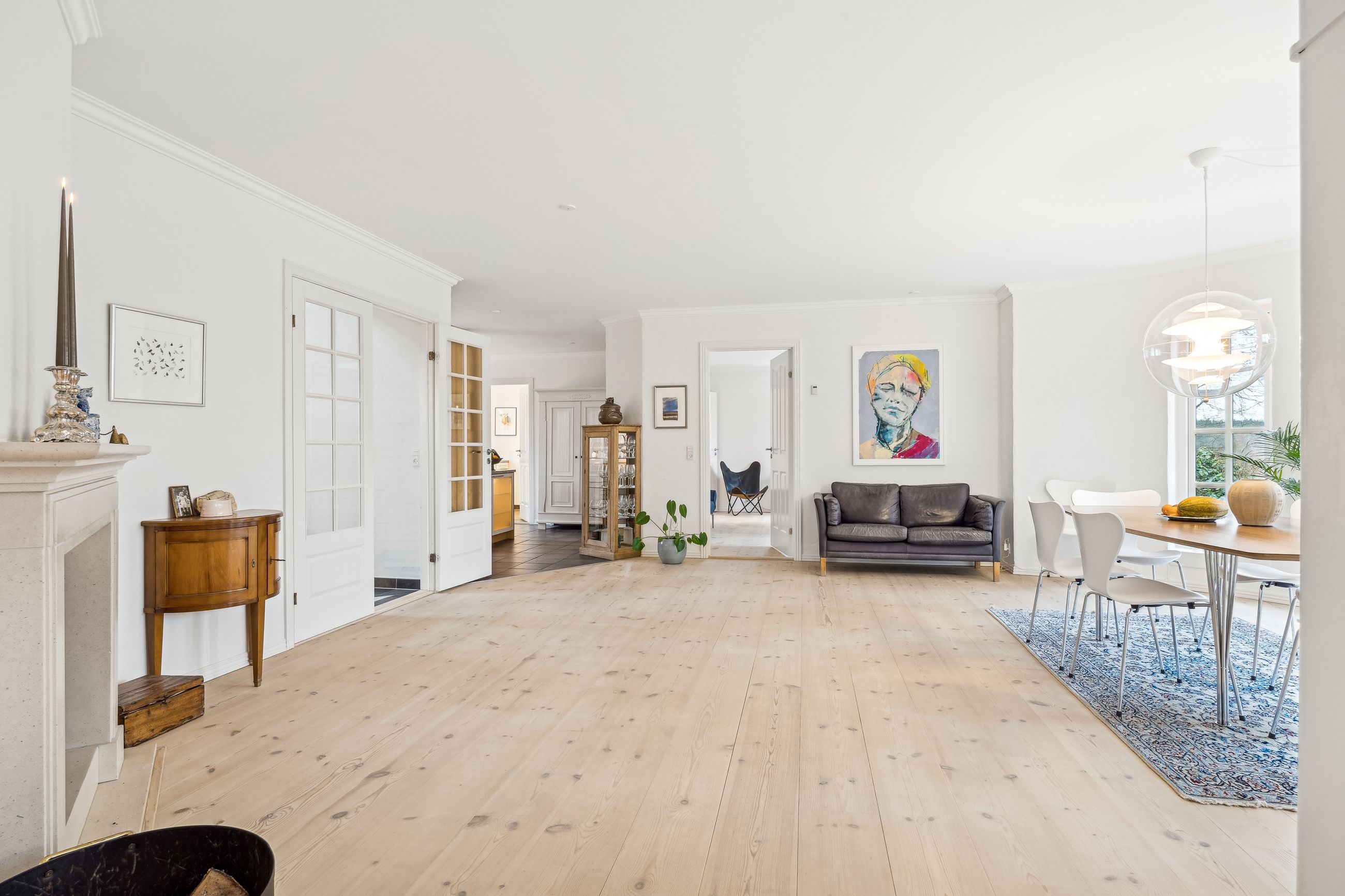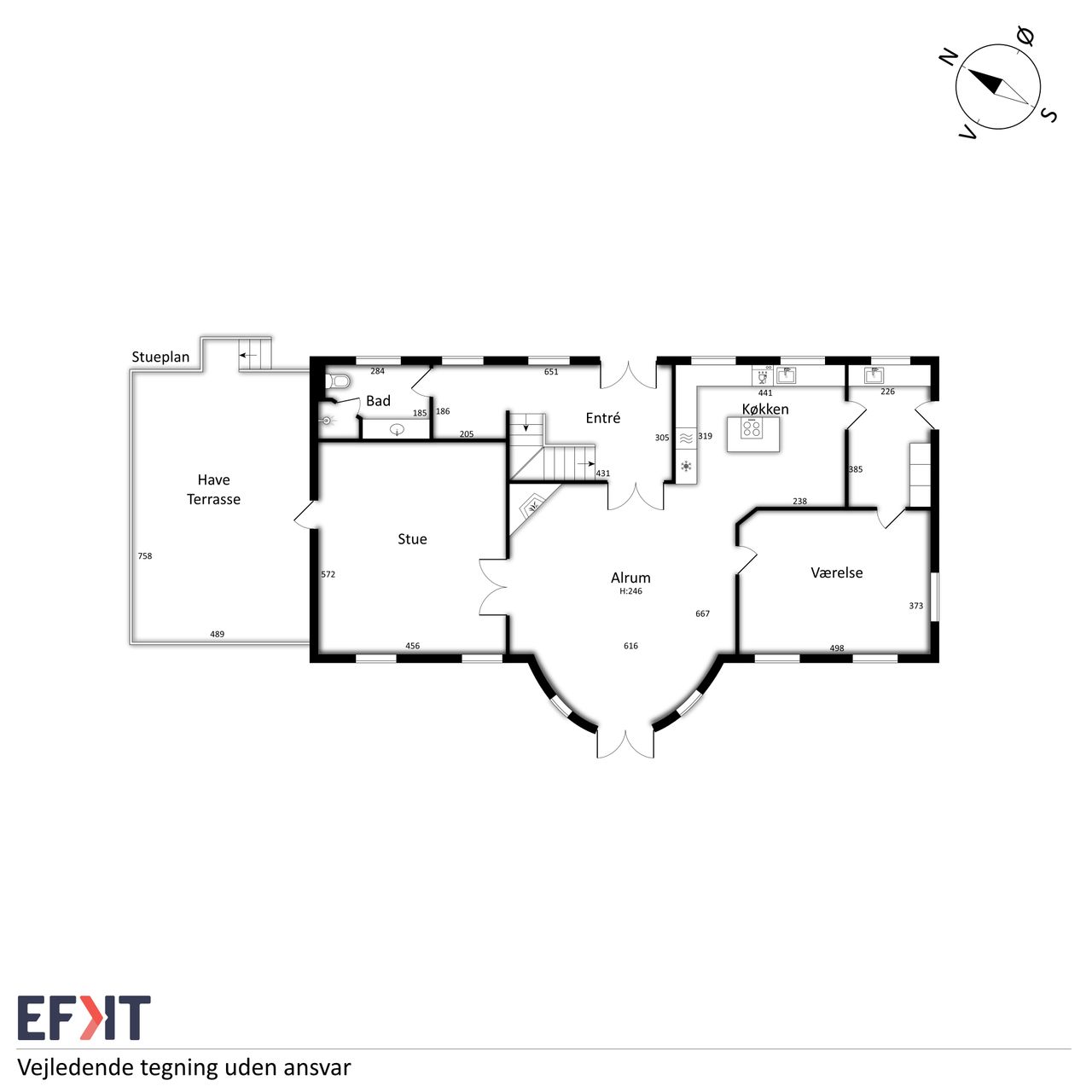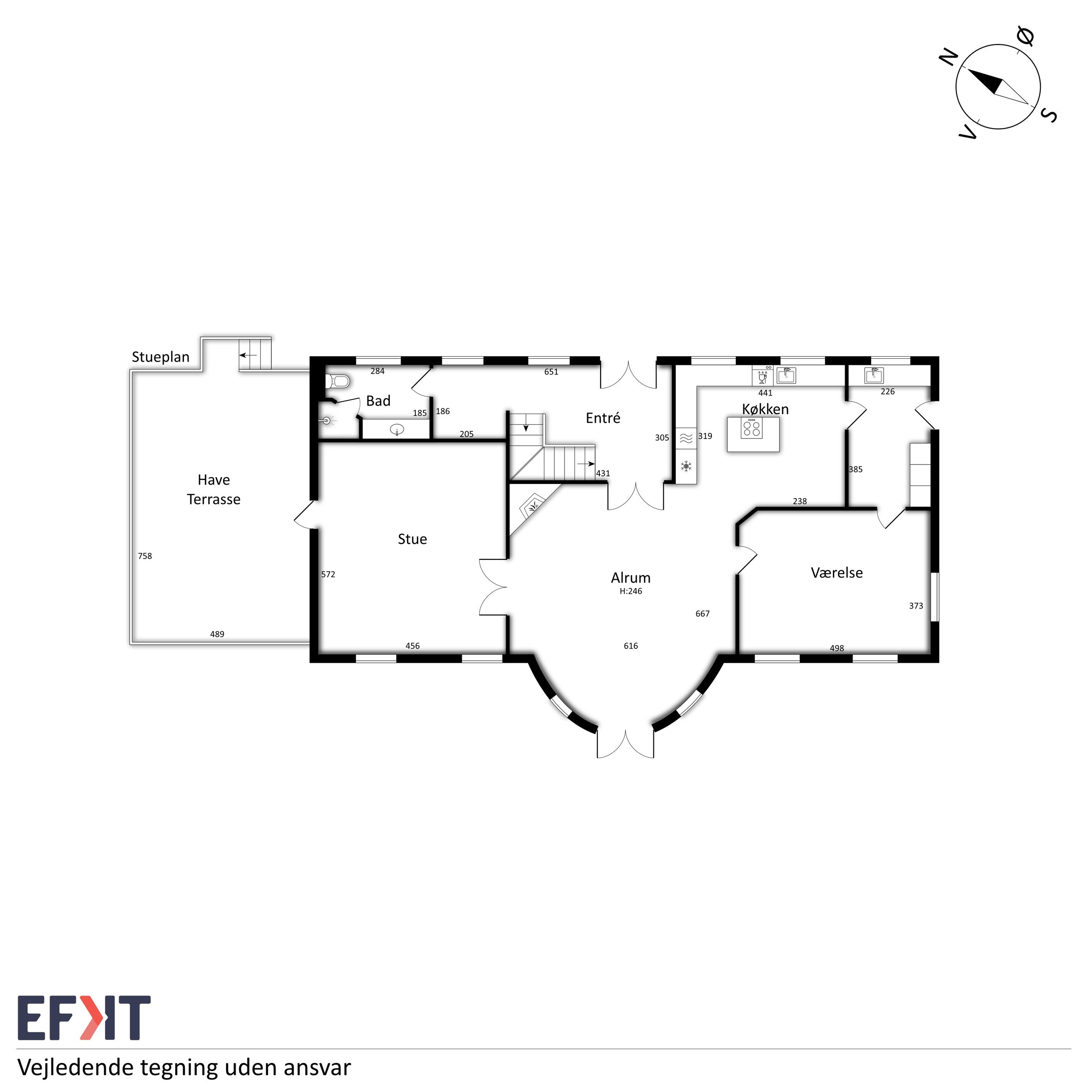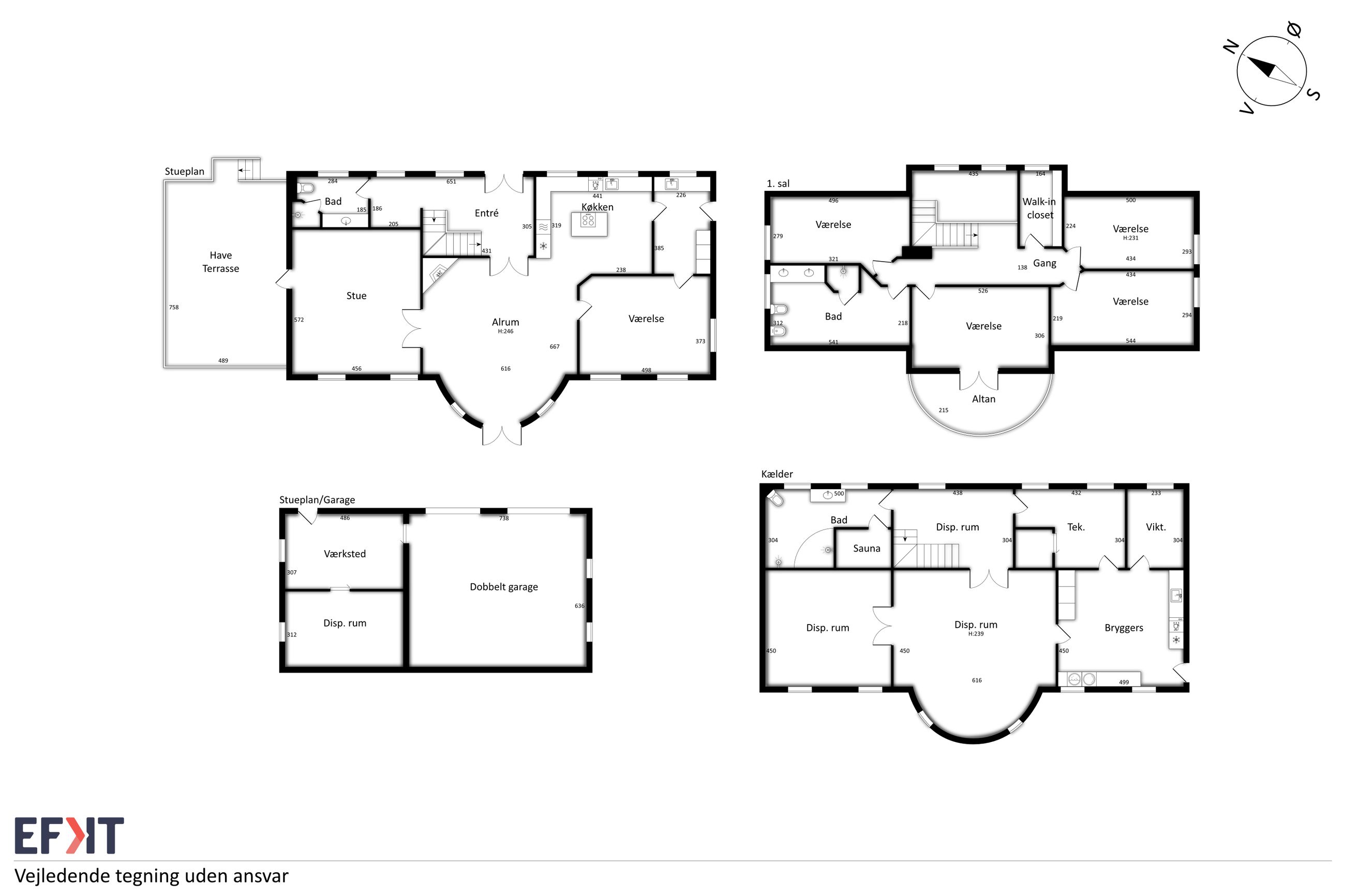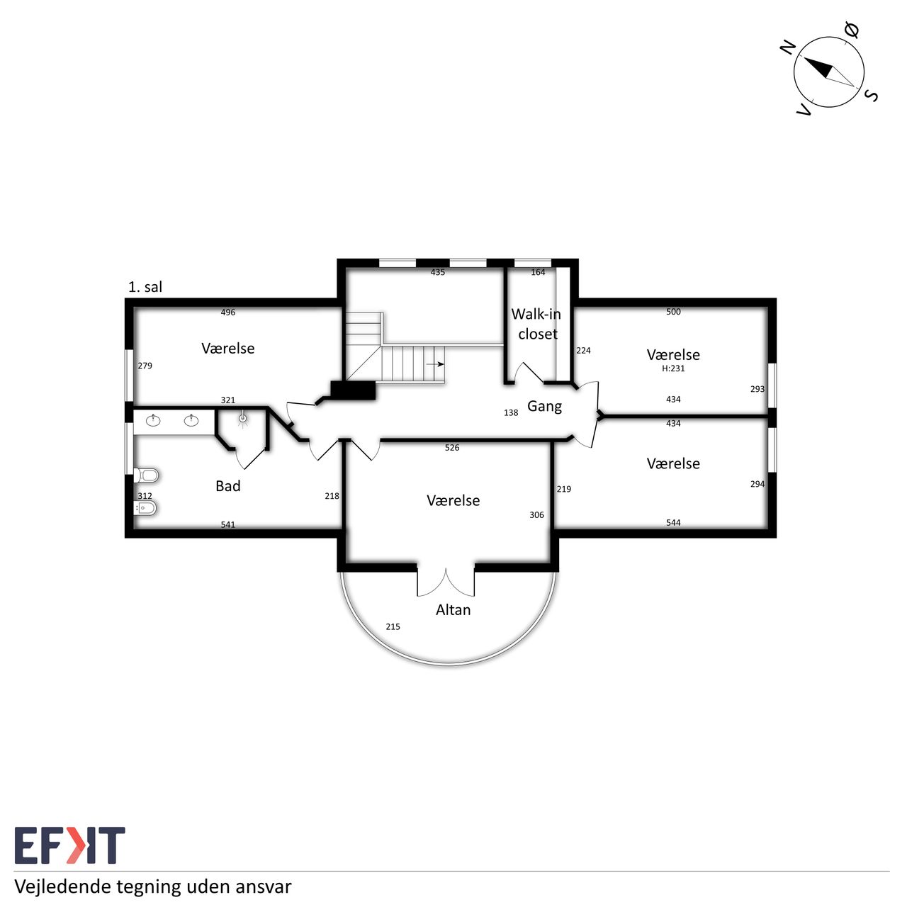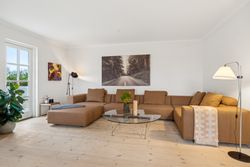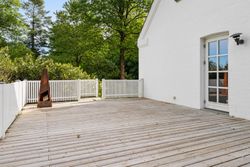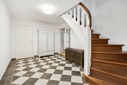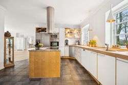 Indvendigt byder huset på i alt fem værelser og tre badeværelser. Stueplan rummer et stort køkken-alrum med karnap og udgang til terrasse samt en rummelig stue med flot lysindfald og endnu en terrassedør. Hertil kommer et stort værelse, et badeværelse og et praktisk grovkøkken. På førstesalen ligger fire værelser, herunder ét med adgang til altan mod sydvest, samt et stort badeværelse med dobbelt håndvask og bruseniche. I kælderen finder man husets tredje badeværelse, sauna, viktualierum, bryggers samt gode aktivitetsrum – oplagt til f.eks. billard, hjemmebiograf eller fitness.