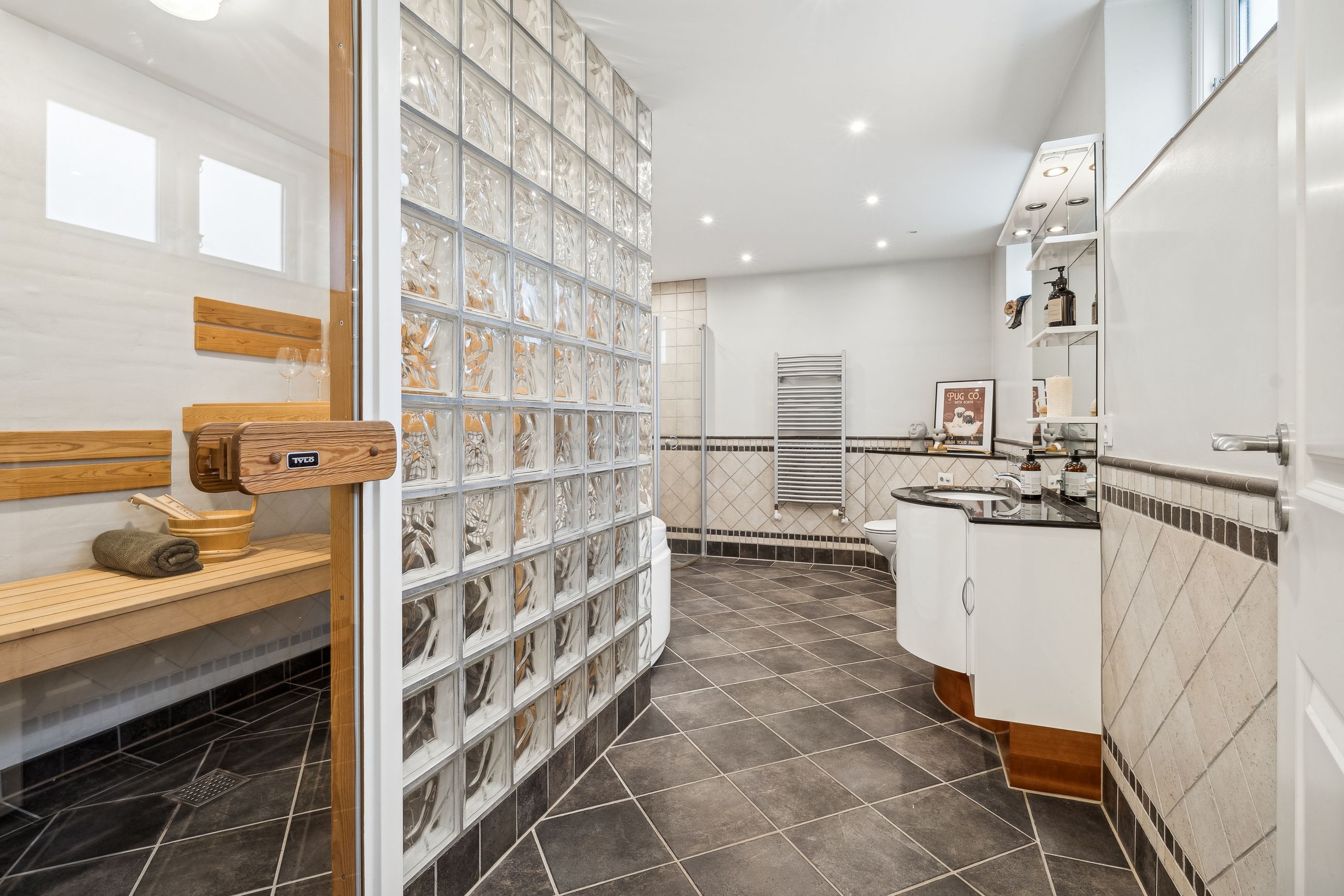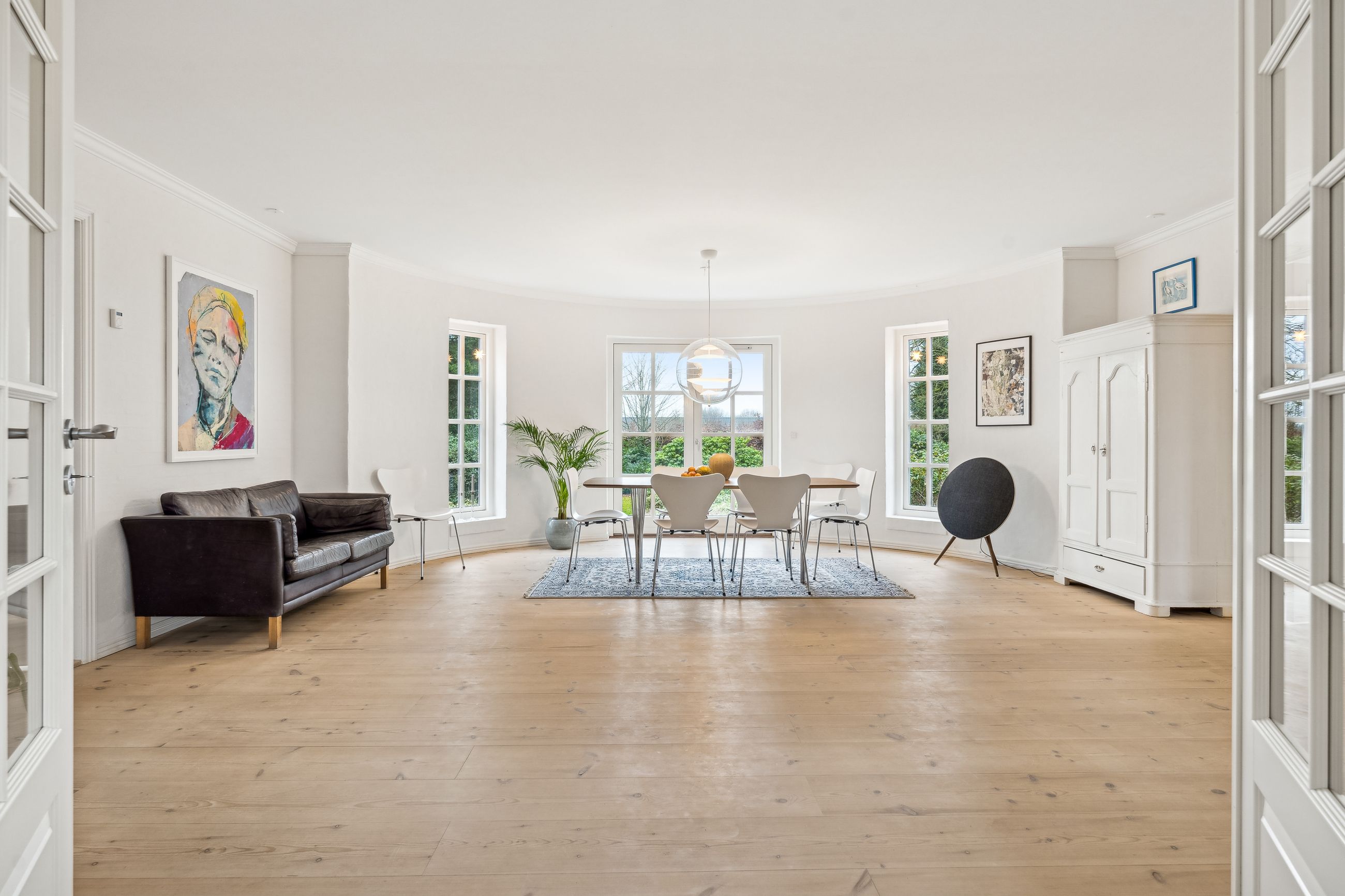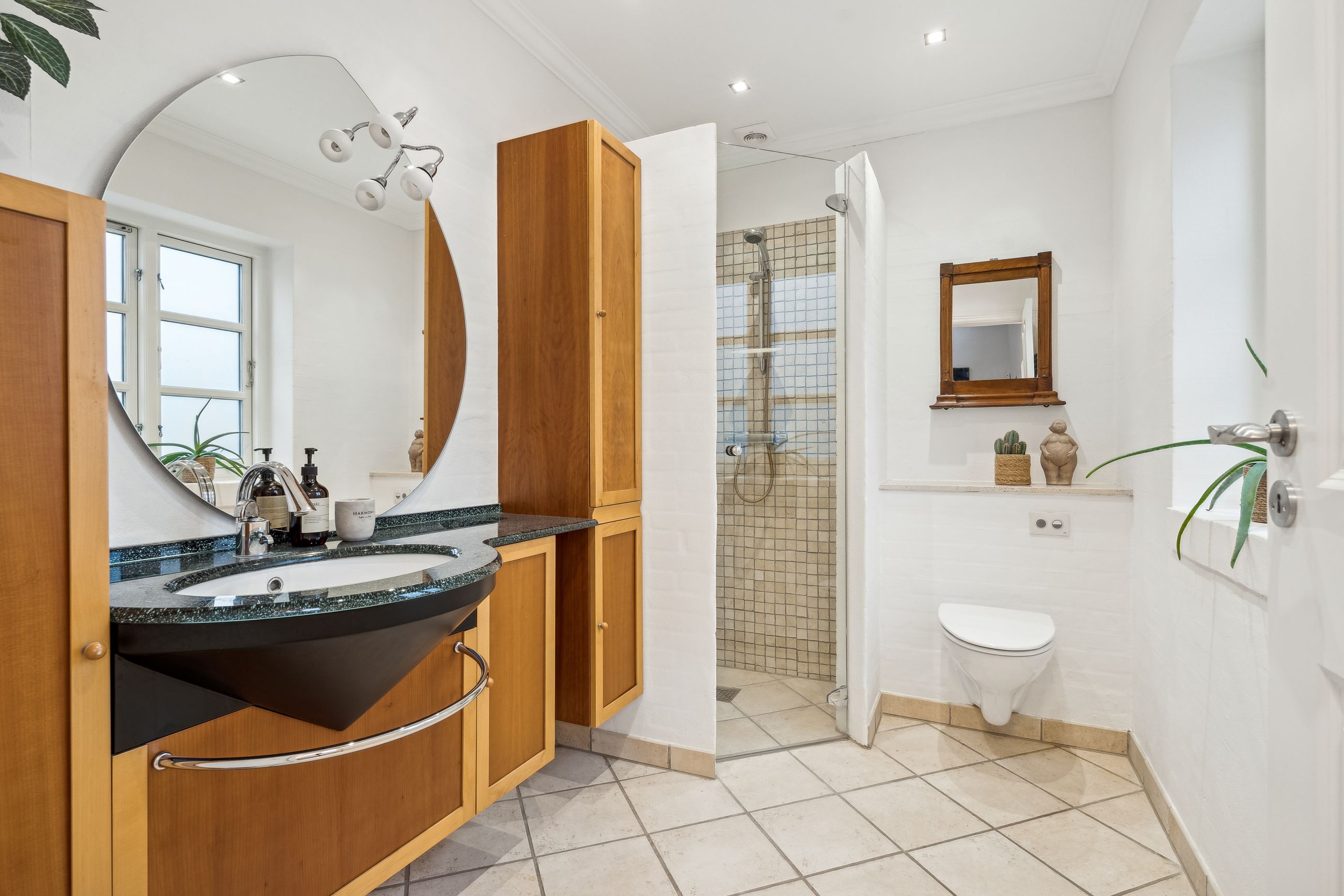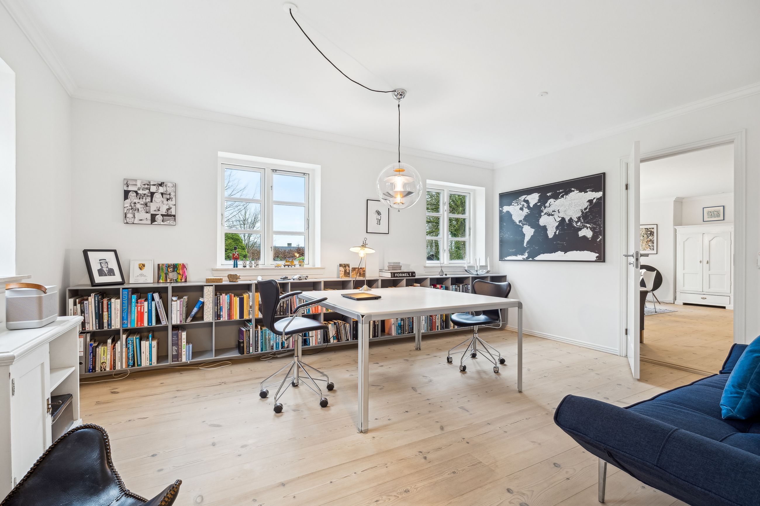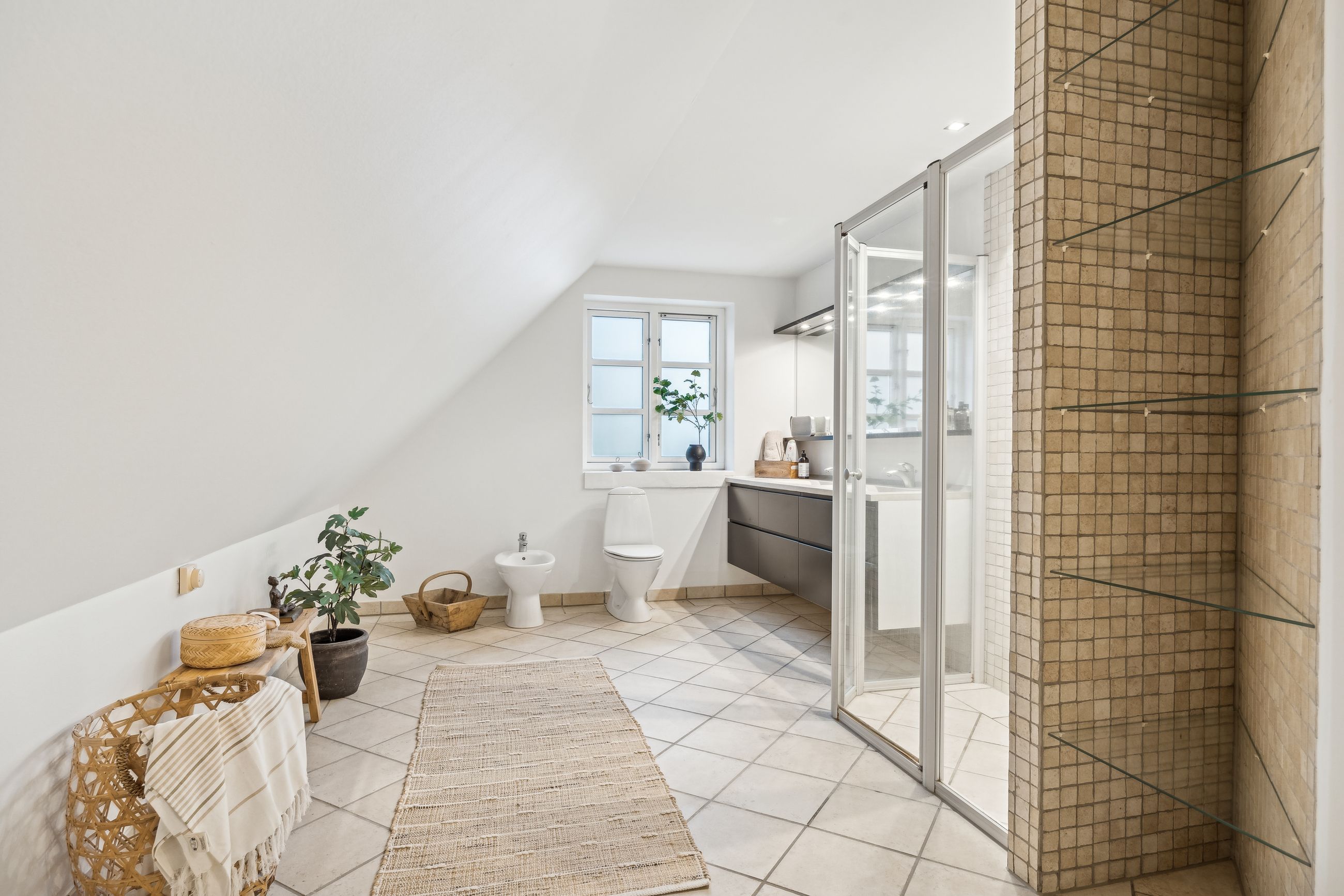 Indvendigt byder huset på i alt fem værelser og tre badeværelser. Stueplan rummer et stort køkken-alrum med karnap og udgang til terrasse samt en rummelig stue med flot lysindfald og endnu en terrassedør. Hertil kommer et stort værelse, et badeværelse og et praktisk grovkøkken. På førstesalen ligger fire værelser, herunder ét med adgang til altan mod sydvest, samt et stort badeværelse med dobbelt håndvask og bruseniche. I kælderen finder man husets tredje badeværelse, sauna, viktualierum, bryggers samt gode aktivitetsrum – oplagt til f.eks. billard, hjemmebiograf eller fitness.