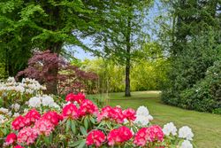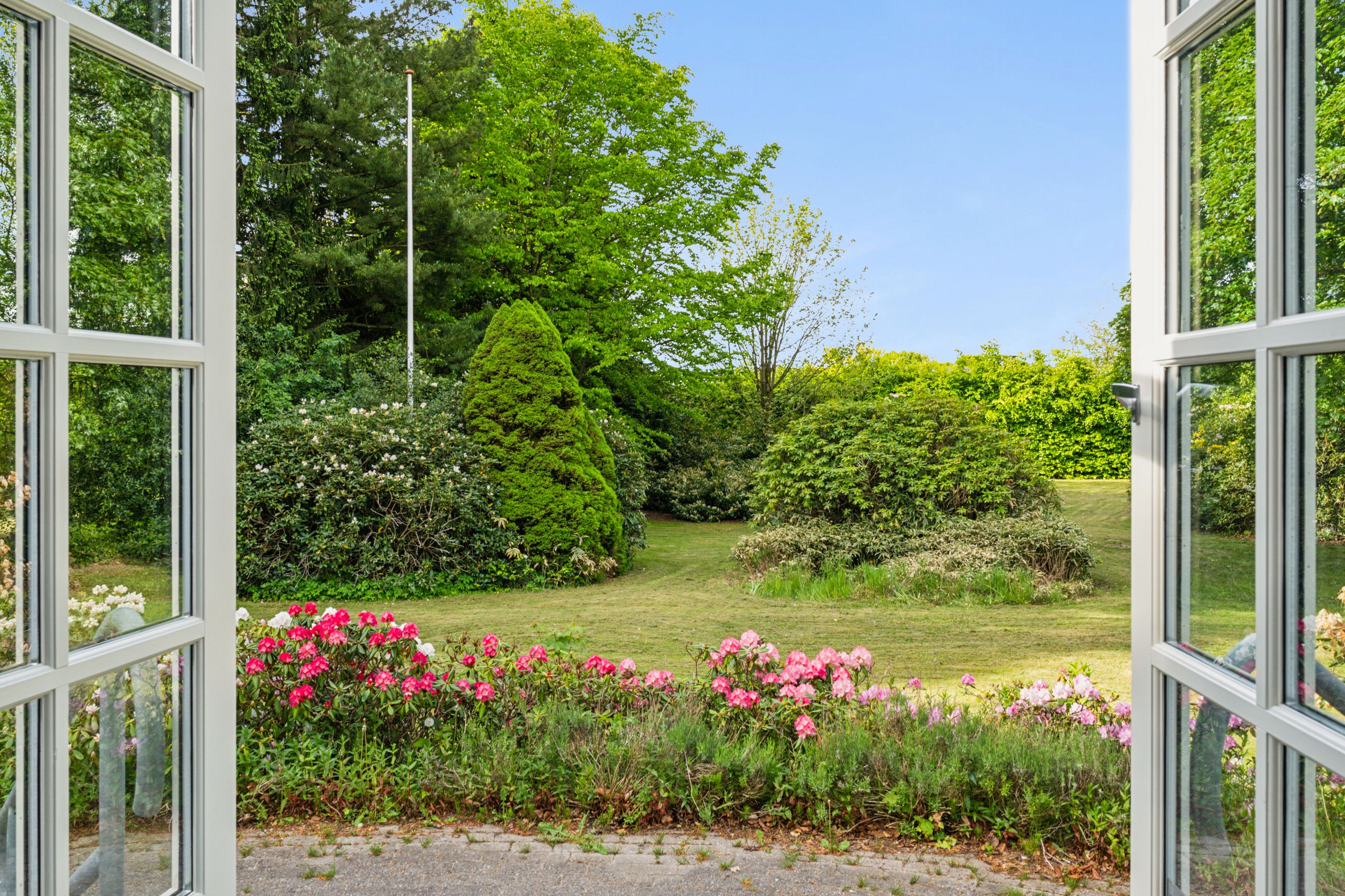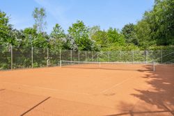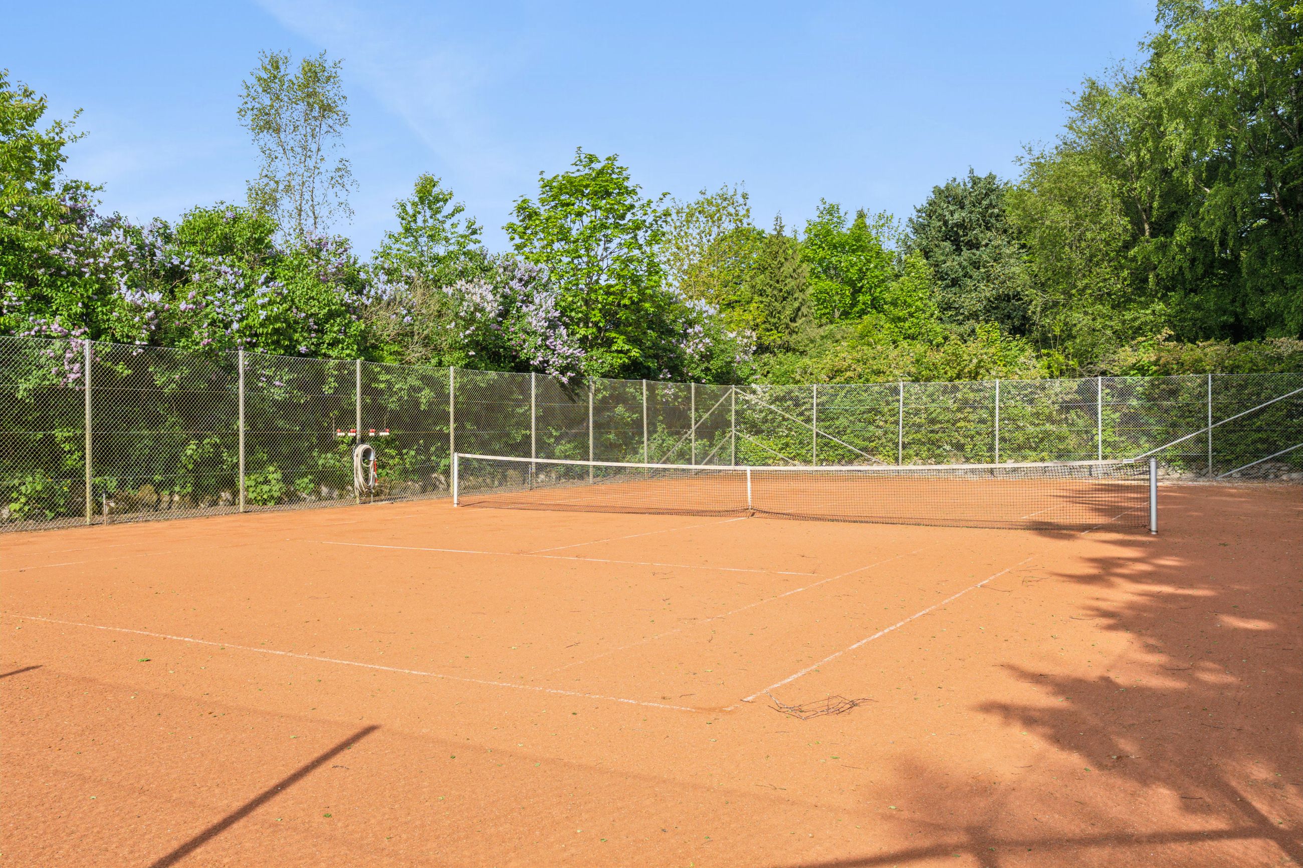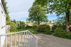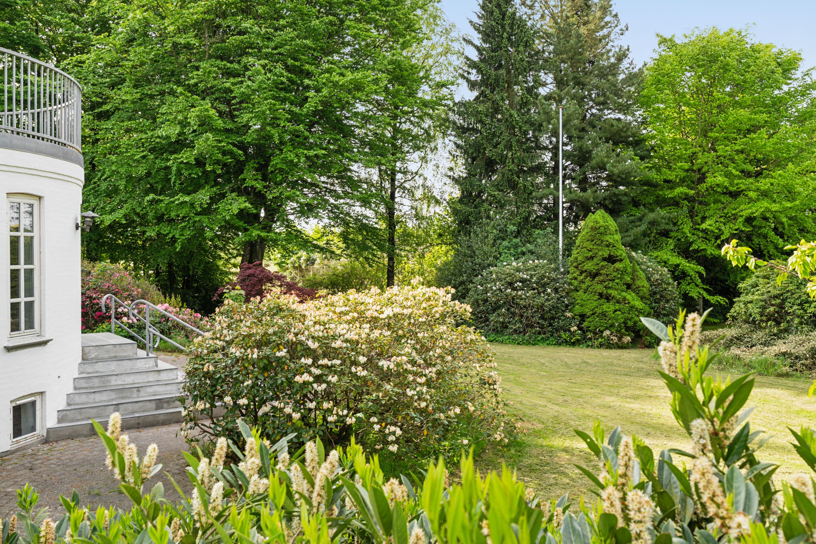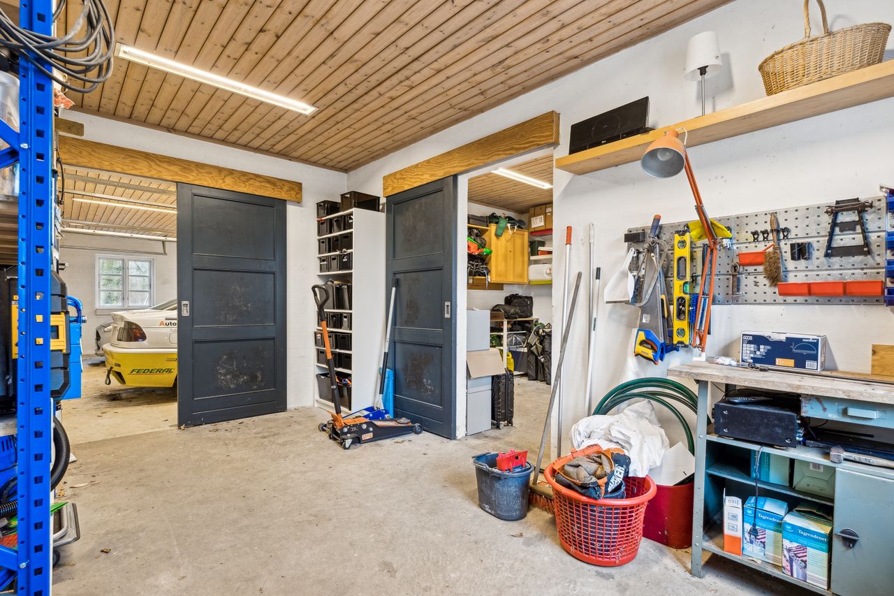 Grunden understreger ejendommens særlige karakter. Her er en velholdt grustennisbane med tilhørende hytte og overdækket terrasse, egen lille skov samt en idyllisk sø bagerst på grunden. Nær huset er haven anlagt med flere terrasser, gode opholdspladser og udsigt til det åbne landskab. Til ejendommen hører desuden en stor garage, der arkitektonisk matcher boligen.