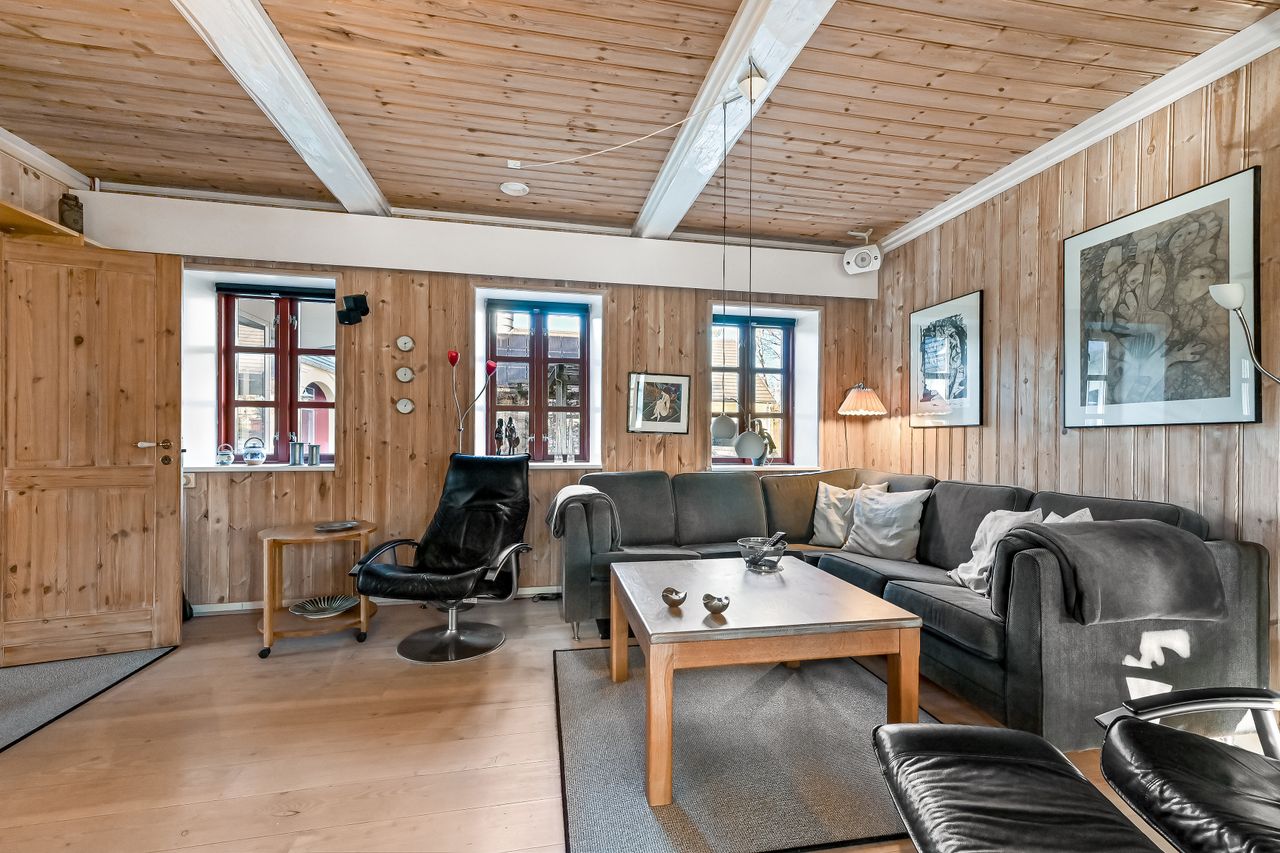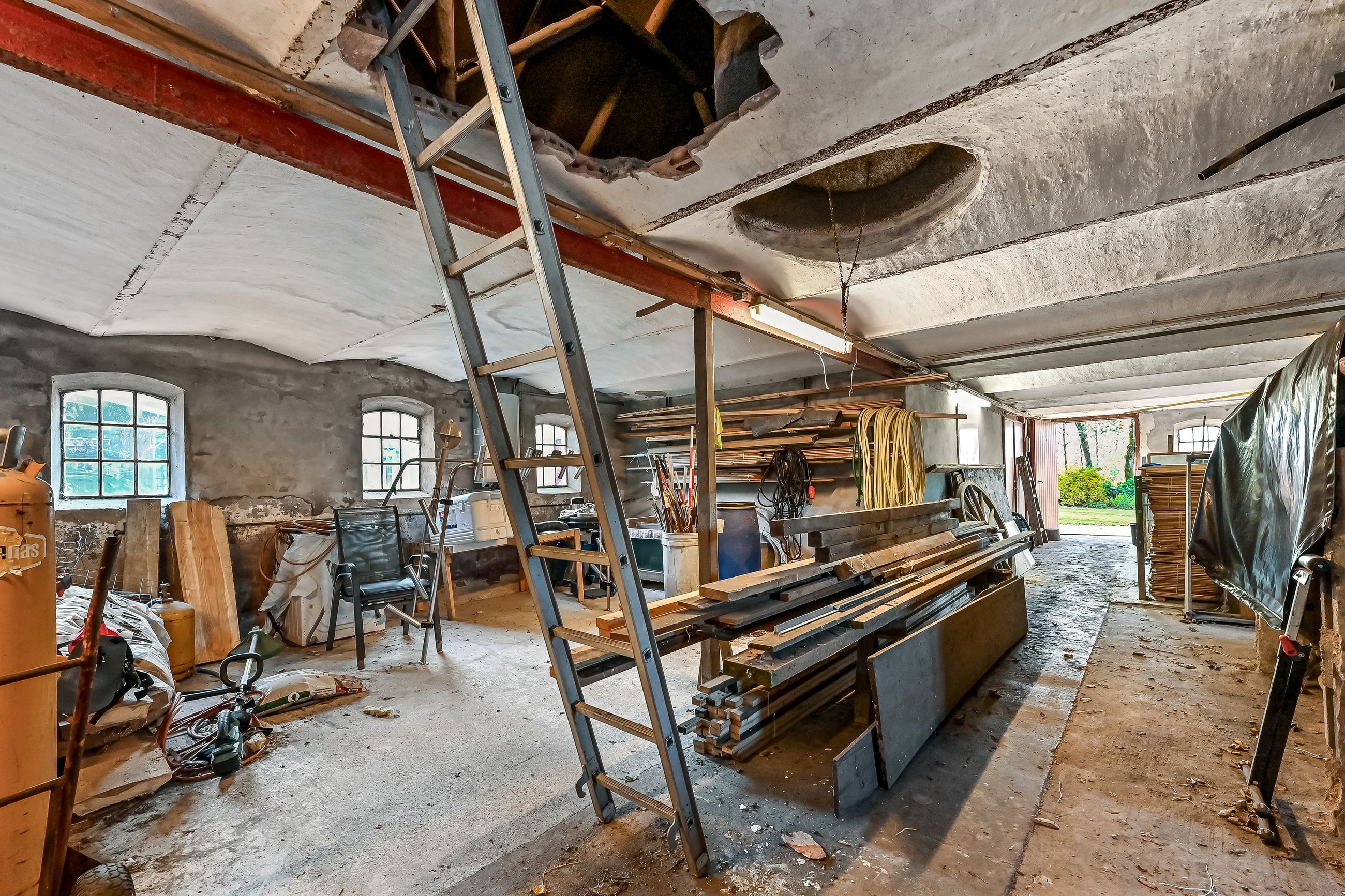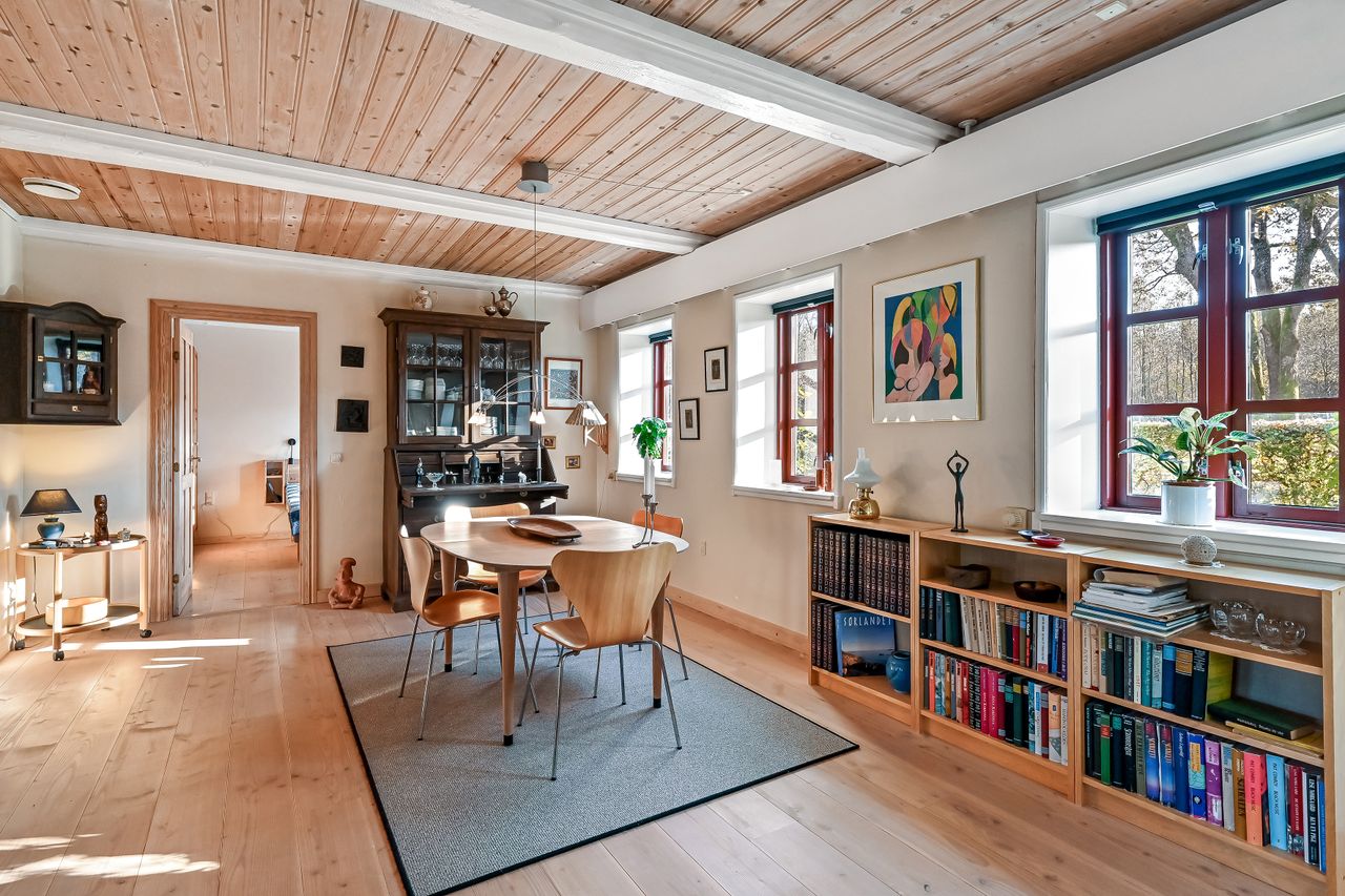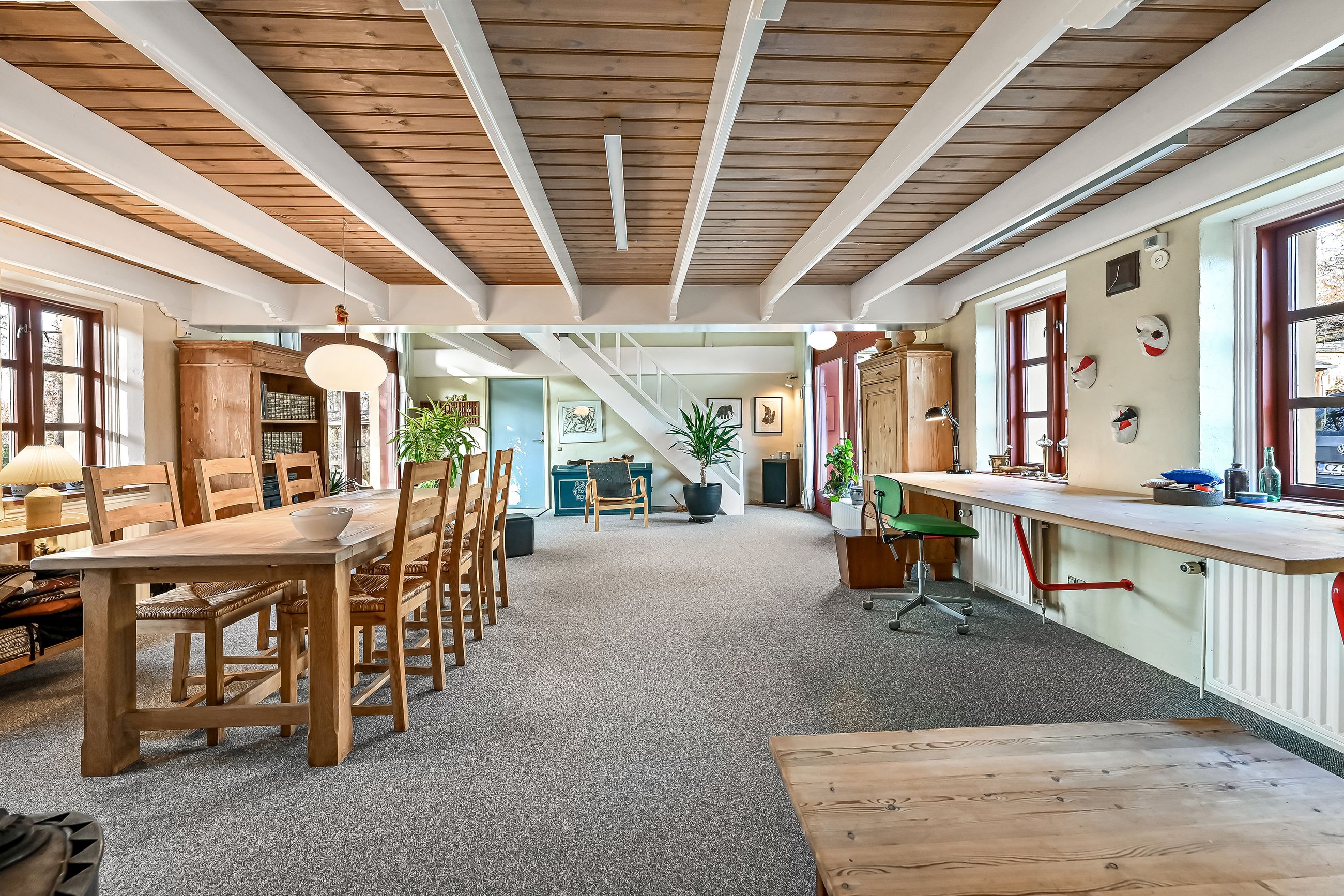 Den gamle ladebygning er nænsomt renoveret for at skabe ekstra opholdsrum med mange anvendelsesmuligheder. Her finder du endnu et badeværelse samt en lækker og lys gildesal – perfekt til festlige sammenkomster eller kreative projekter. Det store repos leder videre til to yderligere værelser, hvilket gør det ideelt som teenageafdeling eller gæsteområde.