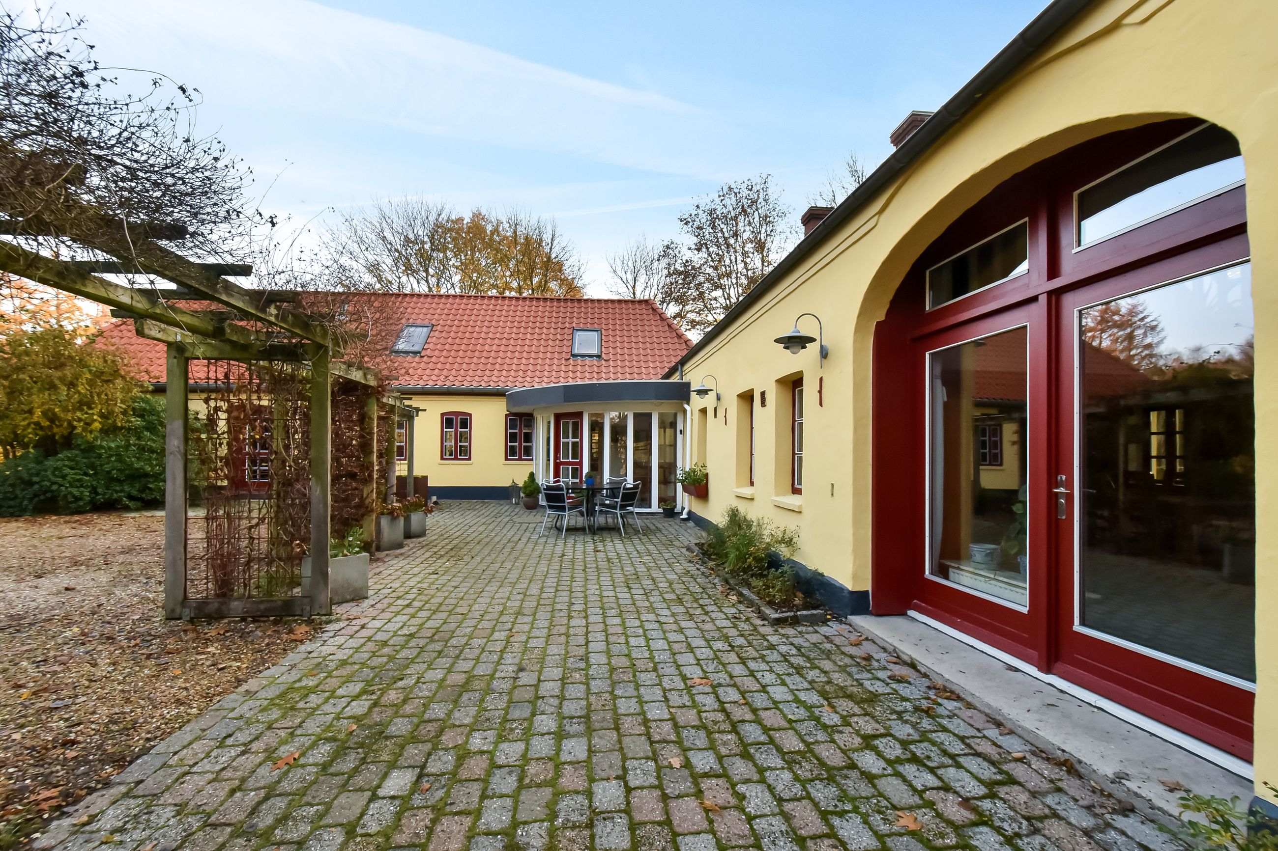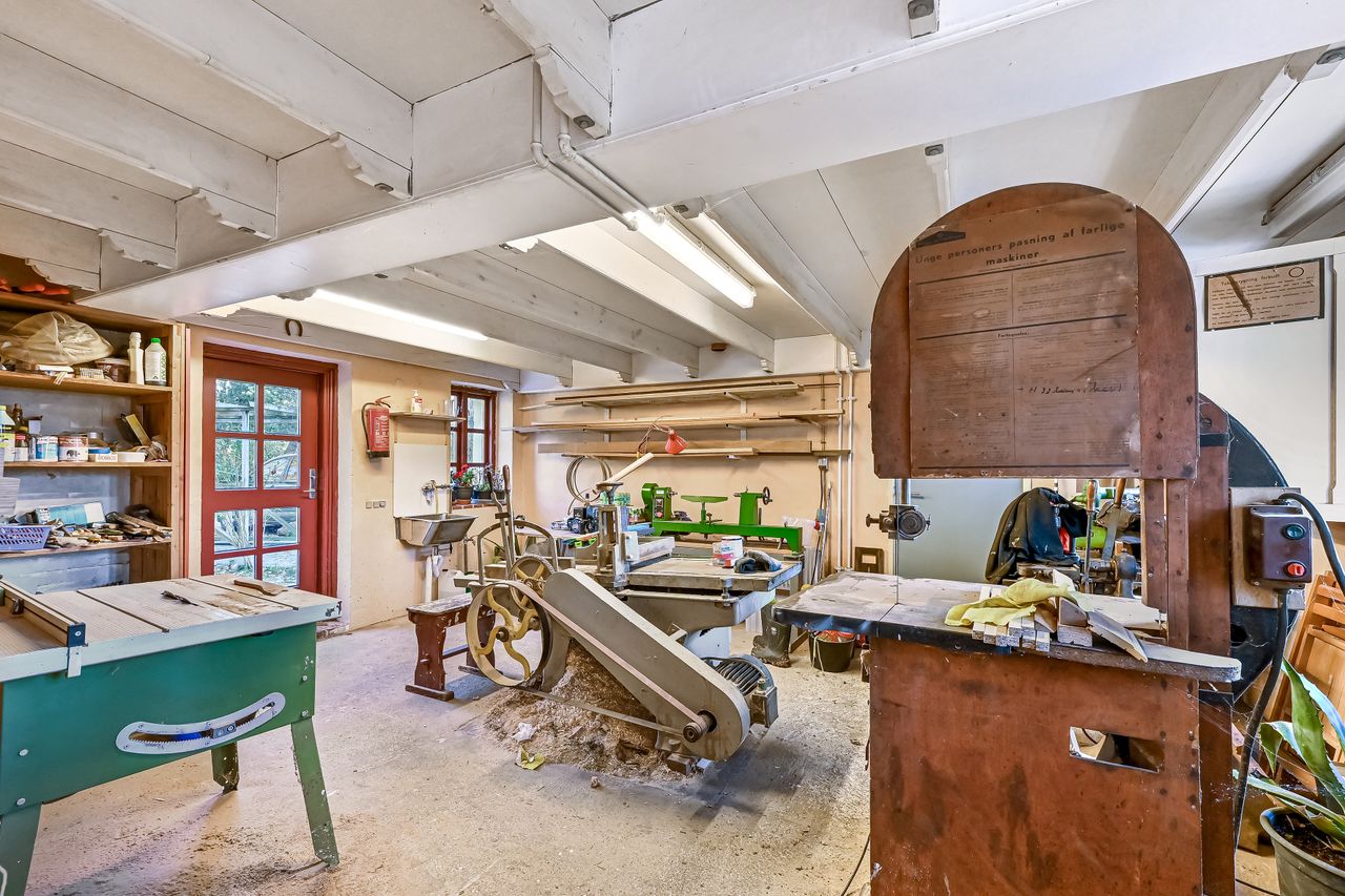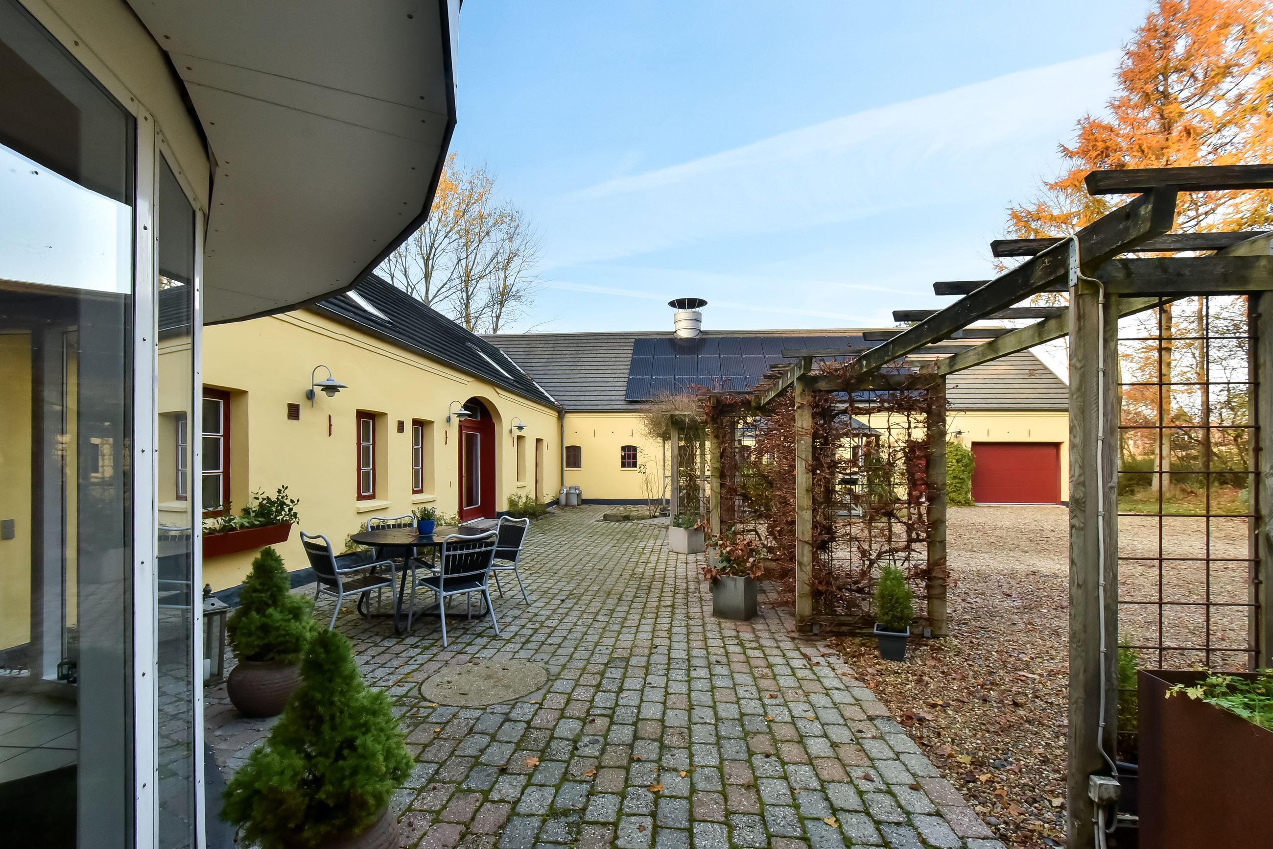 Udenfor venter en hyggelig gårdhave med flere kroge, hvor man kan nyde morgenkaffen i fredelige omgivelser til fuglekvidder. Derudover findes værksted, garage samt et gammelt staldafsnit – perfekt til hobbyprojekter eller opbevaring af maskiner.
