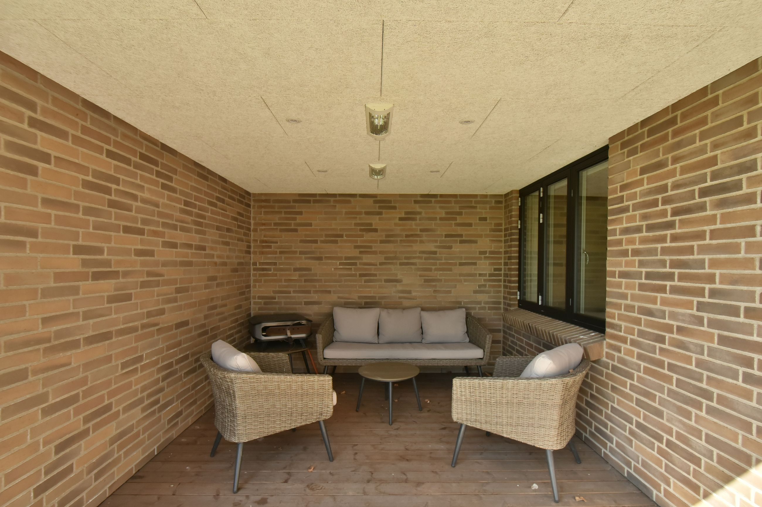Flere solterrasser rundt om ejendommen samt overdækket areal, hvor spa/jacuzzi er installeret og medfølger i handlen.