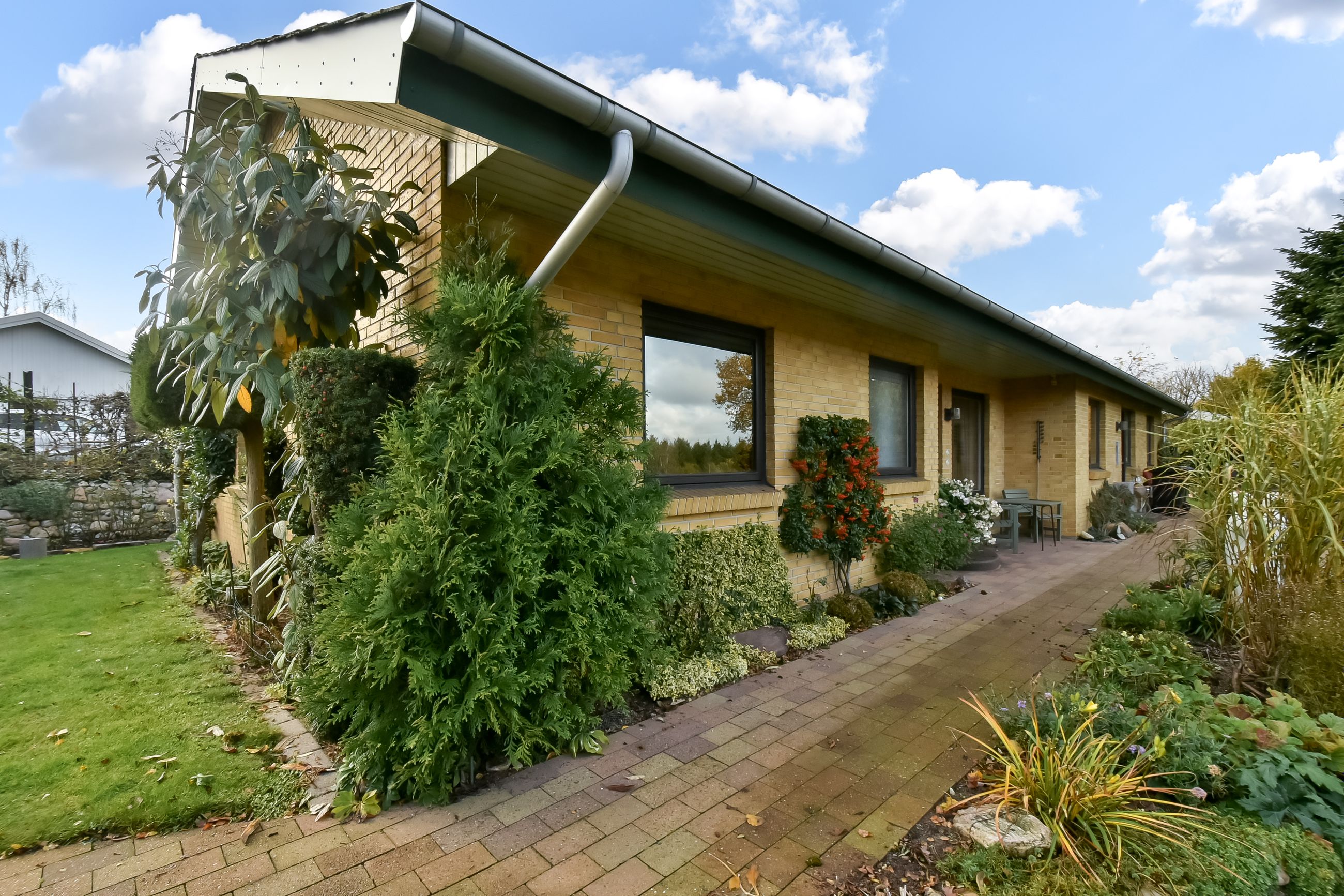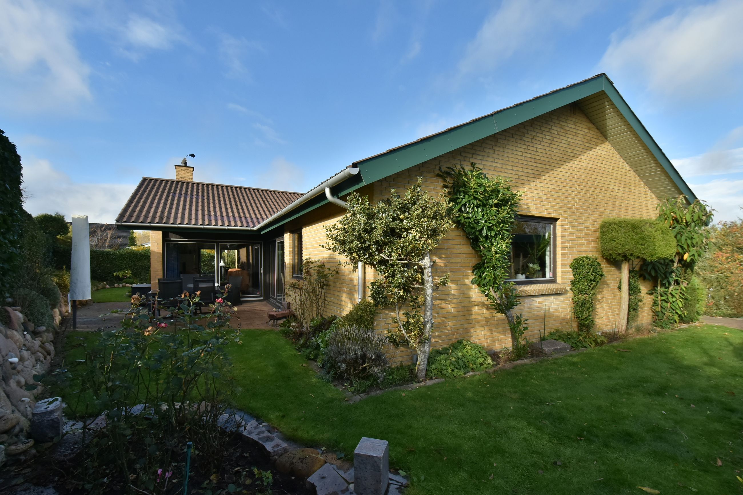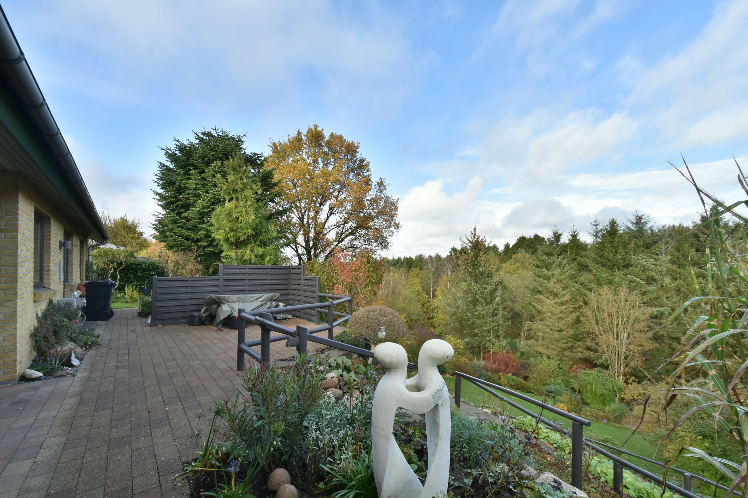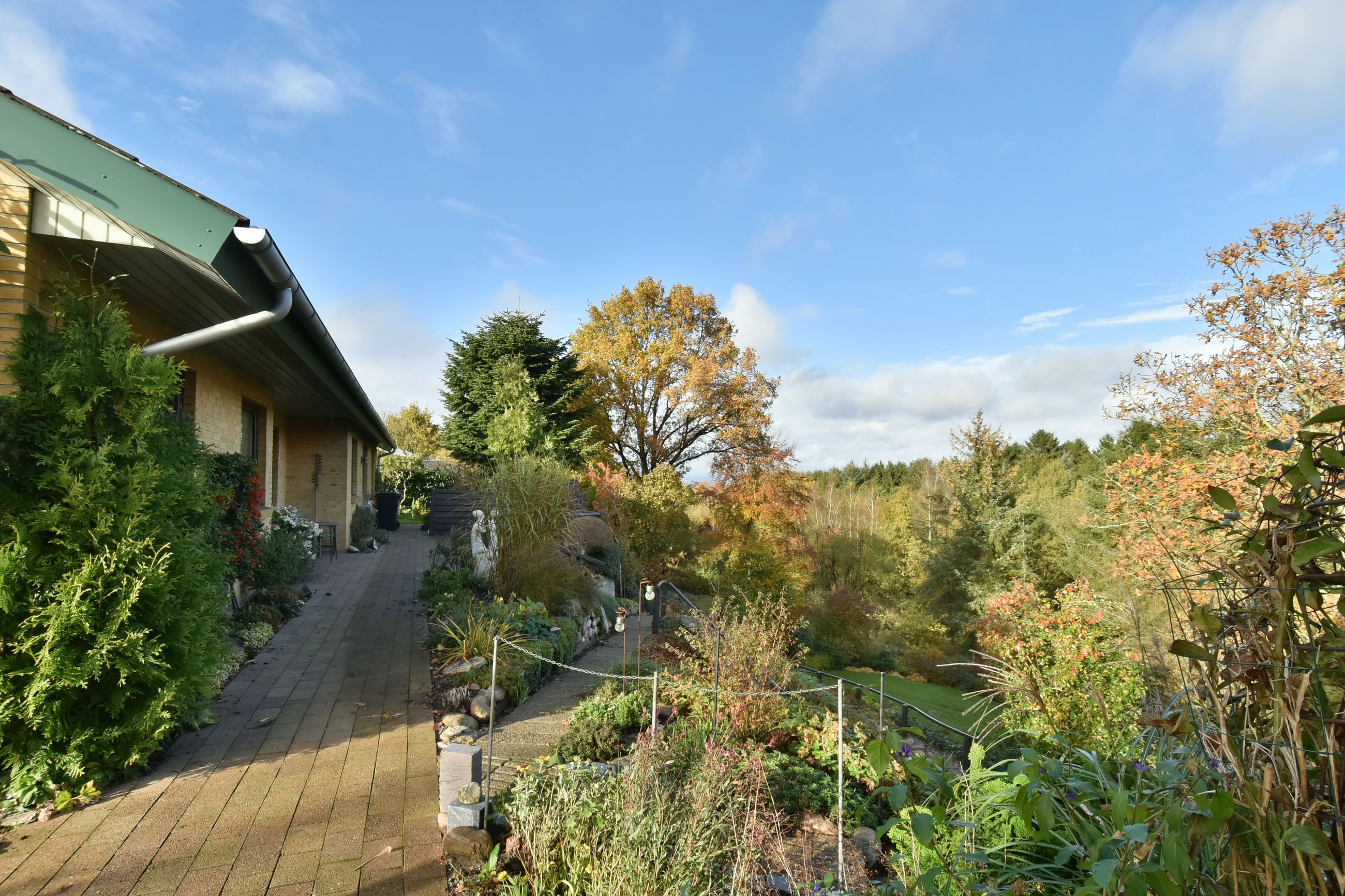 Udenfor venter en imponerende have opdelt i flere niveauer, hvilket skaber en unik atmosfære fyldt med charme. Haven er inddelt i bede, der vidner om kærlig pleje gennem årene. Her kan man nyde udsigten til det grønne læbælte samtidig med at man befinder sig helt centralt i Give - noget som sjældent kan kombineres så godt som her. Derudover er der en hyggelig havestue i haven hvorfra man kan nyde årstidernes skiften.