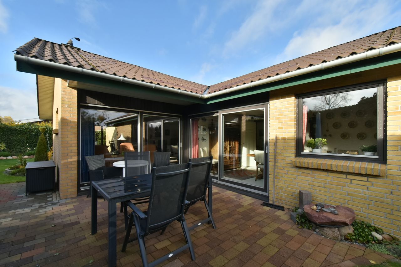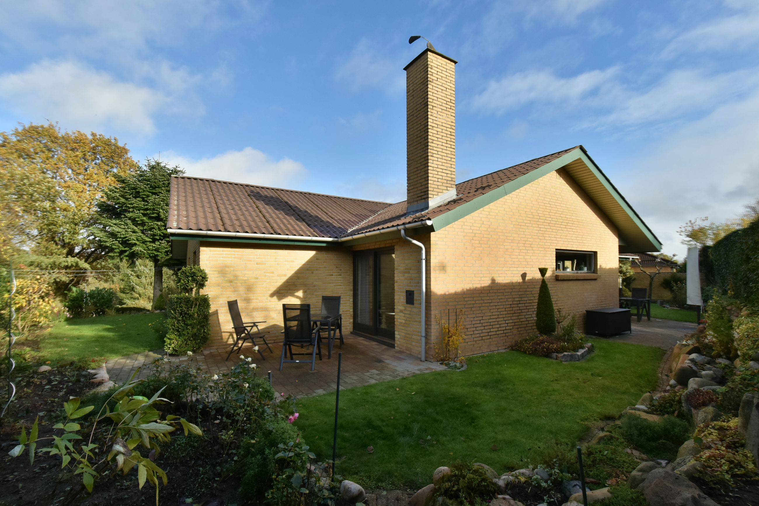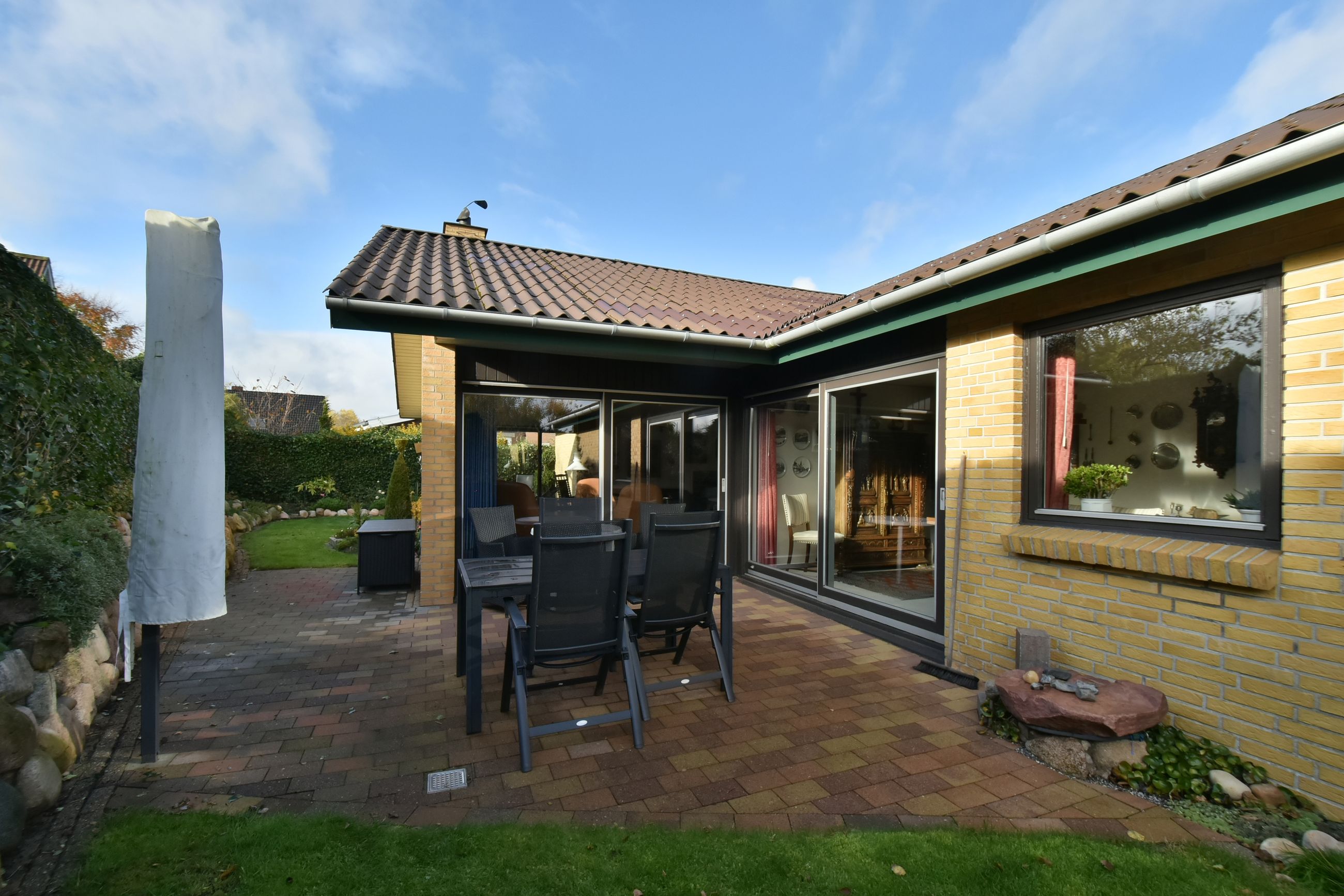 Udenfor venter en imponerende have opdelt i flere niveauer, hvilket skaber en unik atmosfære fyldt med charme. Haven er inddelt i bede, der vidner om kærlig pleje gennem årene. Her kan man nyde udsigten til det grønne læbælte samtidig med at man befinder sig helt centralt i Give - noget som sjældent kan kombineres så godt som her. Derudover er der en hyggelig havestue i haven hvorfra man kan nyde årstidernes skiften.
