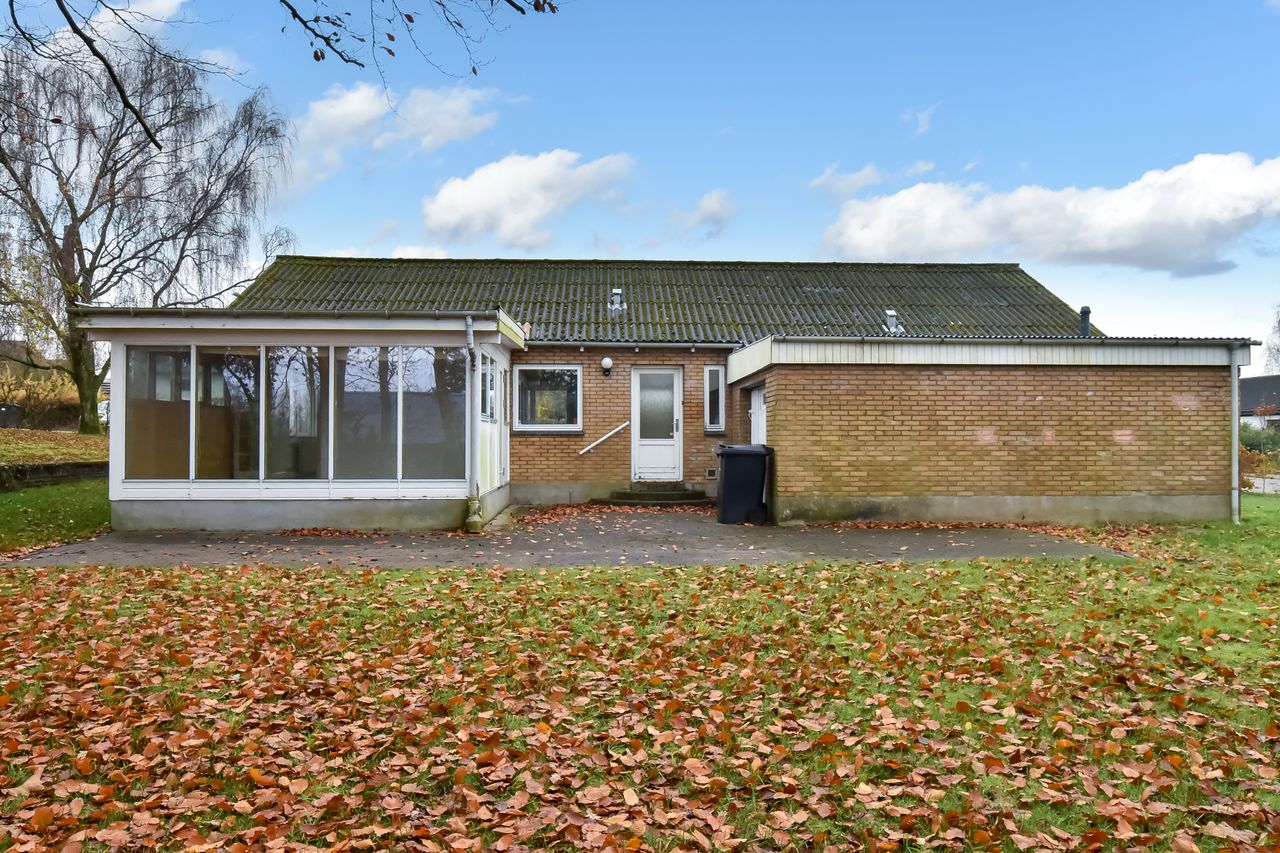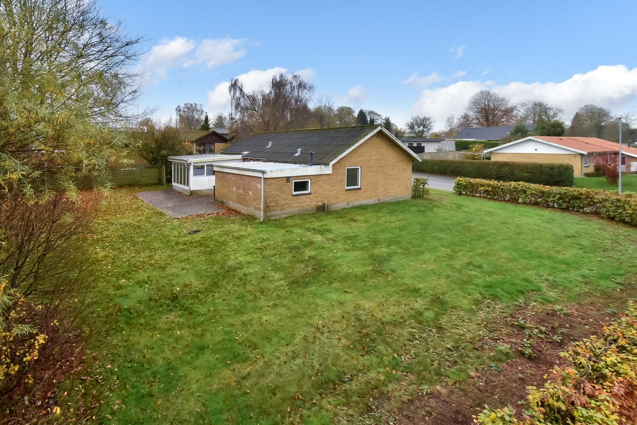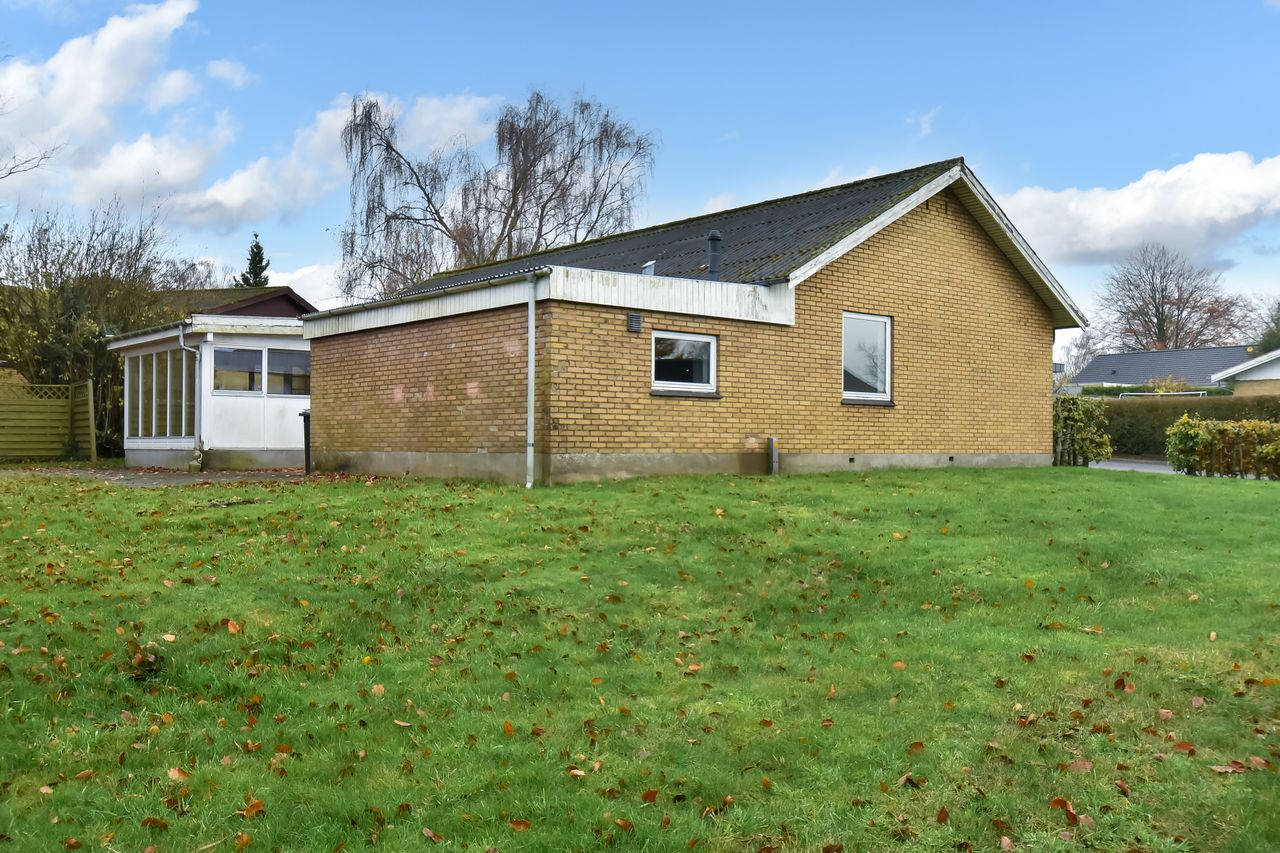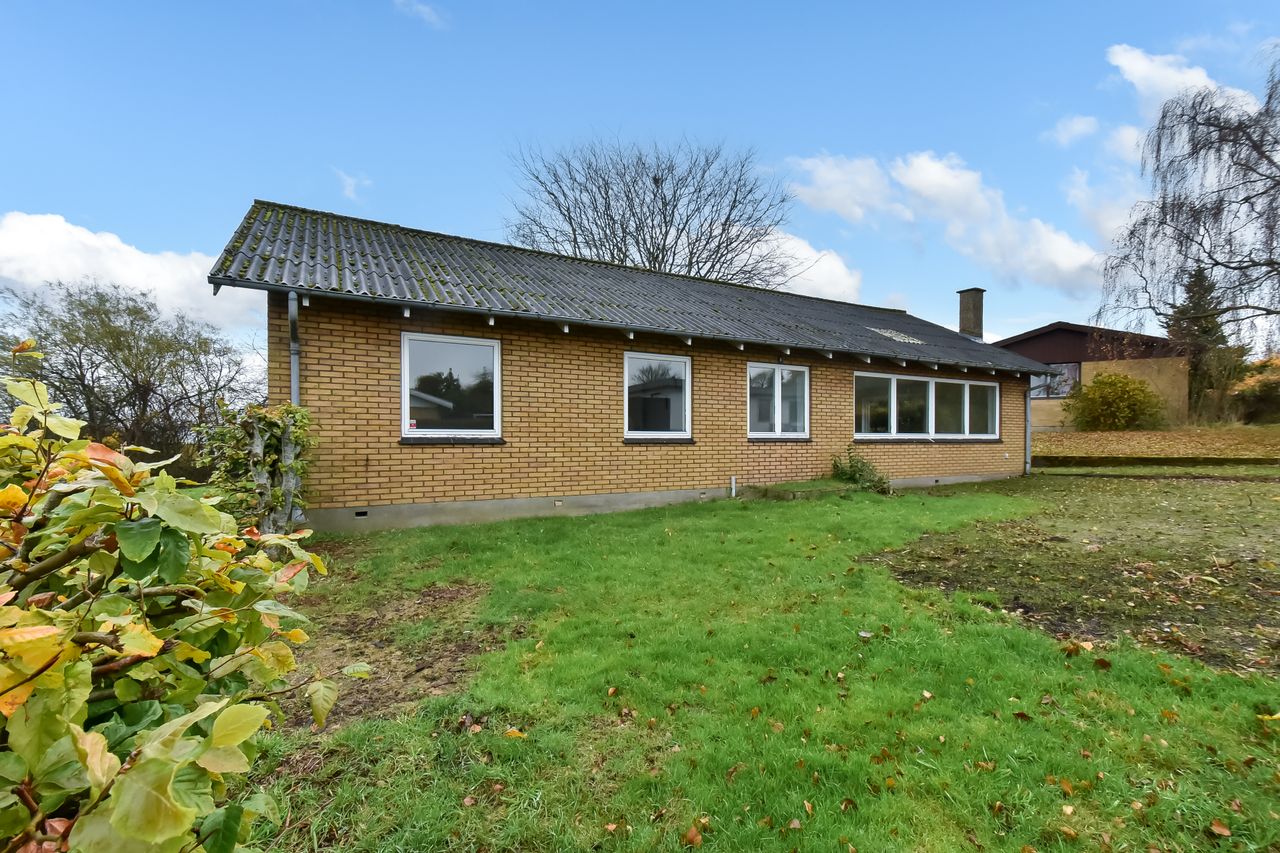 Centralt beliggende og tæt på bymidten i Thyregod. I et rolig og veletableret villakvarterer, finder du dette charmerende parcelhus. Et velholdt hus, hvor der er masser af personlighed og charme. Boligen er opført i 1963, og byder på en god indretning med mulighed for at sætte sit eget præg. Boligarealet er på 125 m2. Man træder ind i husets bryggers, som fører dig videre til køkkenet der fremstår pænt og velholdt. Fra køkkenet træder man ind i den lyse vinkelstue, som er rummelig og fyldes af masser af lys fra sine store vinduespartier. Herfra kan du træde ud i den hyggelige udestue hvor udsigten til haven kan nydes i fulde drag.En lille fordeler gang leder dig rundt i resten af huset, om man vil på badeværelset, ind i ét af de tre værelser, eller til soveværelset. Foruden boligen, hører der et stort disp.rum på ca. 20 m2. Her er der god plads til værksted, eller blot som et ekstra depot til opbevaring. Udendørs får du en grund på 976 m2 der er anlagt i græsplæne og en terrasse i forlængelse af udestuen, hvor der er god plads til både afslapning, leg og hygge i dagens lyse timer.