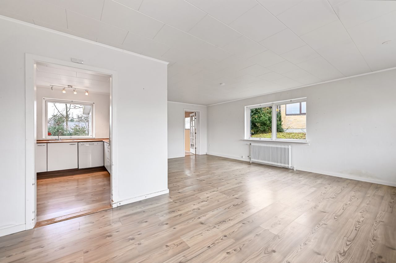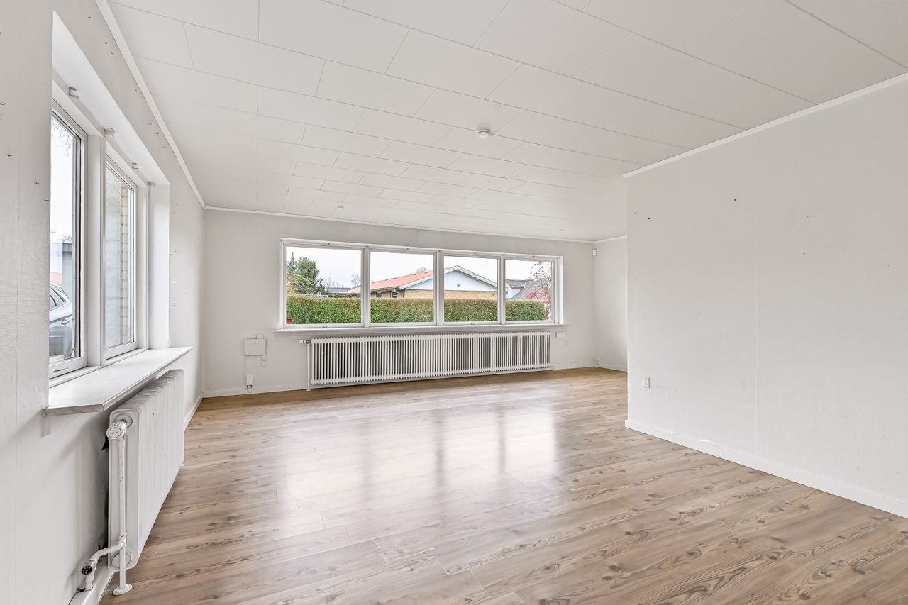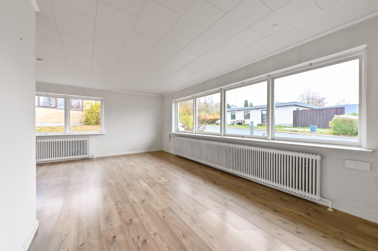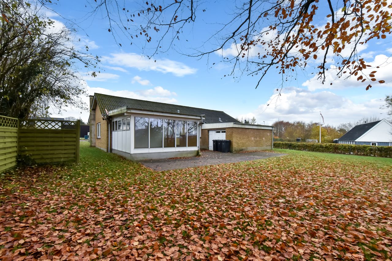 Centralt beliggende og tæt på bymidten i Thyregod. I et rolig og veletableret villakvarterer, finder du dette charmerende parcelhus. Et velholdt hus, hvor der er masser af personlighed og charme. Boligen er opført i 1963, og byder på en god indretning med mulighed for at sætte sit eget præg. Boligarealet er på 125 m2. Man træder ind i husets bryggers, som fører dig videre til køkkenet der fremstår pænt og velholdt. Fra køkkenet træder man ind i den lyse vinkelstue, som er rummelig og fyldes af masser af lys fra sine store vinduespartier. Herfra kan du træde ud i den hyggelige udestue hvor udsigten til haven kan nydes i fulde drag.En lille fordeler gang leder dig rundt i resten af huset, om man vil på badeværelset, ind i ét af de tre værelser, eller til soveværelset. Foruden boligen, hører der et stort disp.rum på ca. 20 m2. Her er der god plads til værksted, eller blot som et ekstra depot til opbevaring. Udendørs får du en grund på 976 m2 der er anlagt i græsplæne og en terrasse i forlængelse af udestuen, hvor der er god plads til både afslapning, leg og hygge i dagens lyse timer.