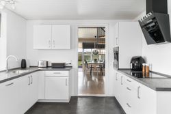 gammelt Vordingborg-køkken med komposit-vinduer, der lukker solen ind i morgentimerne.