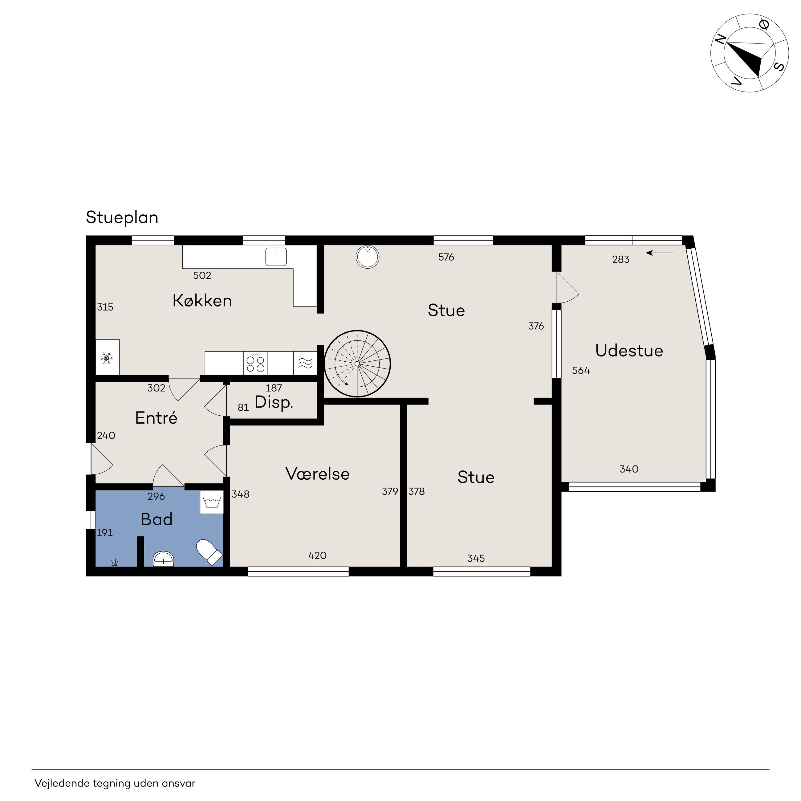 Stuen får lysindfald fra hele tre sider, og her er der brændeovn og udgang til udestuen mod syd. Denne er