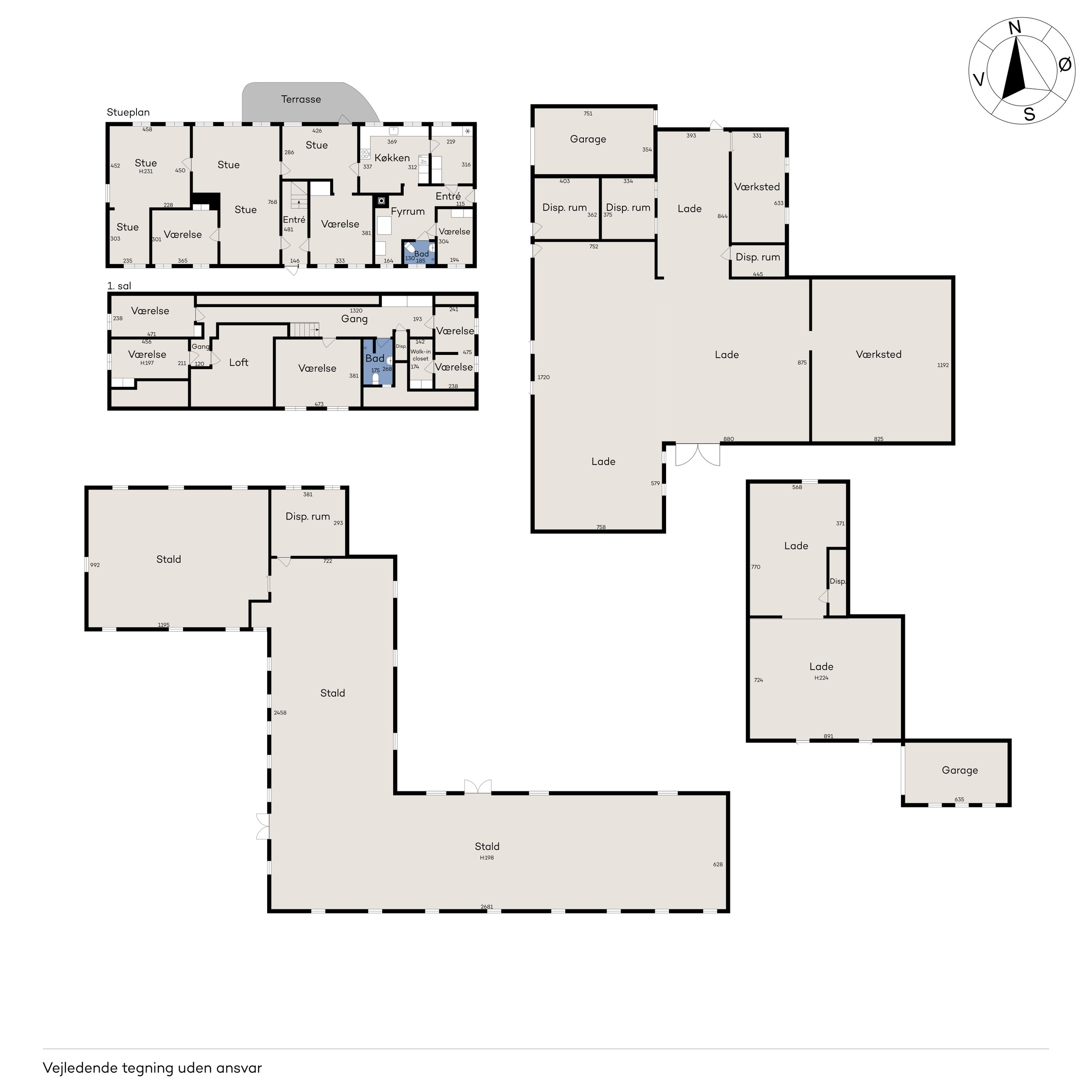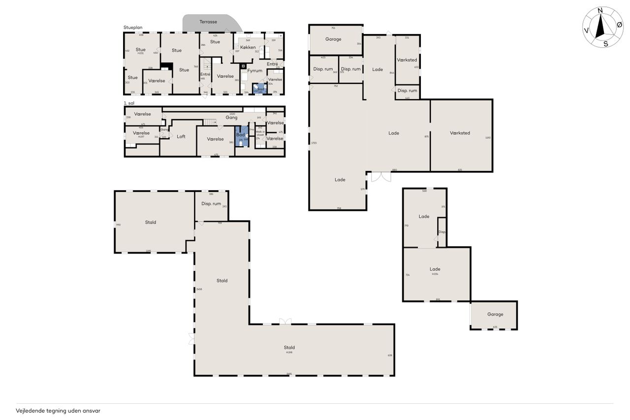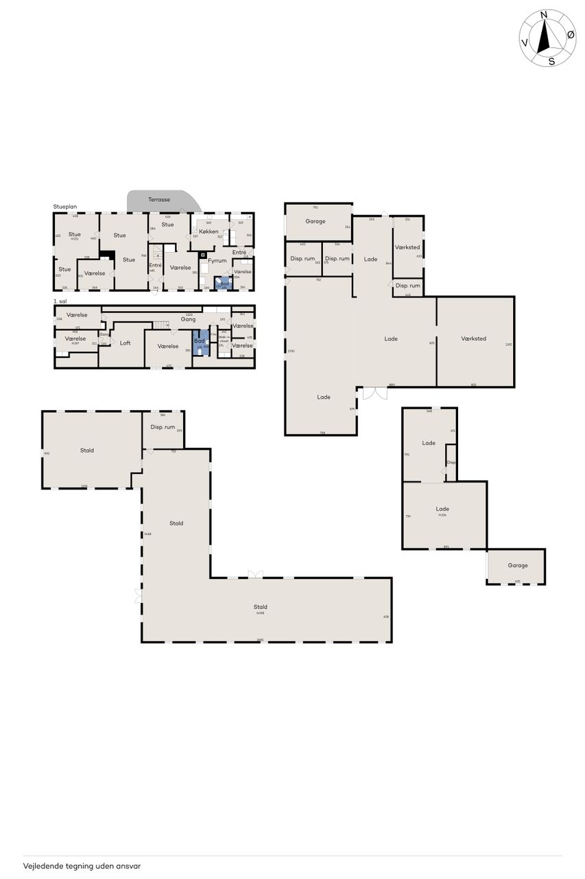 får et stuehus på 235 m2 i fuldt funktionel stand samt et udvalg af udbygninger af forskellig størrelse og