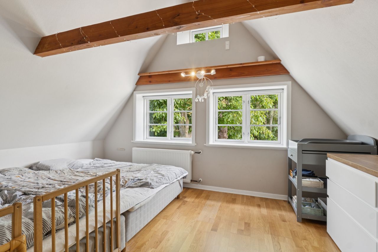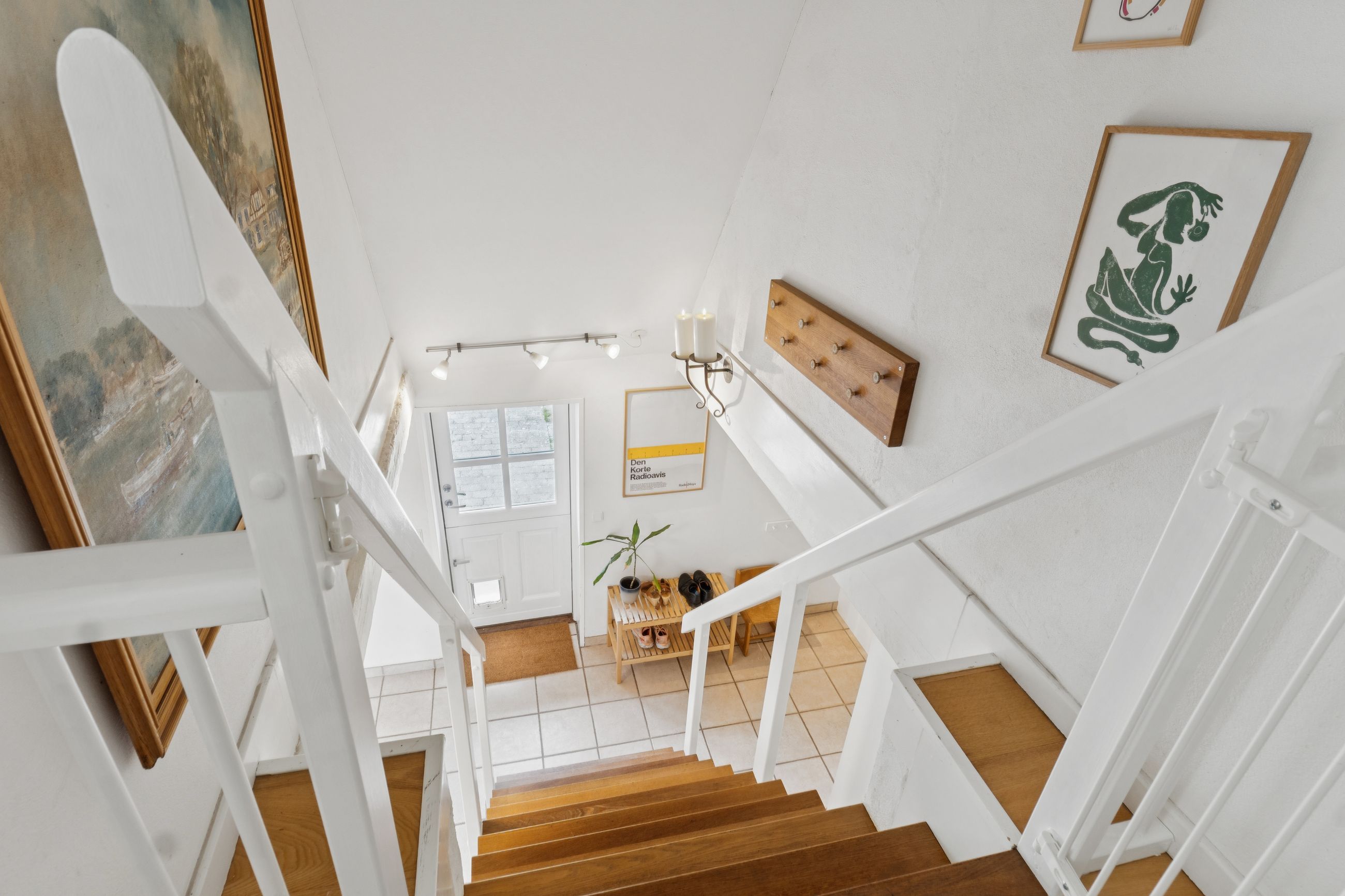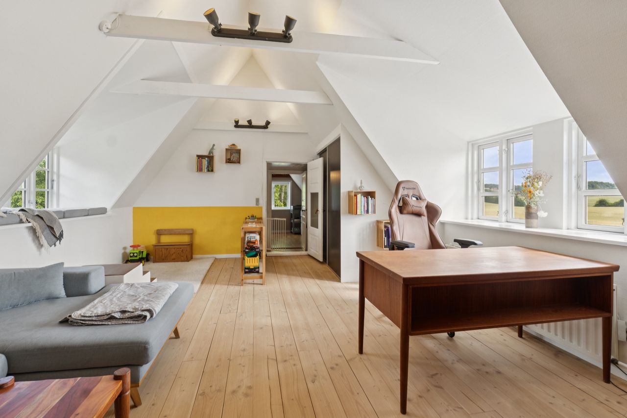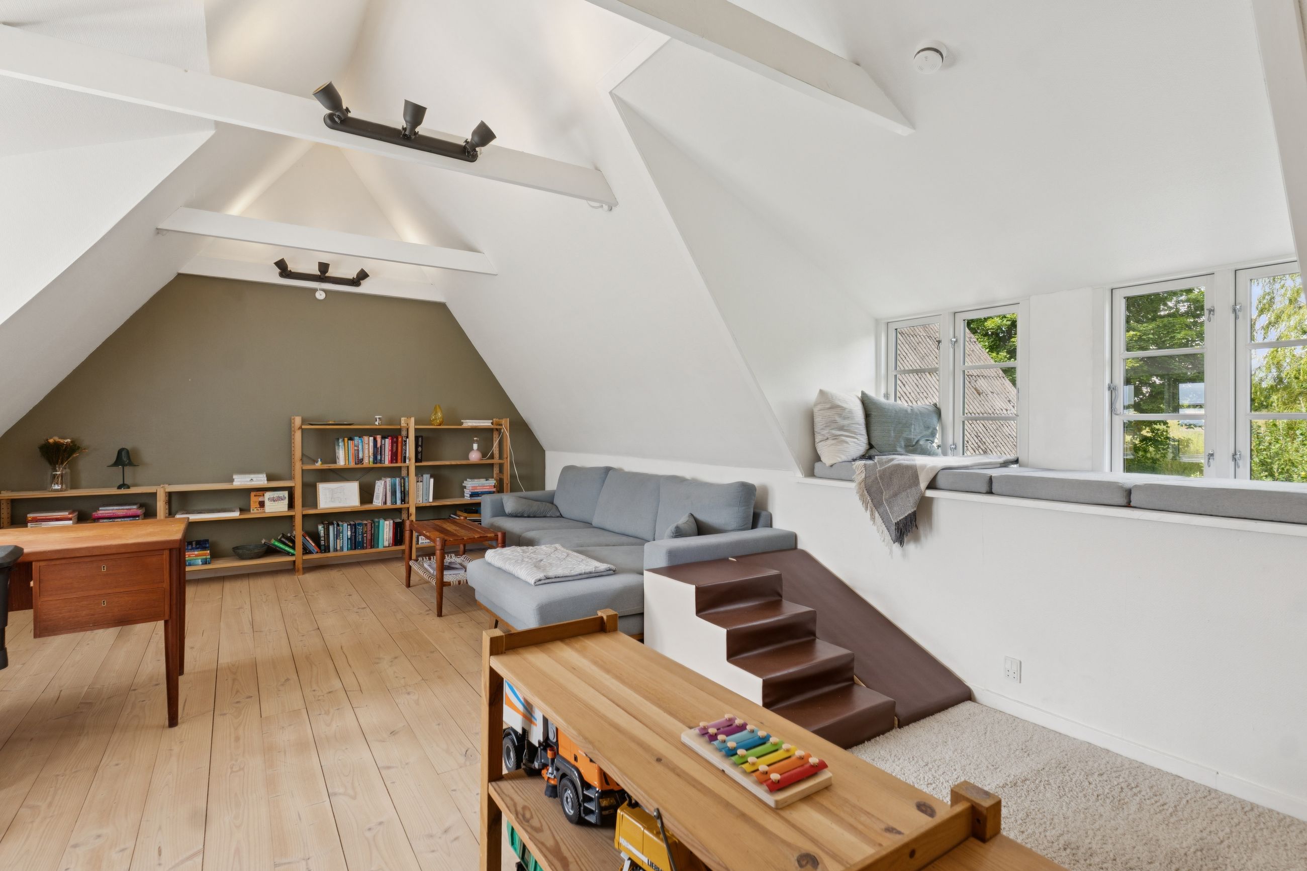 Et par trin oppe finder I den hyggelige stue med udsigt til haven og marken, mens stueplan desuden byder på endnu et åbent køkken, to badeværelser med brus, bryggers og to værelser. På første sal venter to store værelser og en stor opholdsstue med fleksible indretningsmuligheder – hjemmearbejdsplads, kreativt værksted, teenagestue eller legerum.