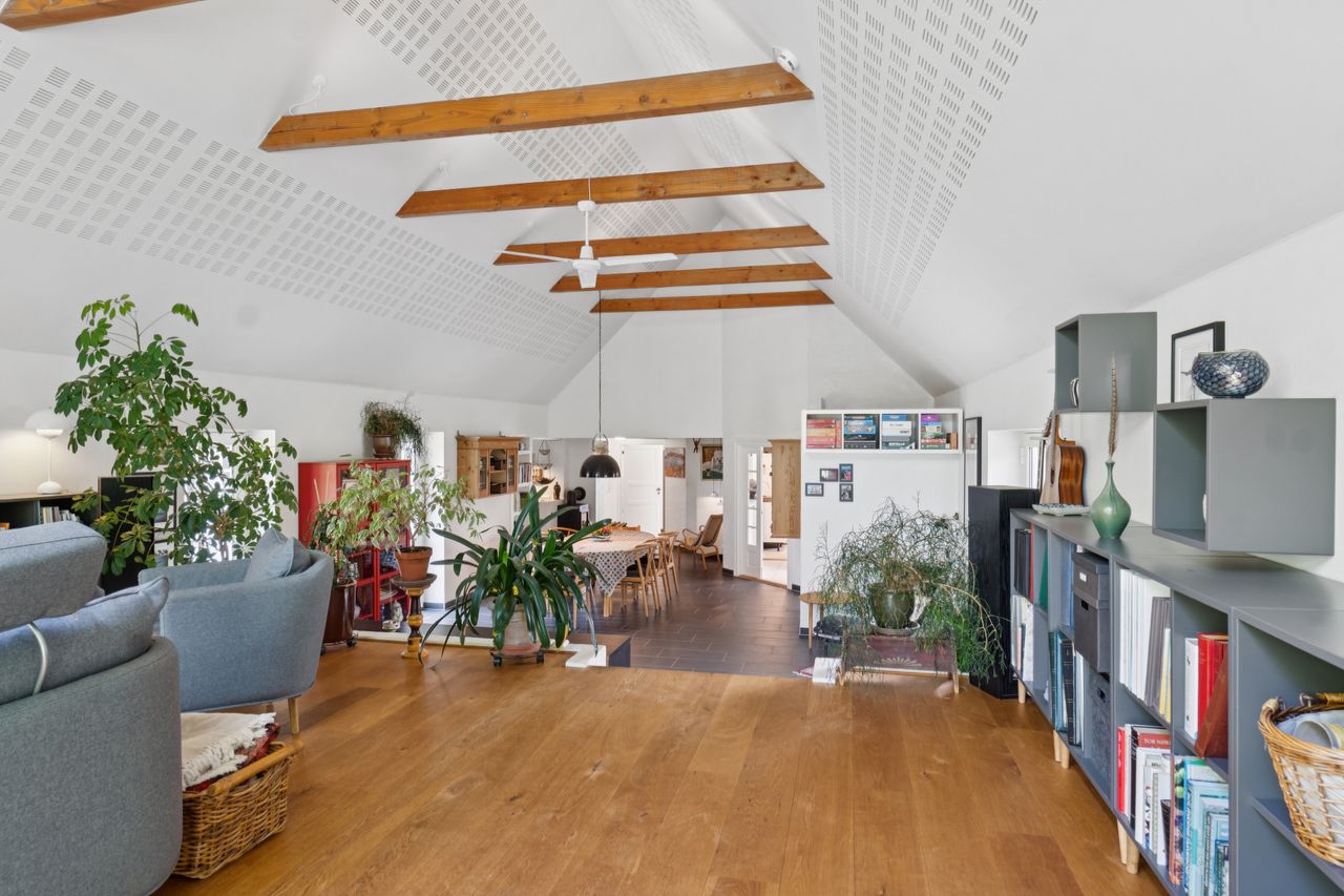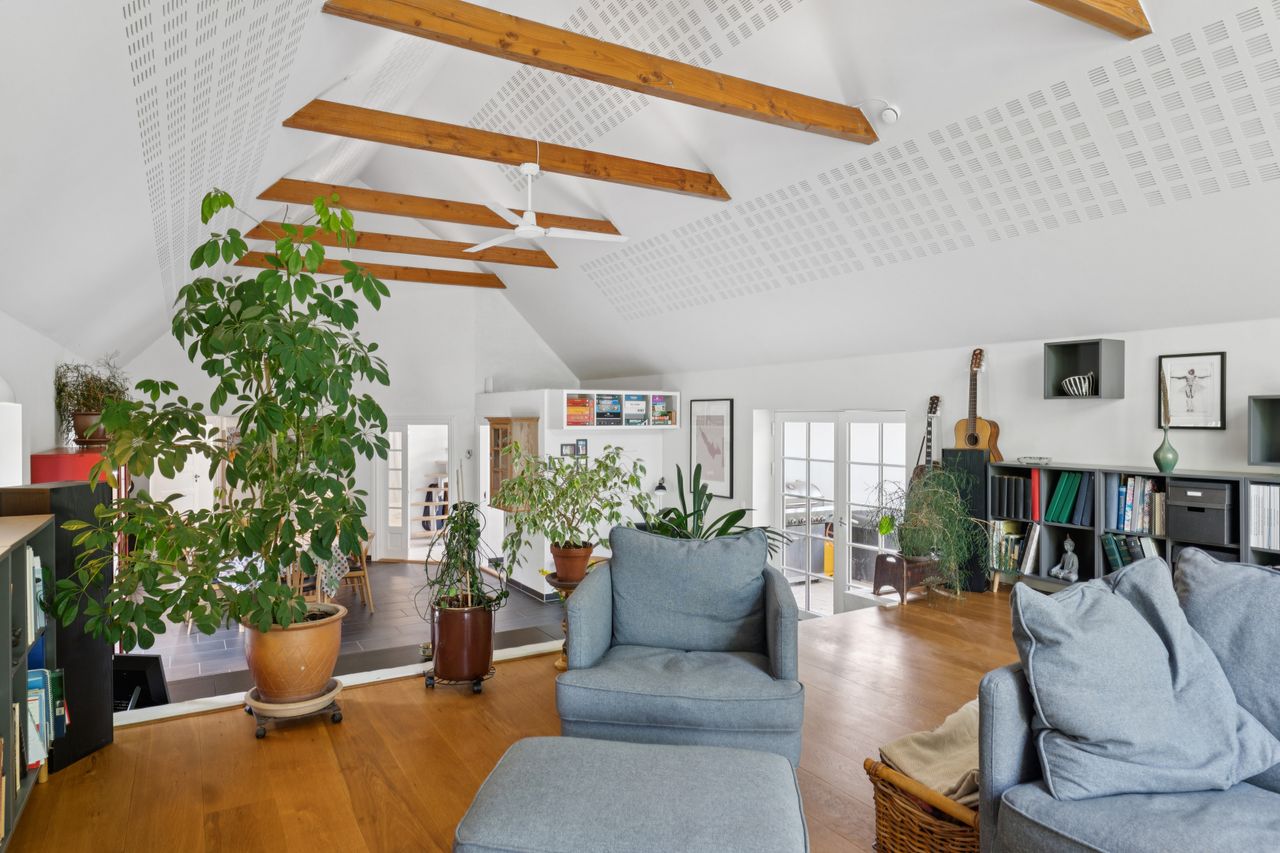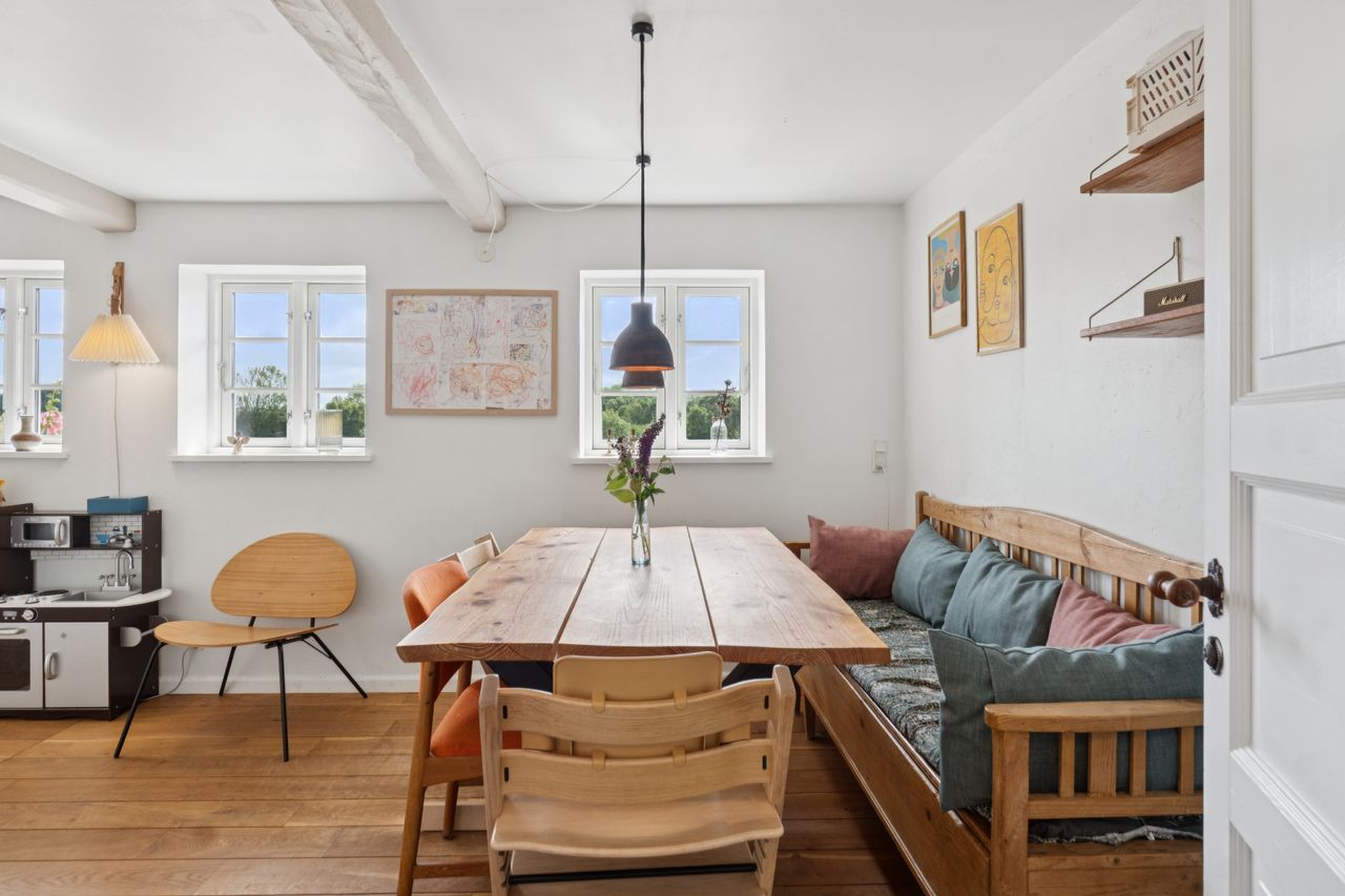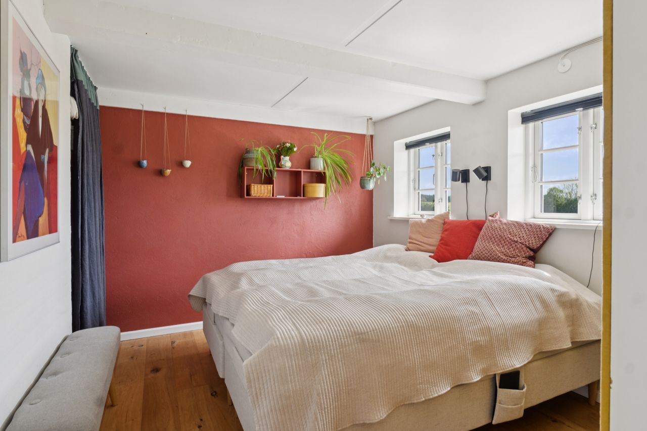 Et par trin oppe finder I den hyggelige stue med udsigt til haven og marken, mens stueplan desuden byder på endnu et åbent køkken, to badeværelser med brus, bryggers og to værelser. På første sal venter to store værelser og en stor opholdsstue med fleksible indretningsmuligheder – hjemmearbejdsplads, kreativt værksted, teenagestue eller legerum.