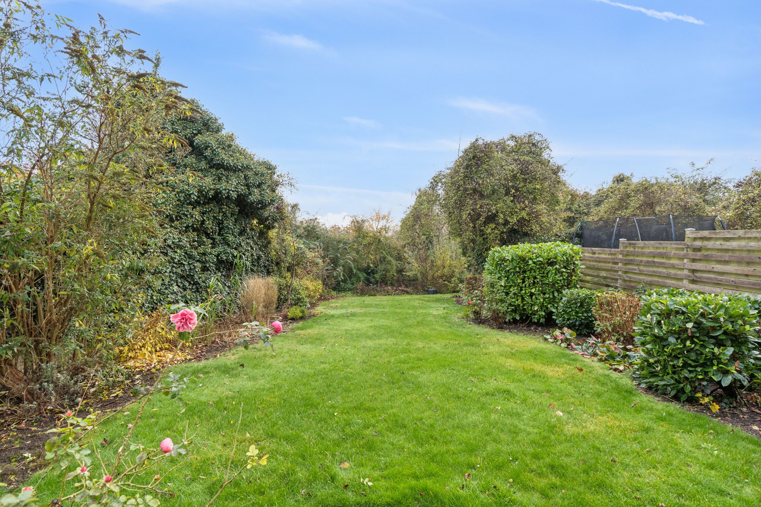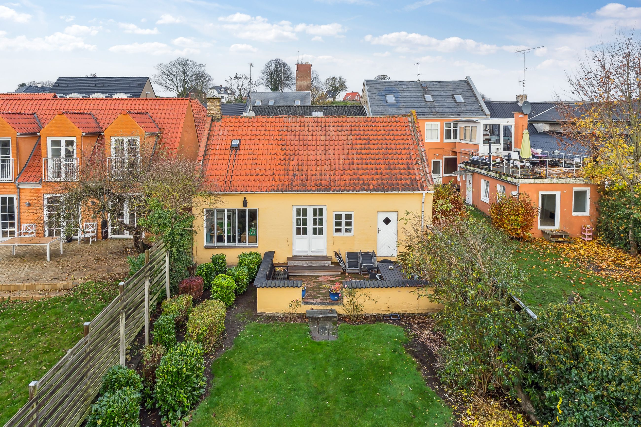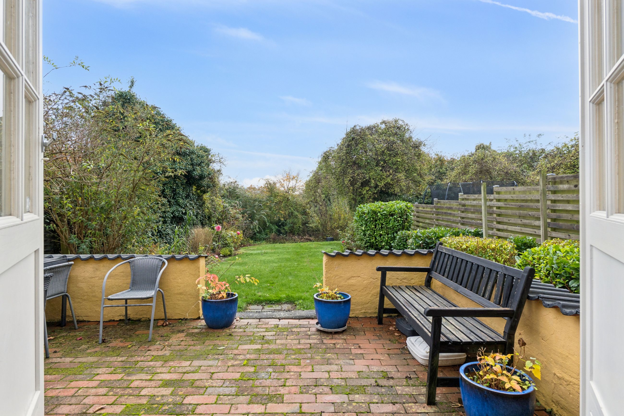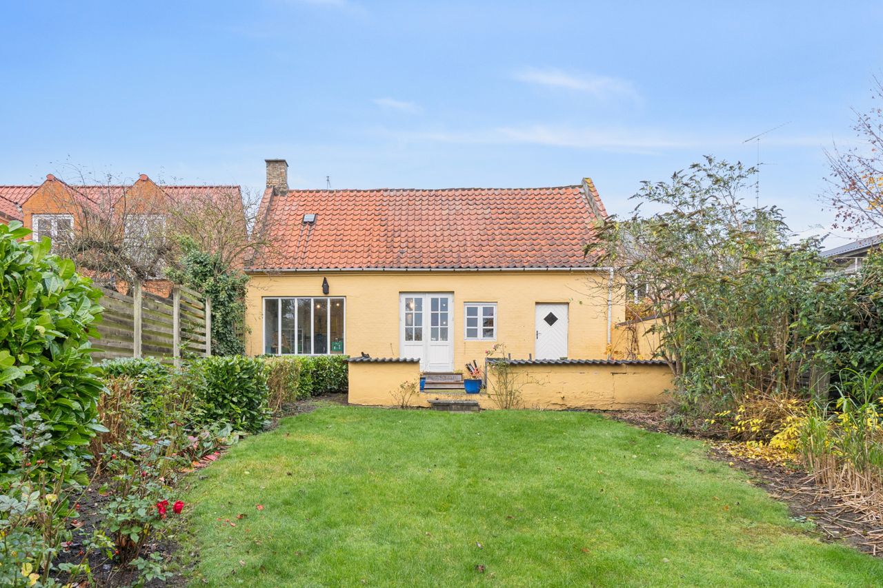 Haven er anlagt med græs og er nem at holde – perfekt til både børnefamilien og dem, der ønsker en overskuelig grund med plads til udeliv. Her er både privatliv og mulighed for at nyde de grønne omgivelser midt i byen.